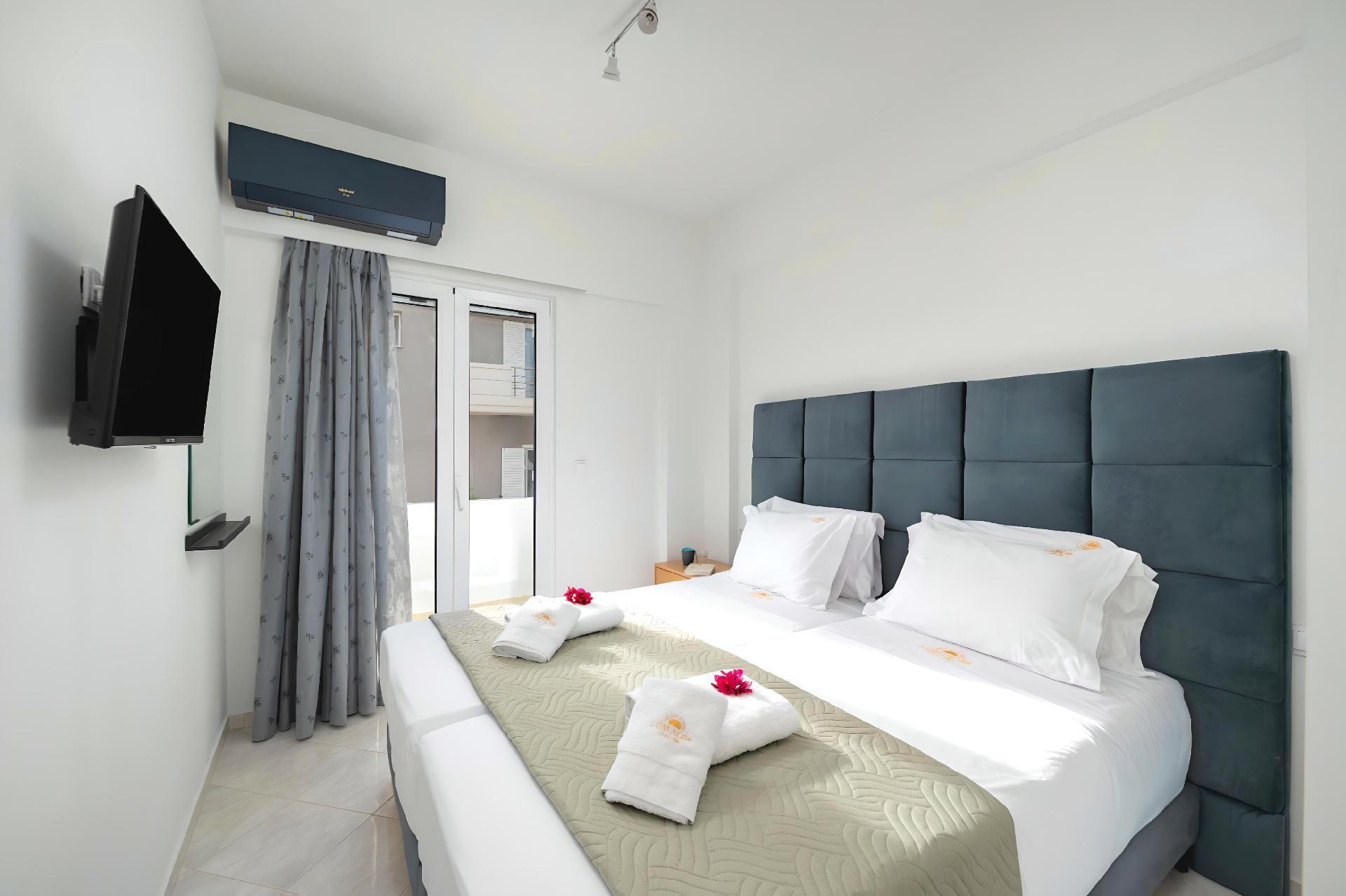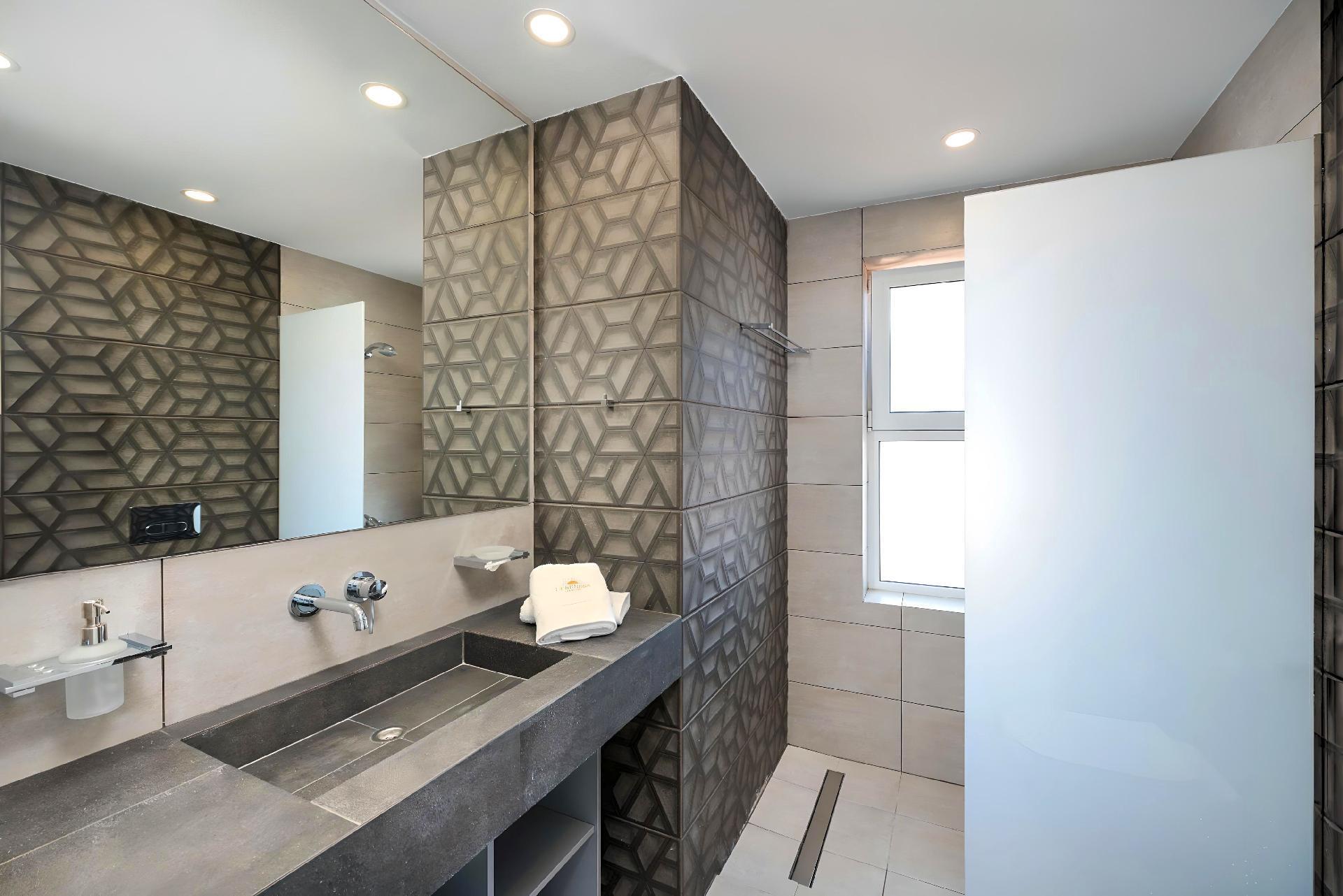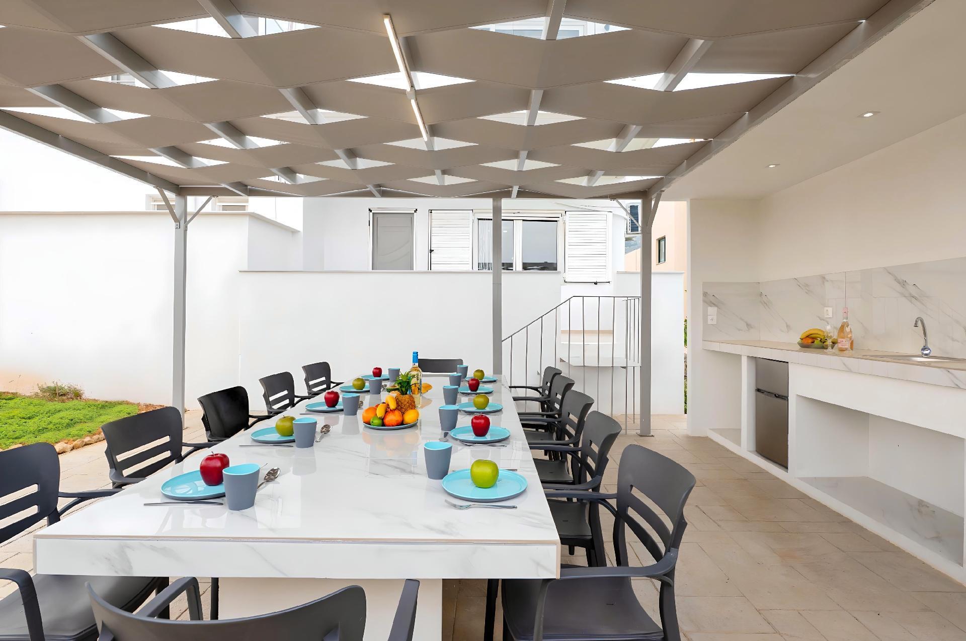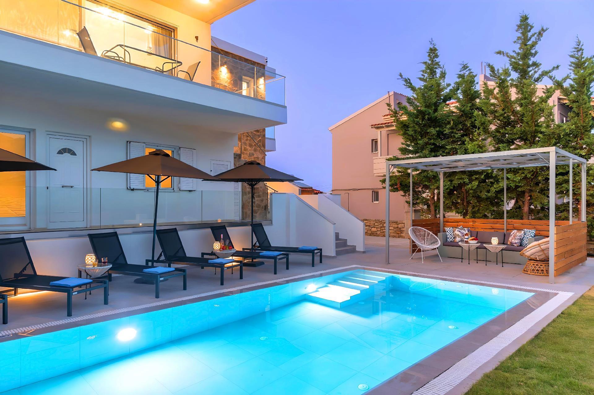 Outside, immerse yourself in the ultimate relaxation with a large swimming pool, perfect for a refreshing dip or leisurely swim. The sun terrace, adorned with comfortable sun loungers and umbrellas, invites you to bask in the warm Mediterranean sun. Enjoy your mornings with a cup of coffee or unwind in the evenings at the outdoor sitting area, ideal for savoring the gentle sea breeze and scenic views.