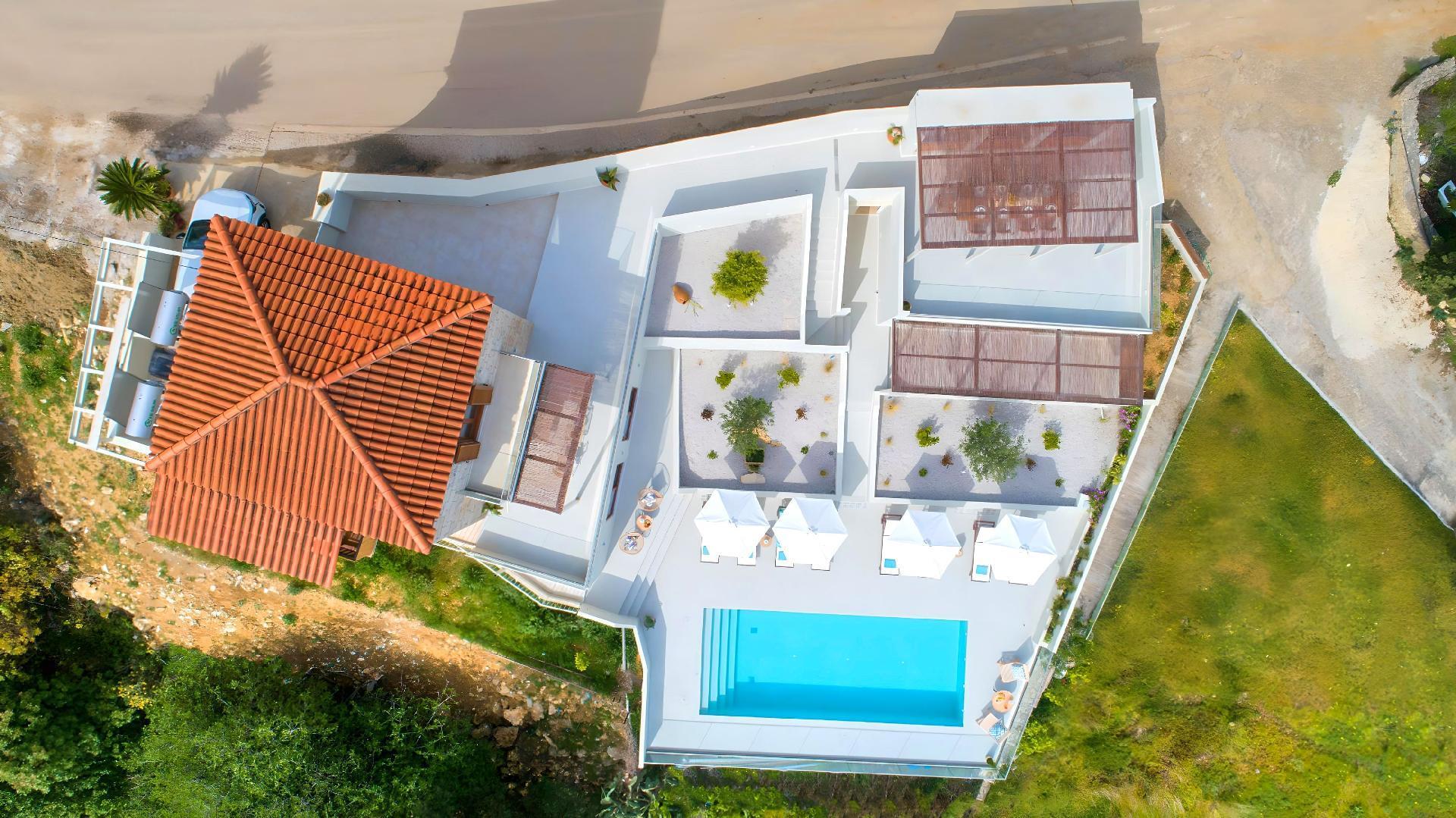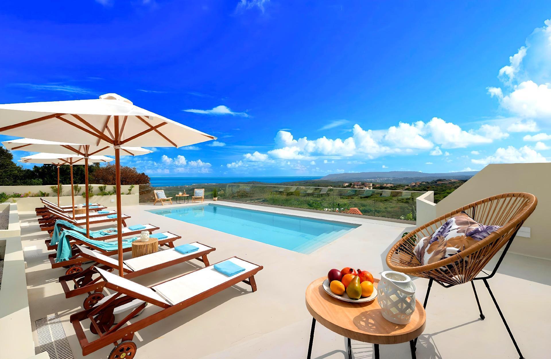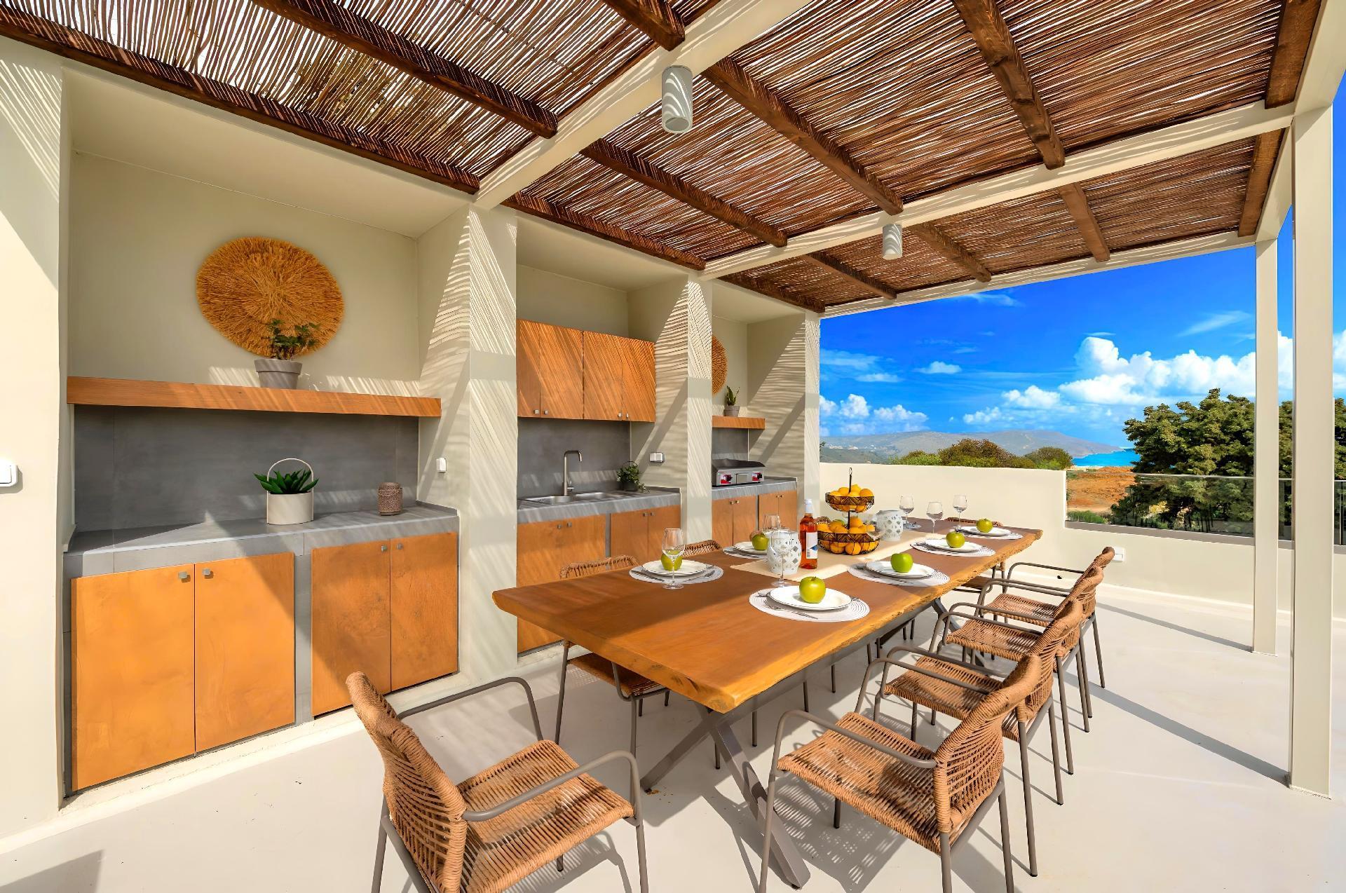The exterior of Soluna Villa is just as impressive as its interior. The highlight is undoubtedly the large swimming pool, available for sole use by the guests. It's surrounded by a spacious terrace equipped with sun lounges, ideal for days spent soaking up the Greek sun. The BBQ area is perfect for those who enjoy outdoor dining and is a great place to gather friends or family for a culinary feast under the stars. The detached house layout ensures total privacy for your group, offering a personal oasis away from the hustle and bustle.