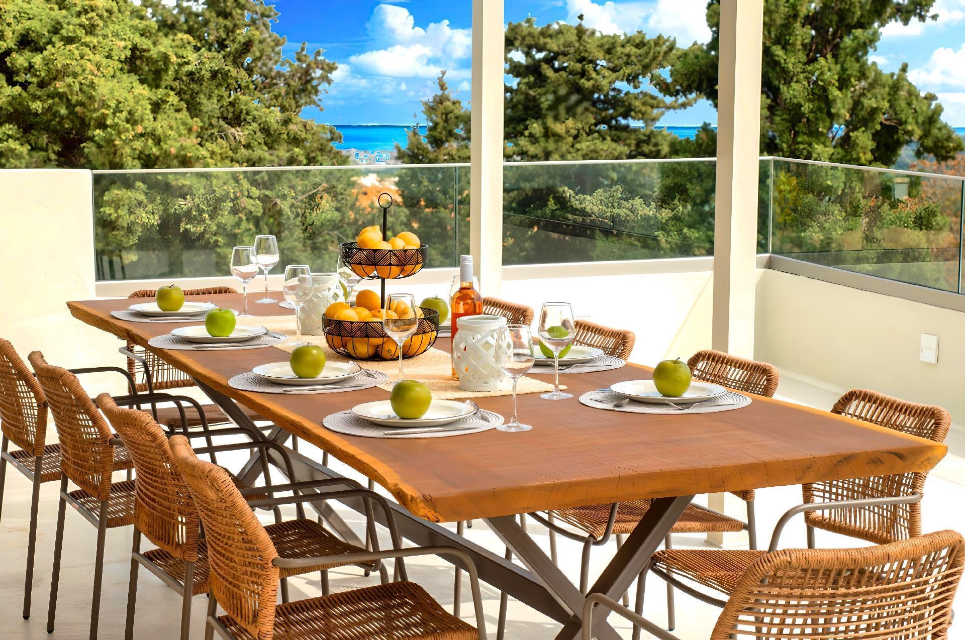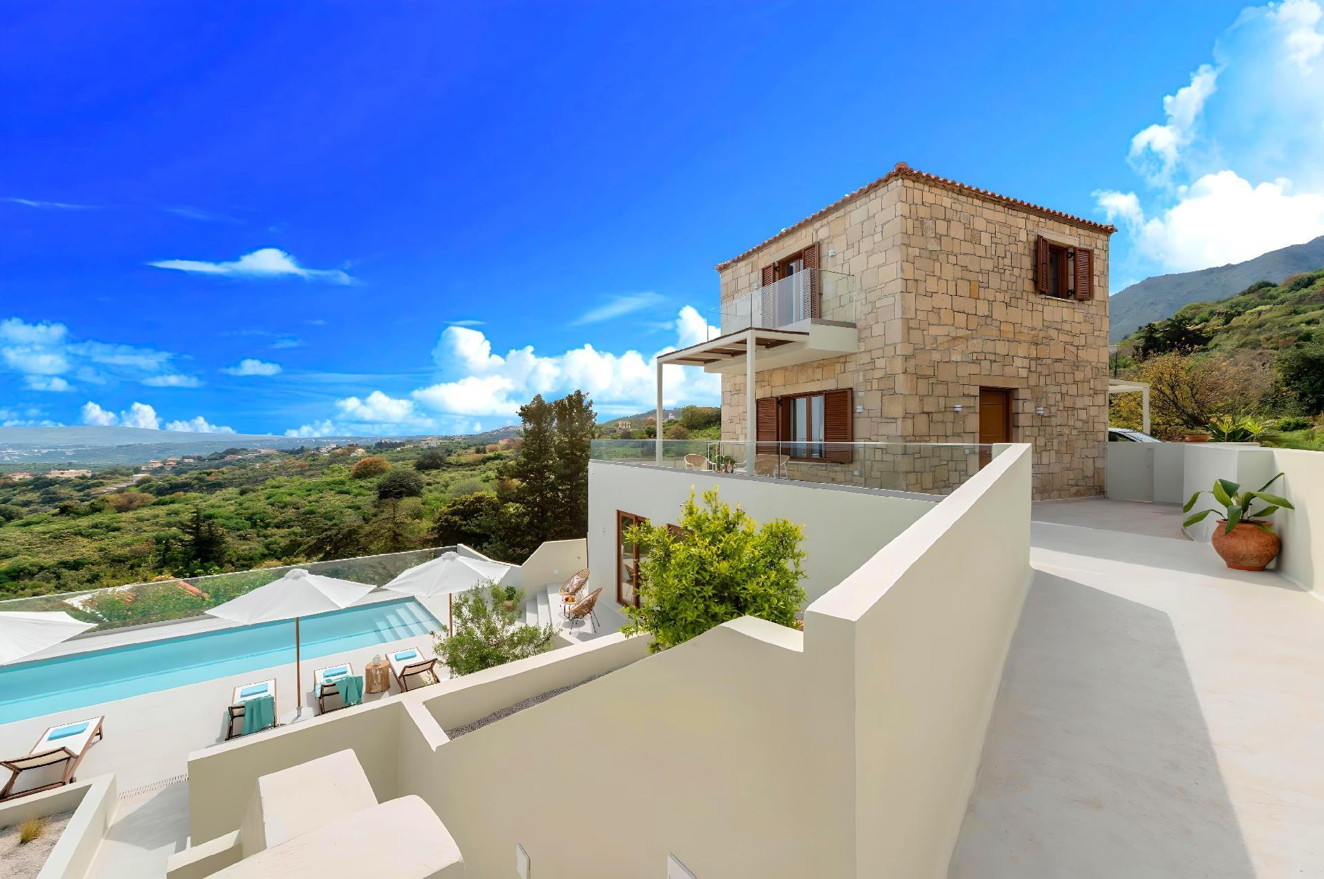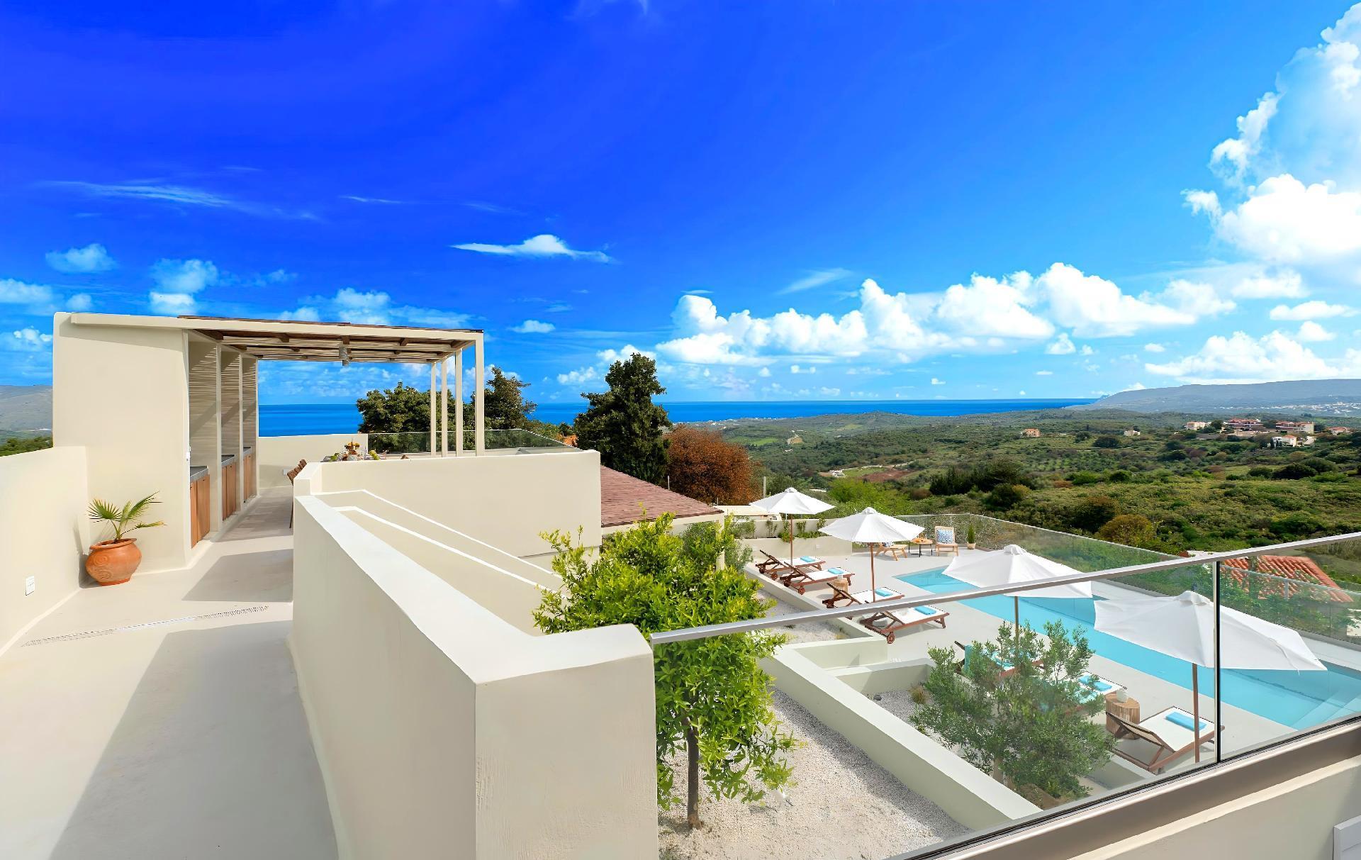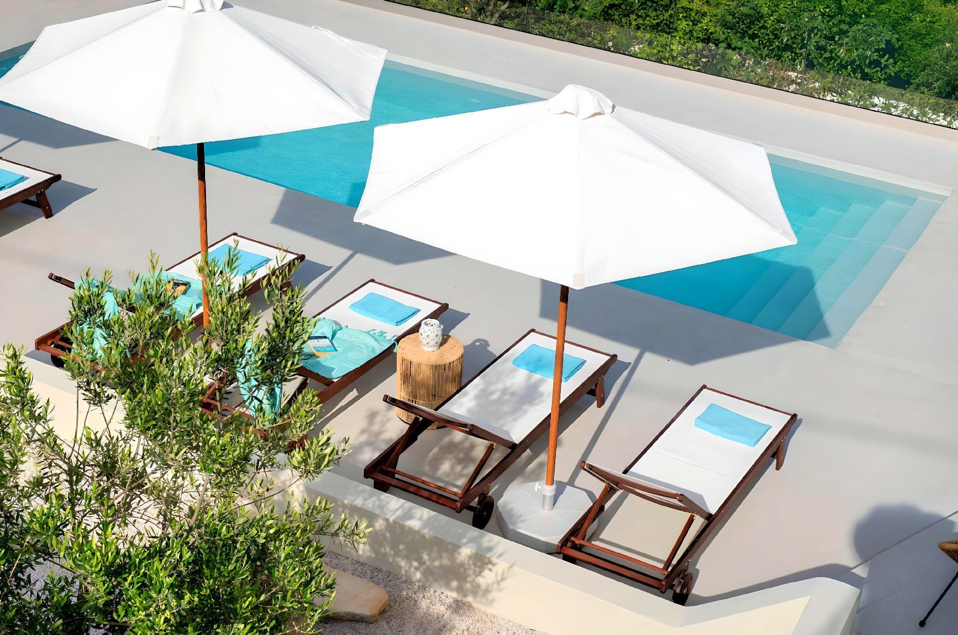 The exterior of Soluna Villa is just as impressive as its interior. The highlight is undoubtedly the large swimming pool, available for sole use by the guests. It's surrounded by a spacious terrace equipped with sun lounges, ideal for days spent soaking up the Greek sun. The BBQ area is perfect for those who enjoy outdoor dining and is a great place to gather friends or family for a culinary feast under the stars. The detached house layout ensures total privacy for your group, offering a personal oasis away from the hustle and bustle.
