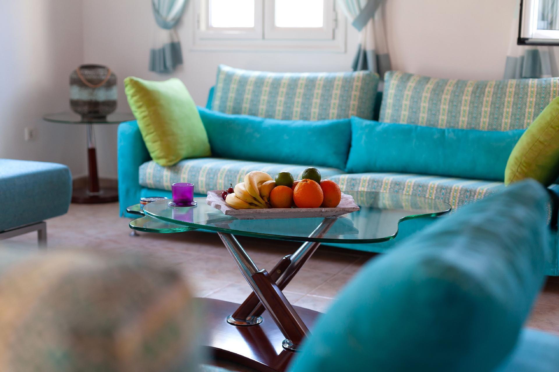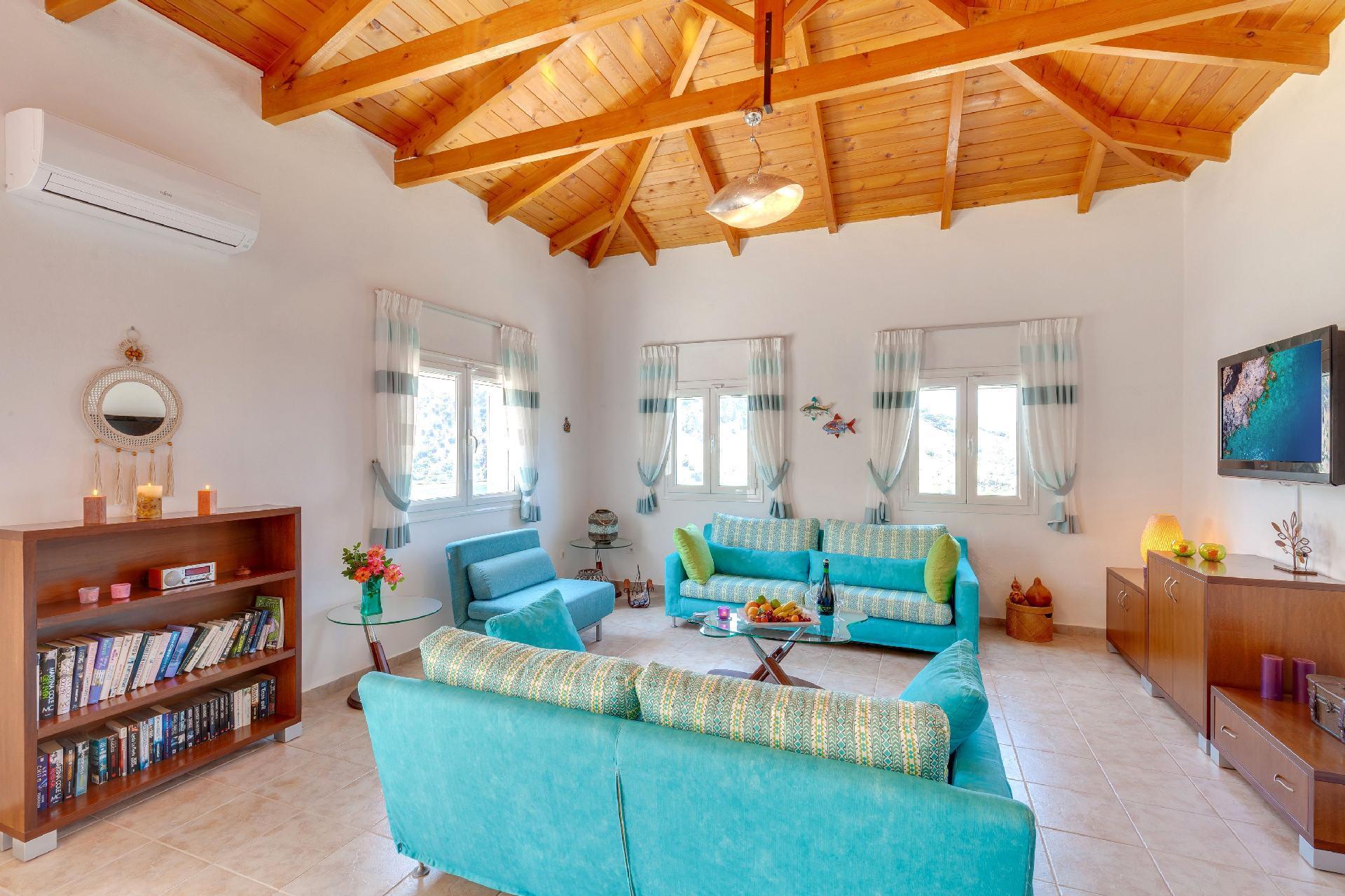 Inside, Villa Kallisti-Artemis offers a seamless blend of modern luxury and traditional elements, with décor and colors that pay homage to the Minoan period, ensuring a stay that’s both luxurious and comfortable. It boasts two cozy bedrooms on the ground floor, each equipped with spacious wardrobes, air conditioning, and smart TVs, alongside a well-appointed bathroom with a bath, washing machine, and hairdryer. The upper floor features a spacious living/dining area and a fully equipped kitchen, highlighting the villa's commitment to absolute relaxation and quality living.