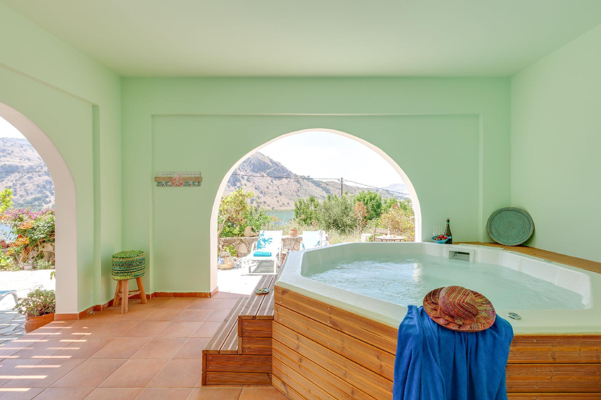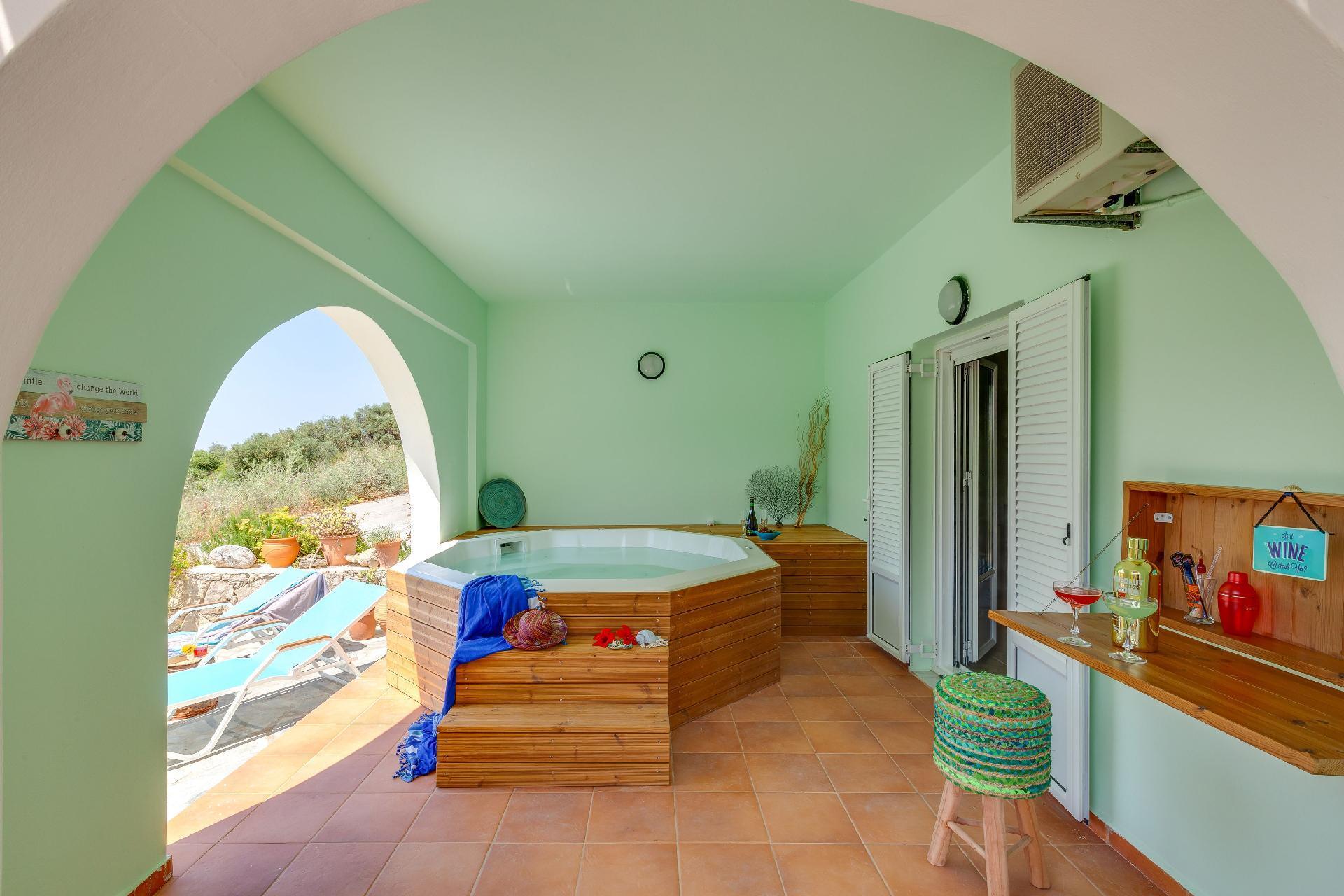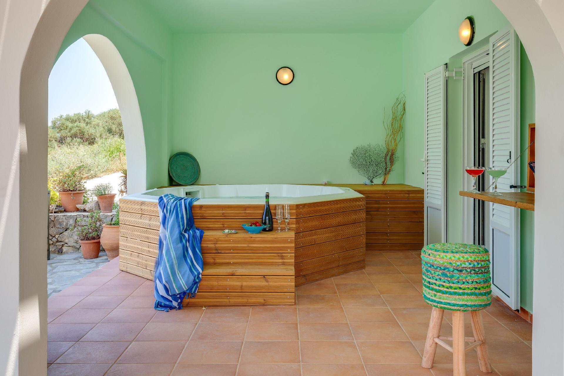 The outdoor area of Villa Kallisti-Artemis is a testament to the natural beauty that encases it, featuring a meticulously landscaped garden adorned with Mediterranean herbs, a mini pool-jacuzzi, and sun loungers & tables for the utmost relaxation. The garden’s arches and the covered veranda offer magnificent views of the lake and sea—all designed to immerse guests in an environment of serenity and natural splendor.