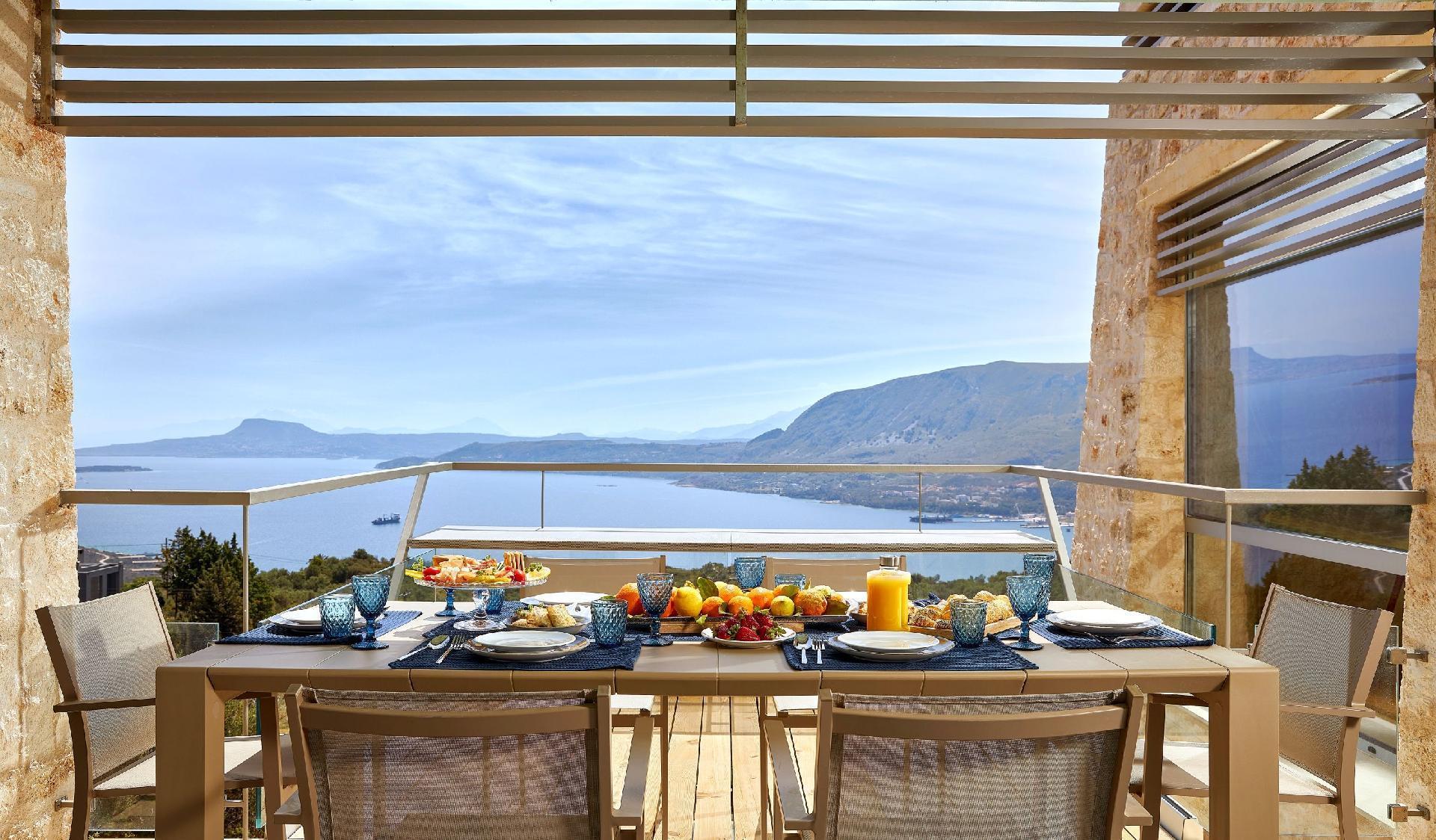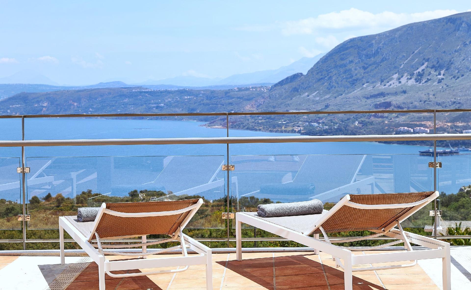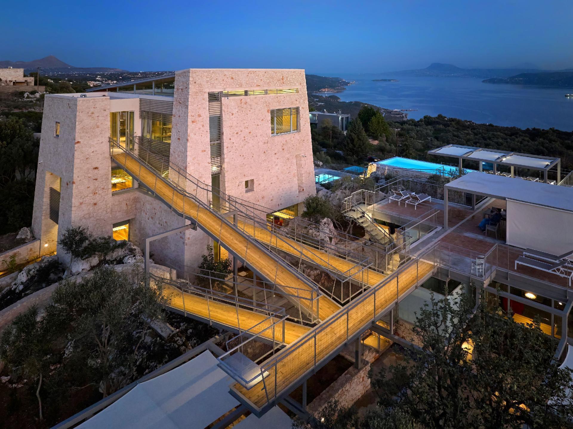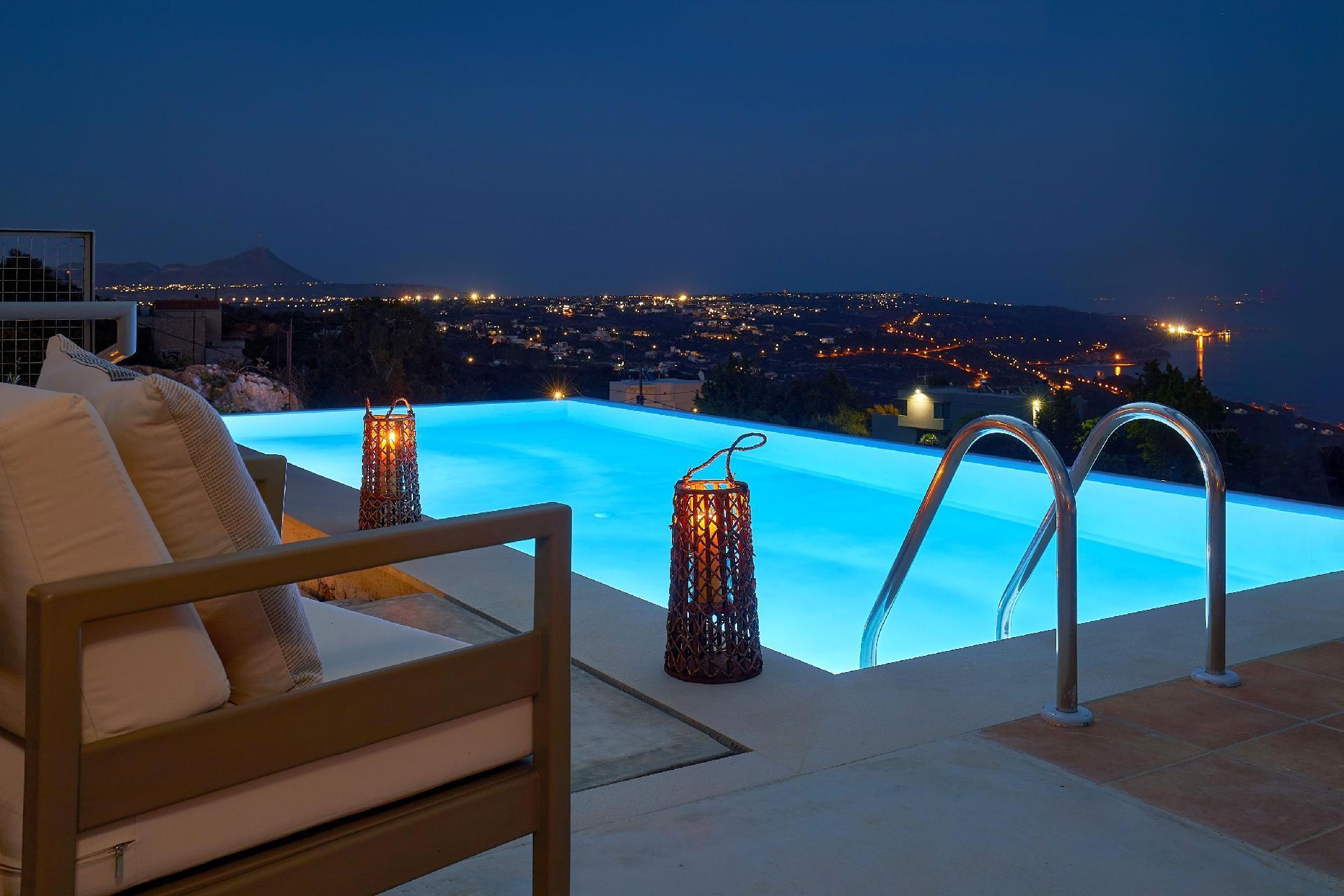 Enjoy the beautifully landscaped outdoor entertainment area with two heated pools, a fully equipped outdoor kitchen, a BBQ, a shaded dining area, and sun loungers, all with sweeping views over Souda Bay.