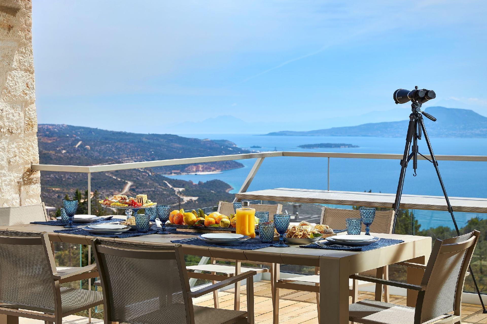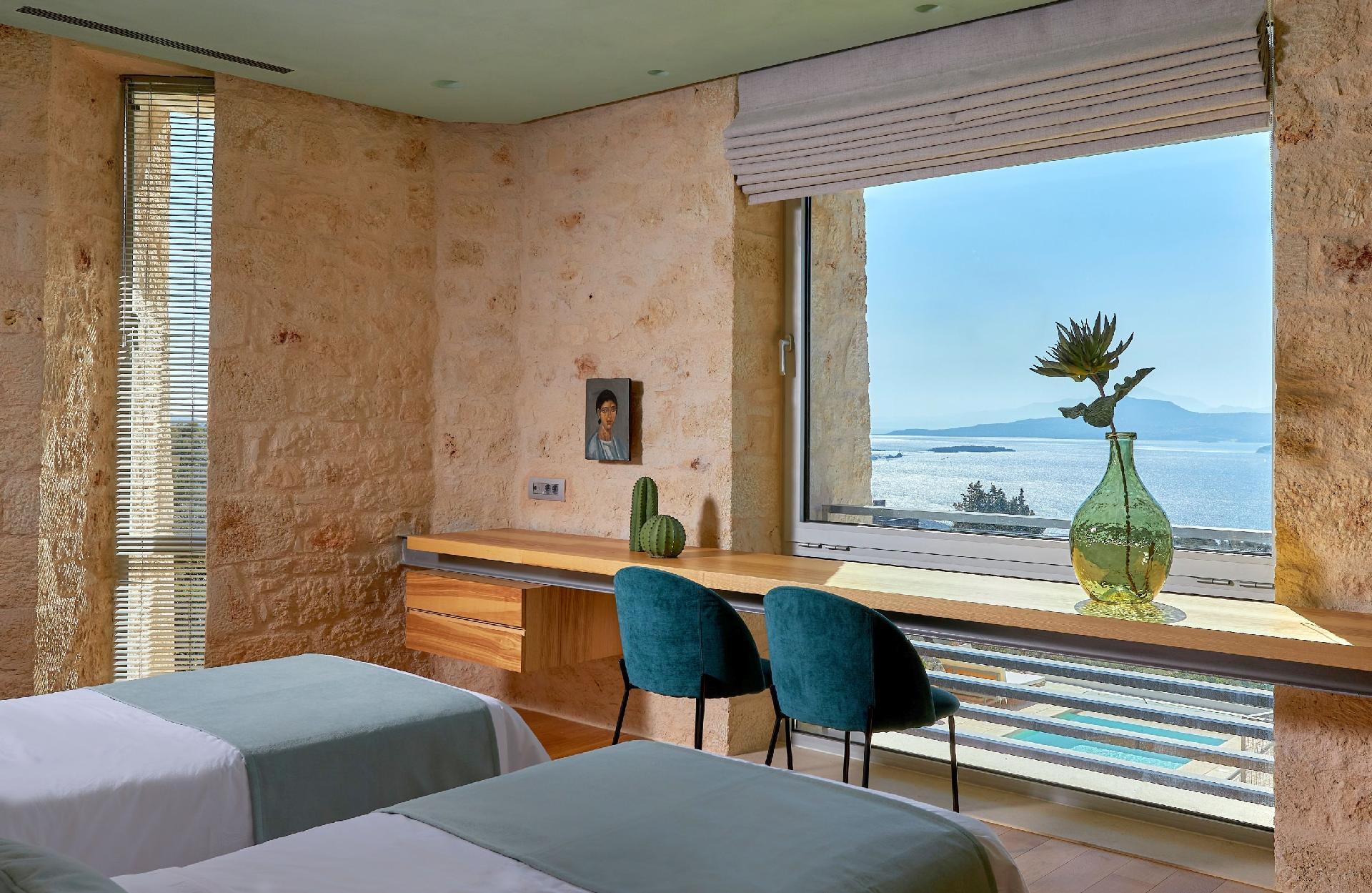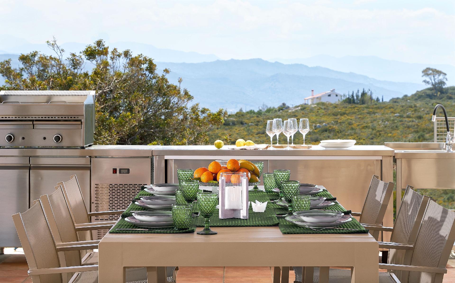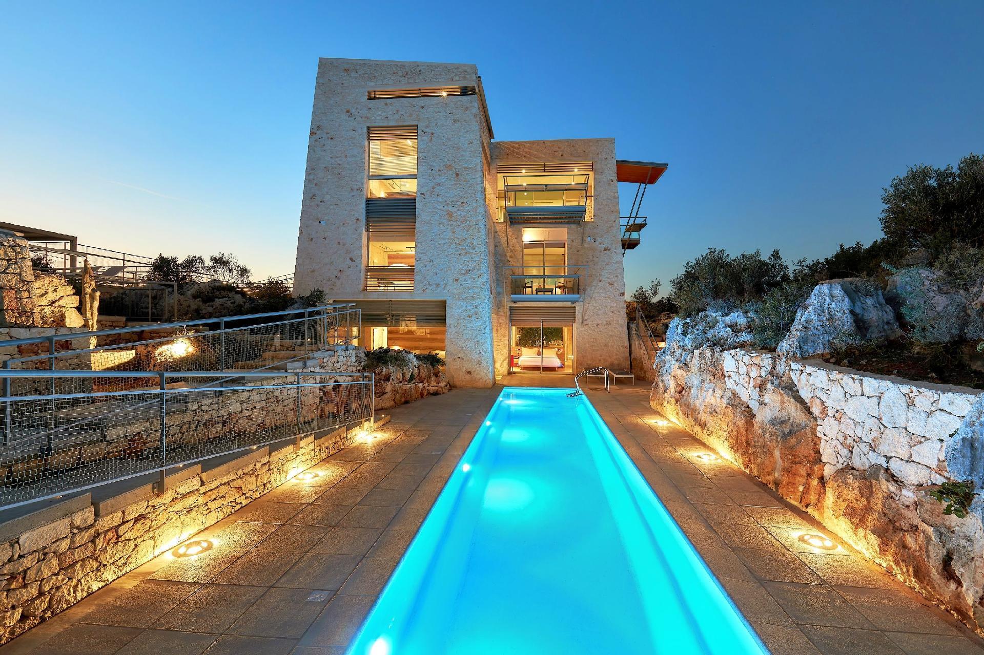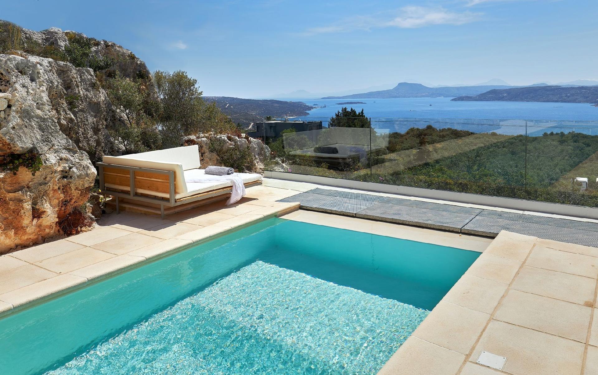 Enjoy the beautifully landscaped outdoor entertainment area with two heated pools, a fully equipped outdoor kitchen, a BBQ, a shaded dining area, and sun loungers, all with sweeping views over Souda Bay.