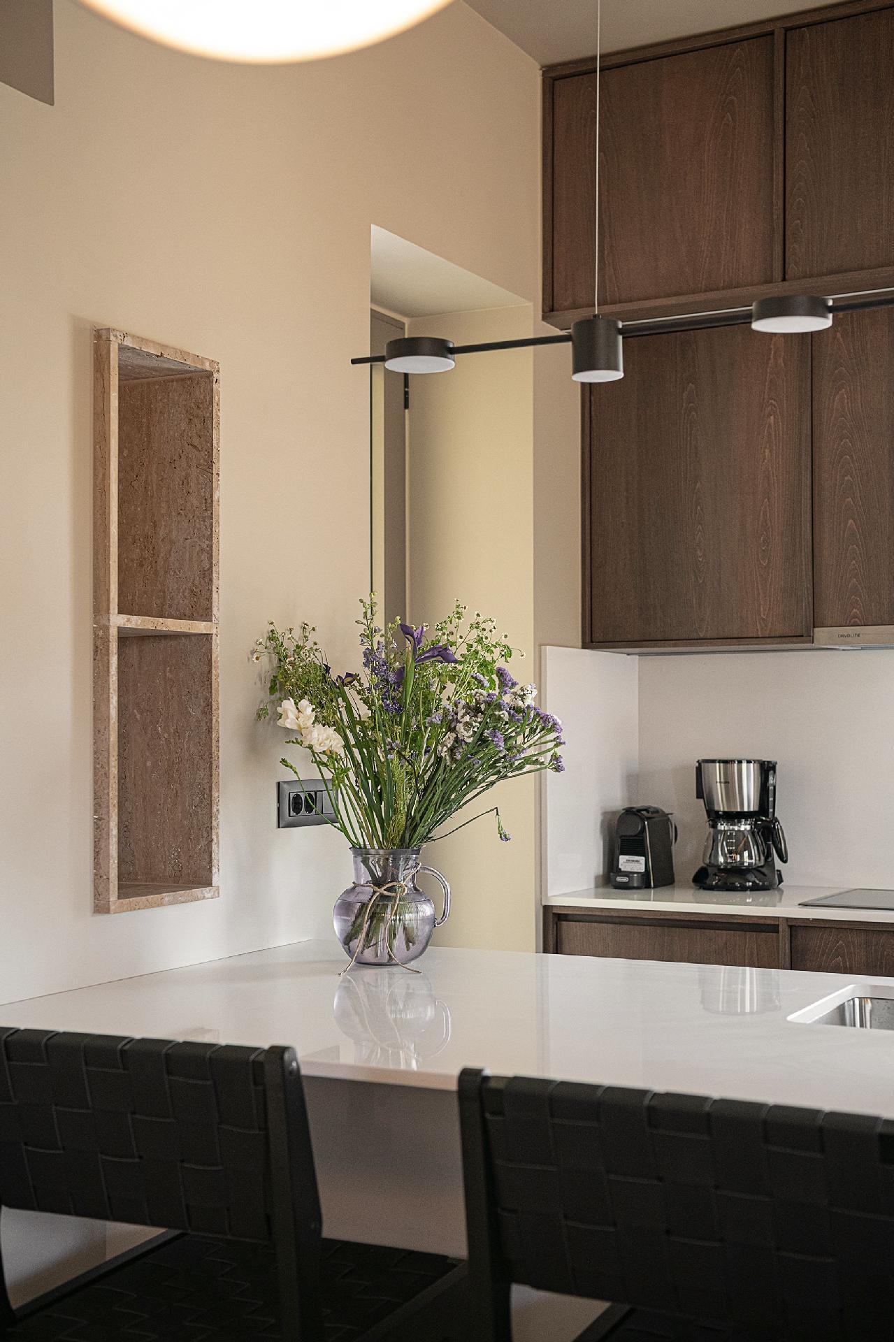 The fully equipped kitchen includes an oven, stovetop, dishwasher, espresso machine, toaster, and everything you need for slow, leisurely meals. Gather around the indoor dining table for 6–8 or step outside to dine under the stars.Living AreaWarm and minimal, the living room invites you to unwind. With a sleek fireplace, cozy sofa corner, lounge chairs, TV, and open views of the pool, it’s the perfect space to reconnect and relax.