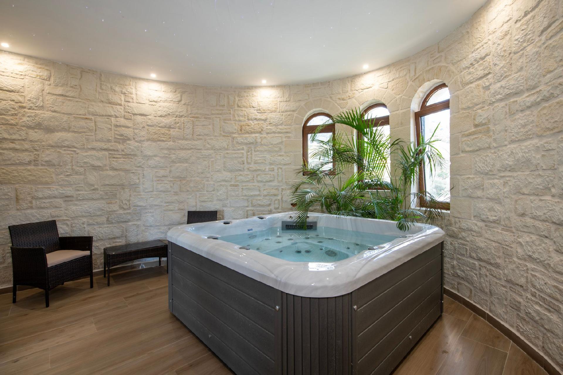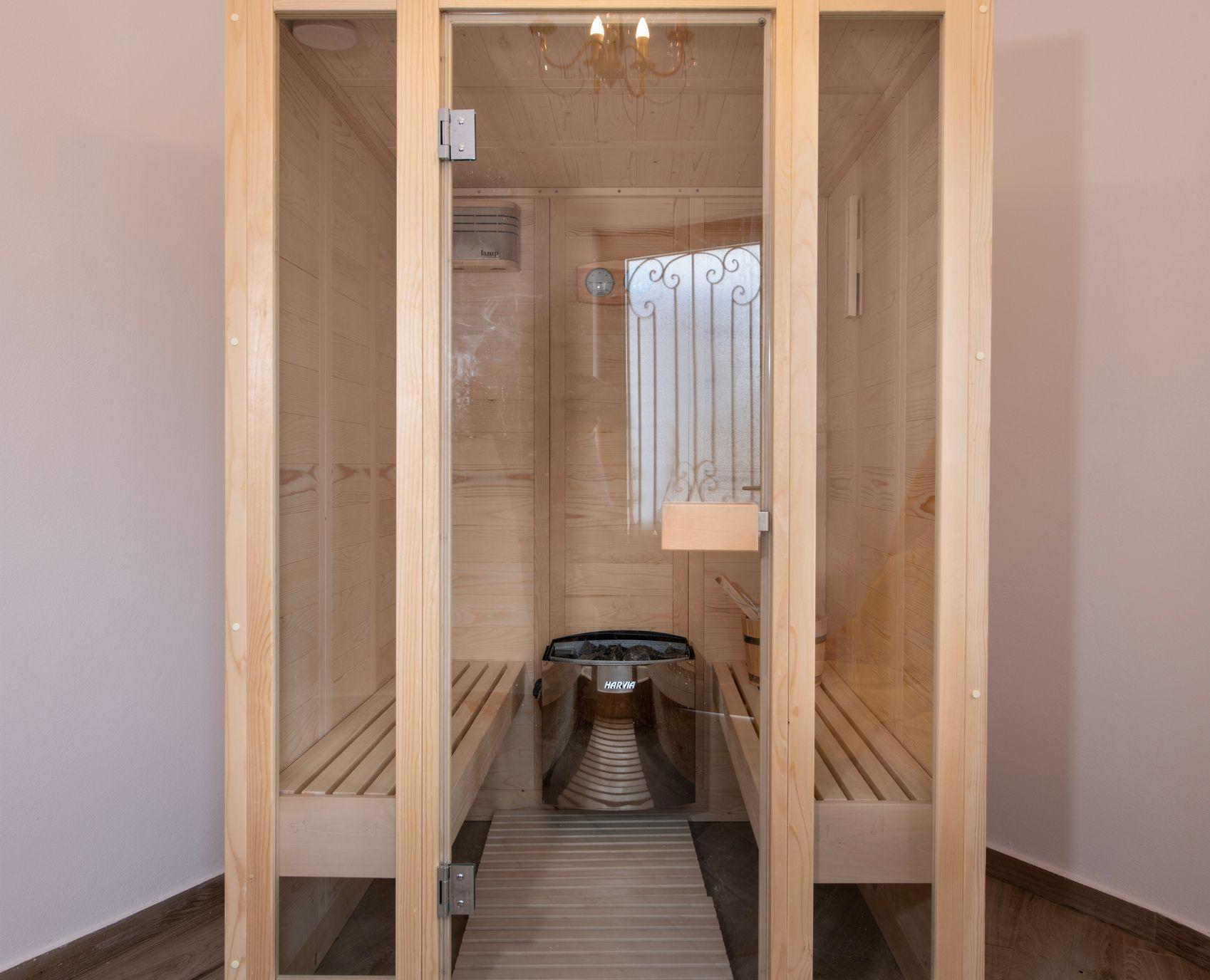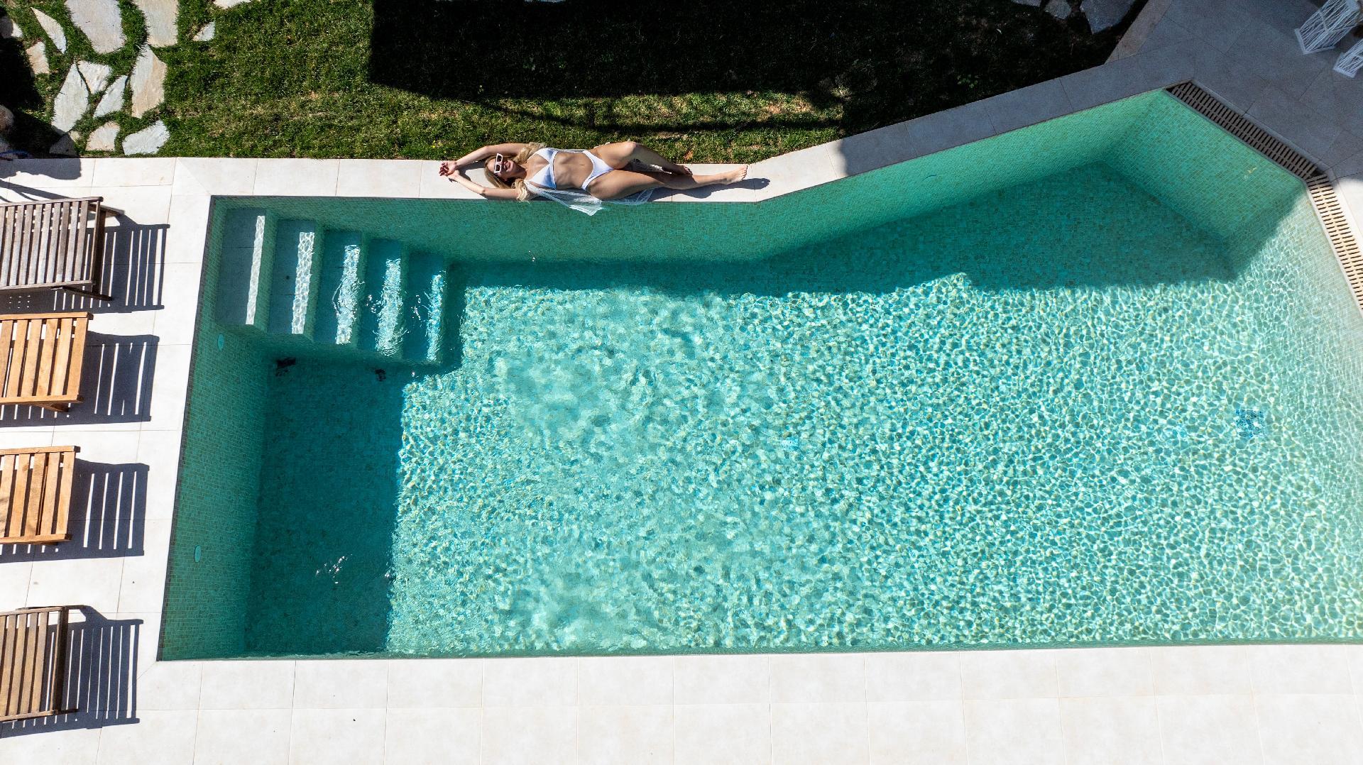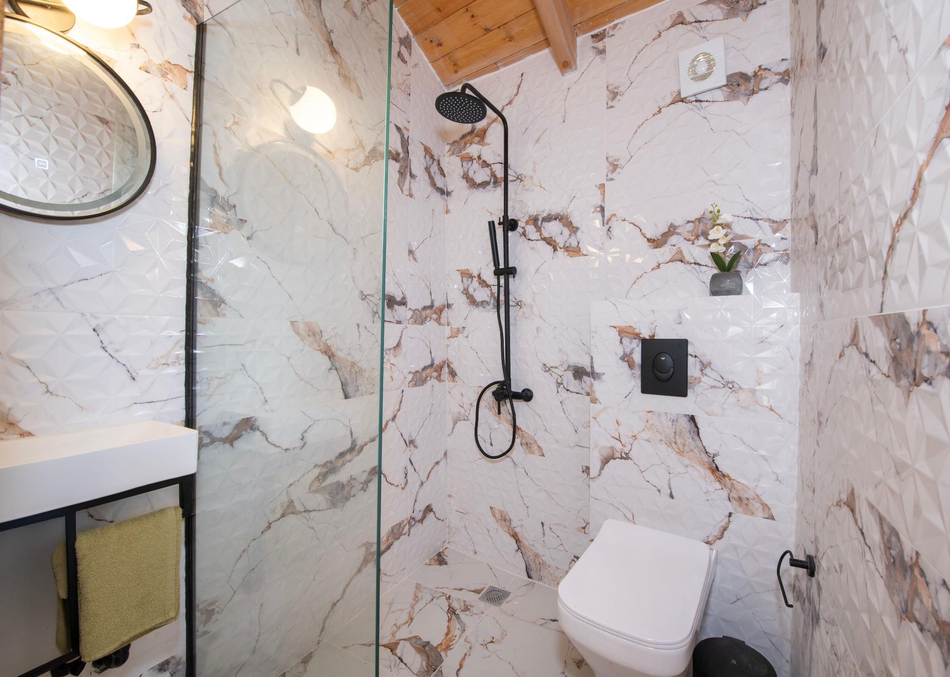 Step inside to discover a dedicated yoga area with mats, a jacuzzi, a sauna, and a bathroom with a shower. On the first floor, the open-plan living room with a 55’’ Smart TV and sea views connects to a fully equipped kitchen, a dining area, and a WC. A bedroom with a queen-size bed, sofa bed, and an ensuite bathroom. The best spot on this floor is the balcony with a swimming pool. The second floor hosts another bedroom with a queen-size bed, a sofa bed, an ensuite bathroom with a shower, and a balcony overlooking the sea, while the lower floor is like an apartment, including a fully equipped kitchen, a third bedroom, and a bathroom with a shower.