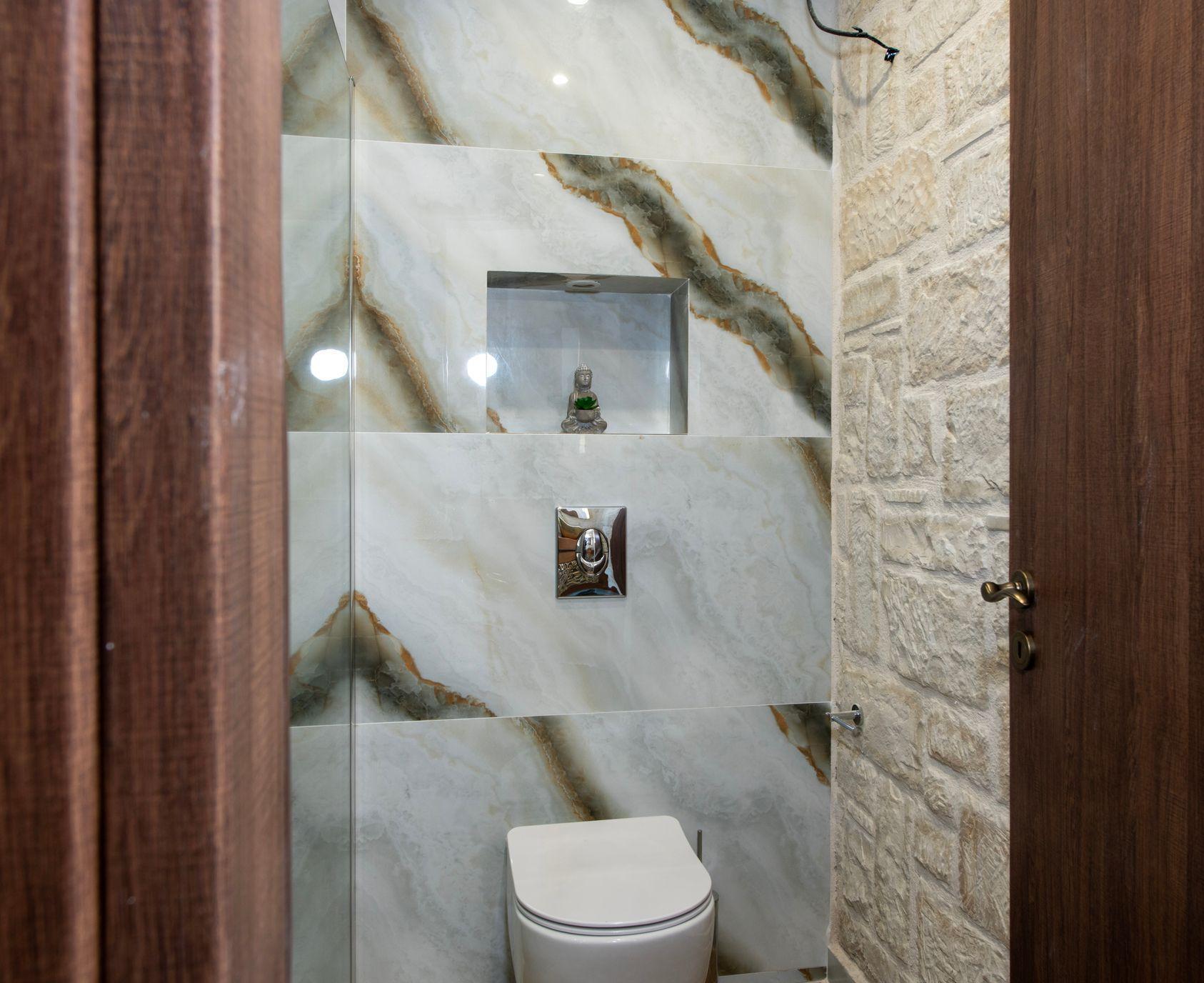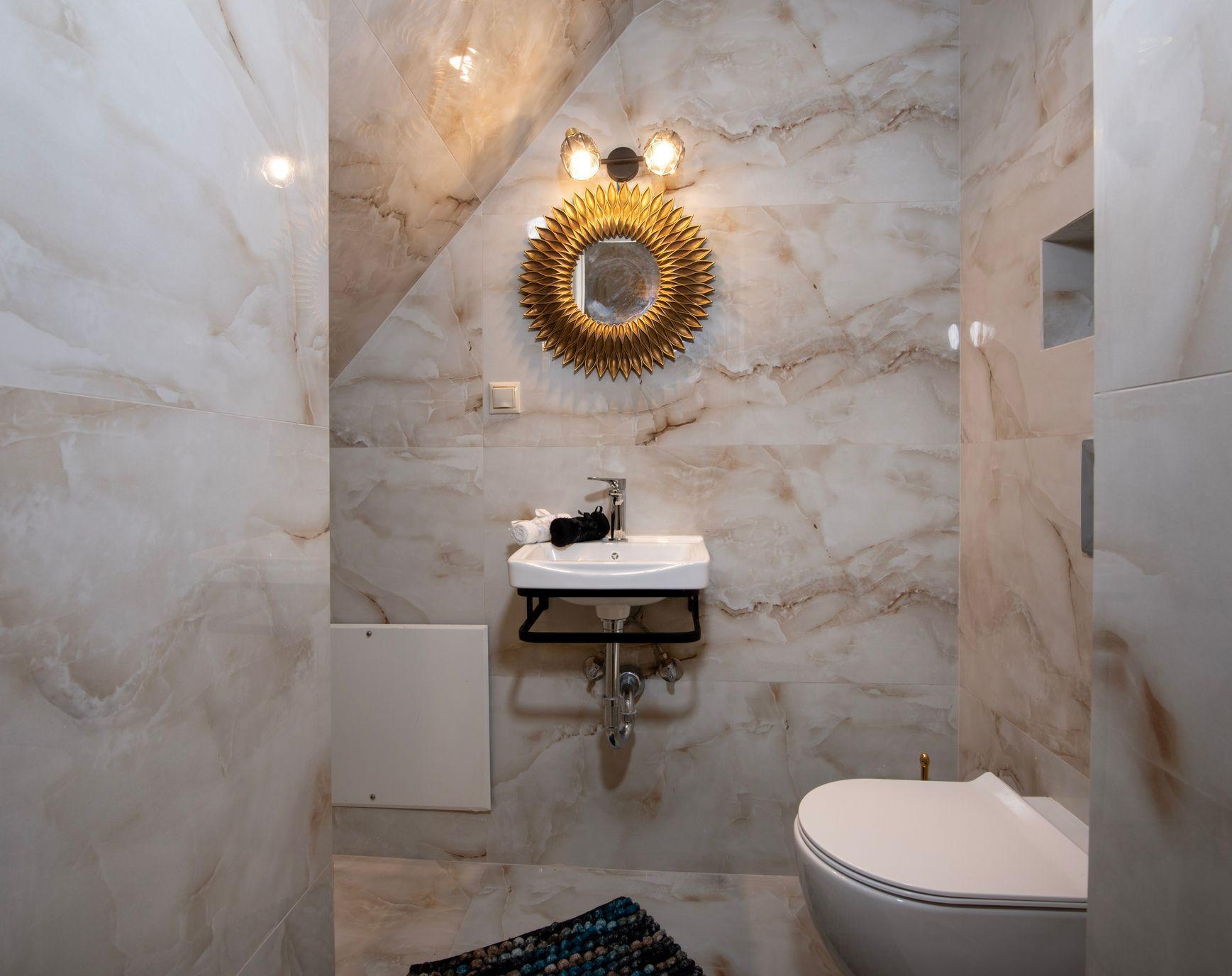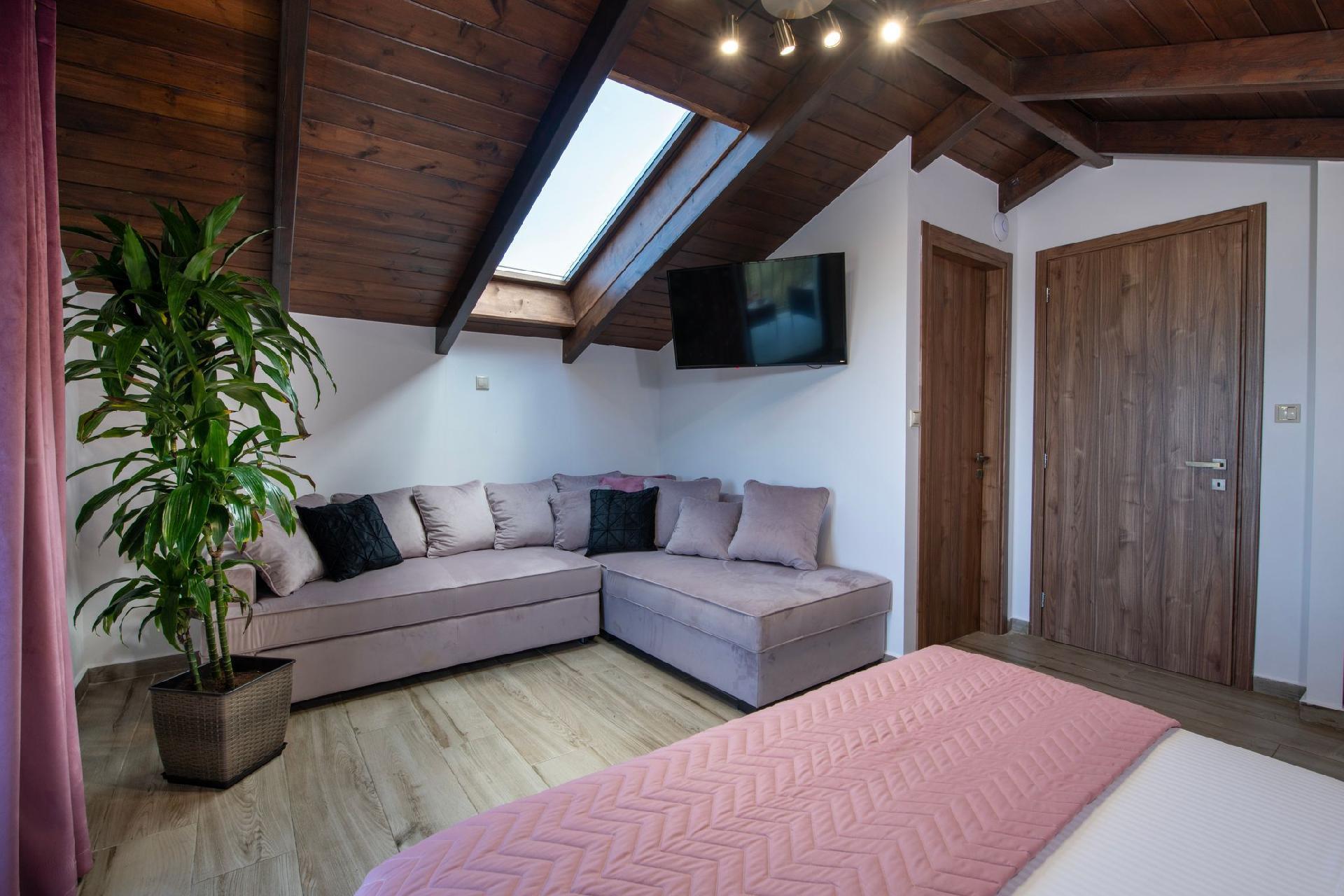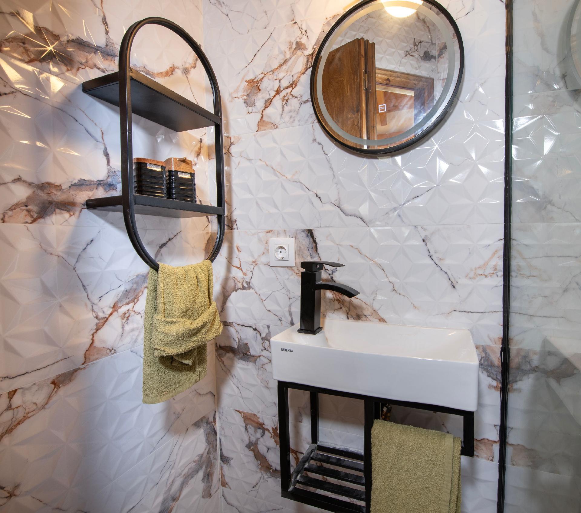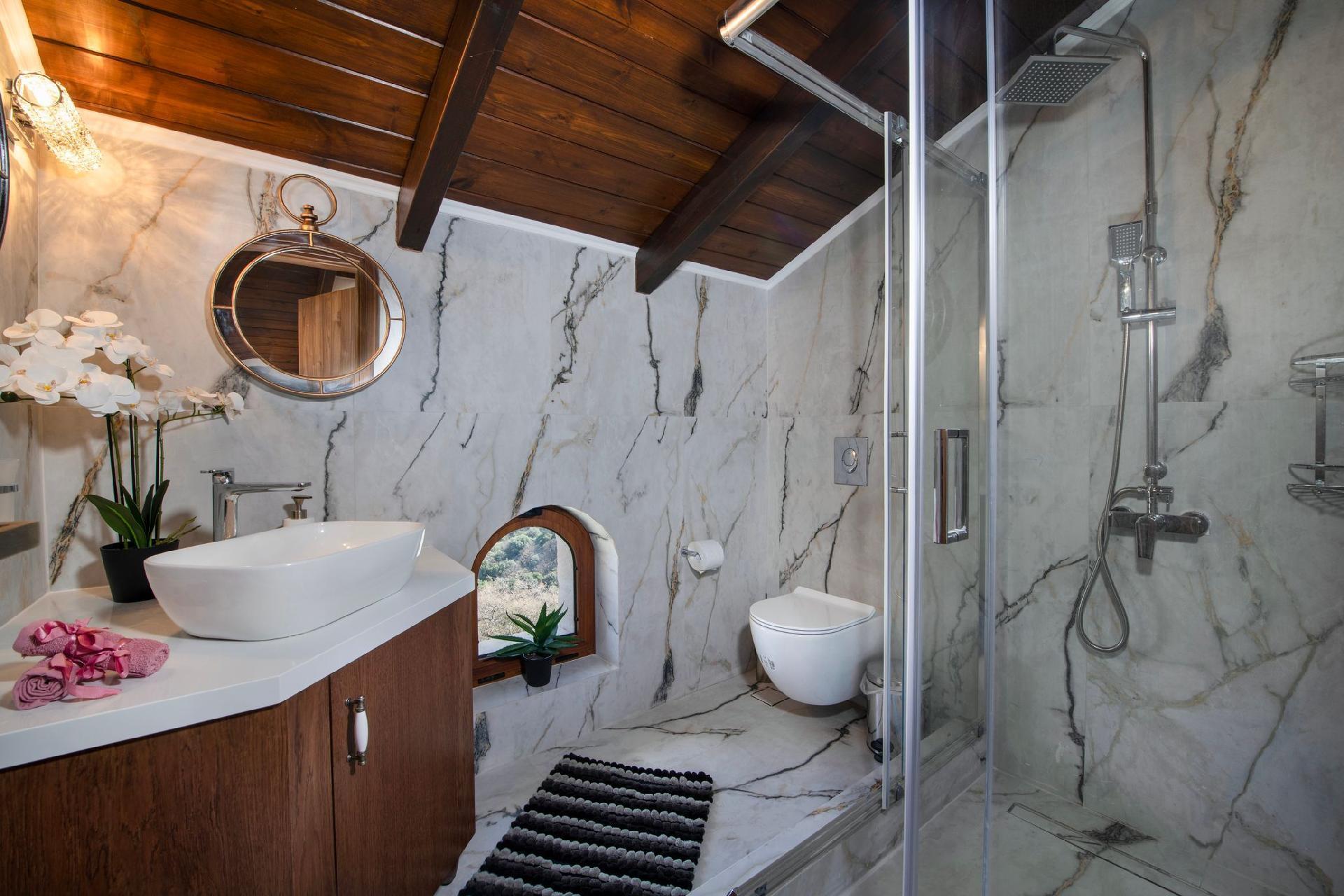 Step inside to discover a dedicated yoga area with mats, a jacuzzi, a sauna, and a bathroom with a shower. On the first floor, the open-plan living room with a 55’’ Smart TV and sea views connects to a fully equipped kitchen, a dining area, and a WC. A bedroom with a queen-size bed, sofa bed, and an ensuite bathroom. The best spot on this floor is the balcony with a swimming pool. The second floor hosts another bedroom with a queen-size bed, a sofa bed, an ensuite bathroom with a shower, and a balcony overlooking the sea, while the lower floor is like an apartment, including a fully equipped kitchen, a third bedroom, and a bathroom with a shower.