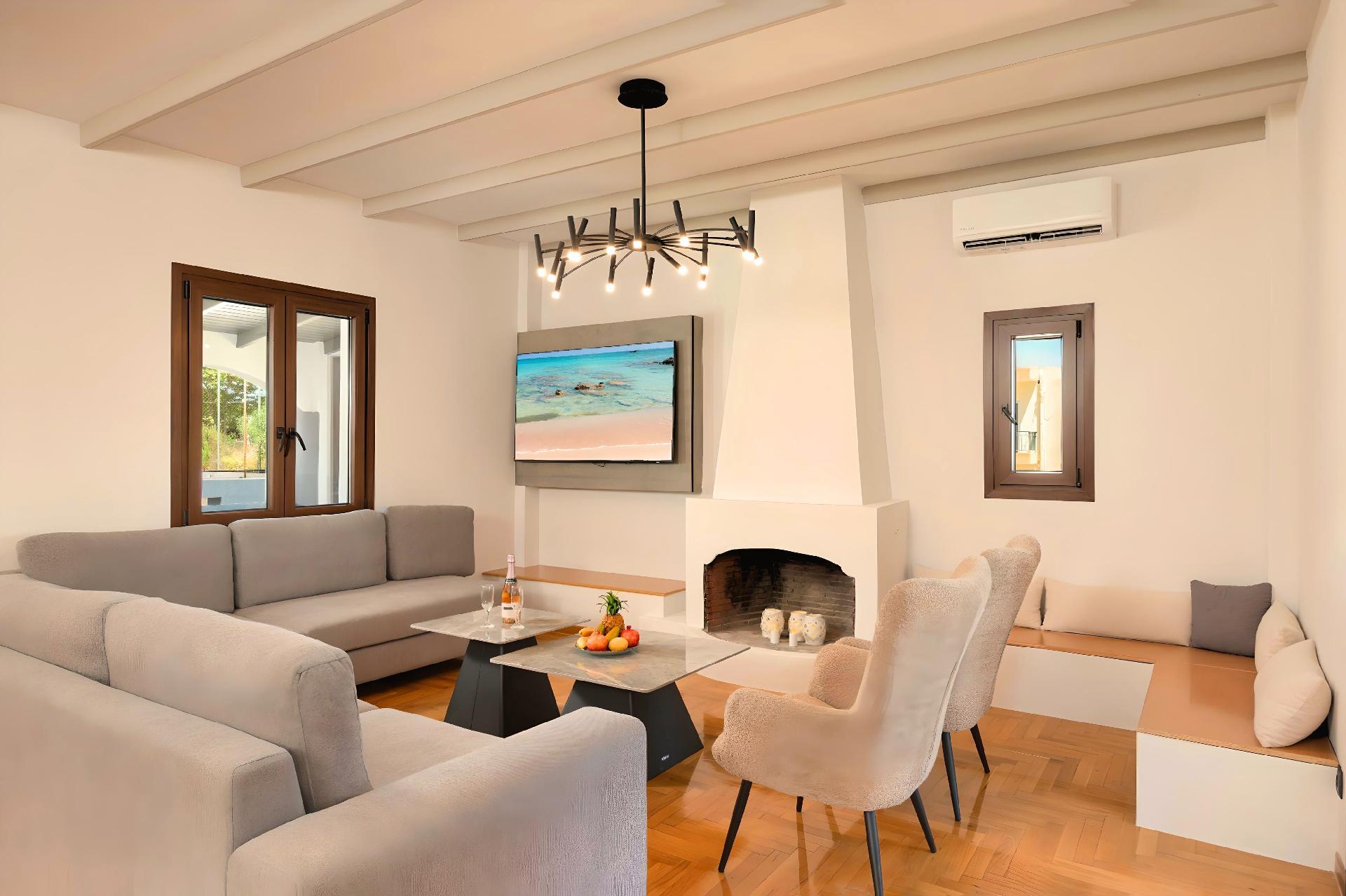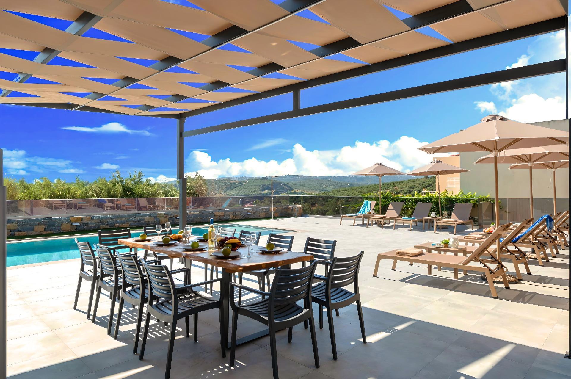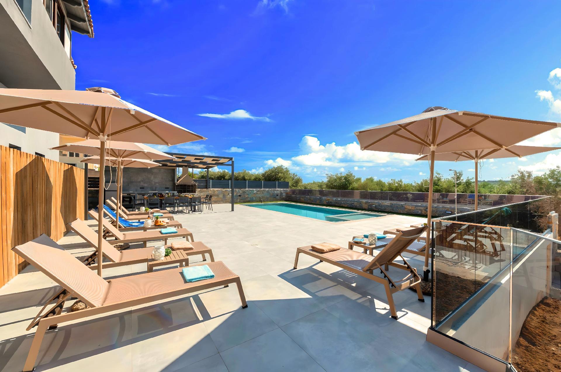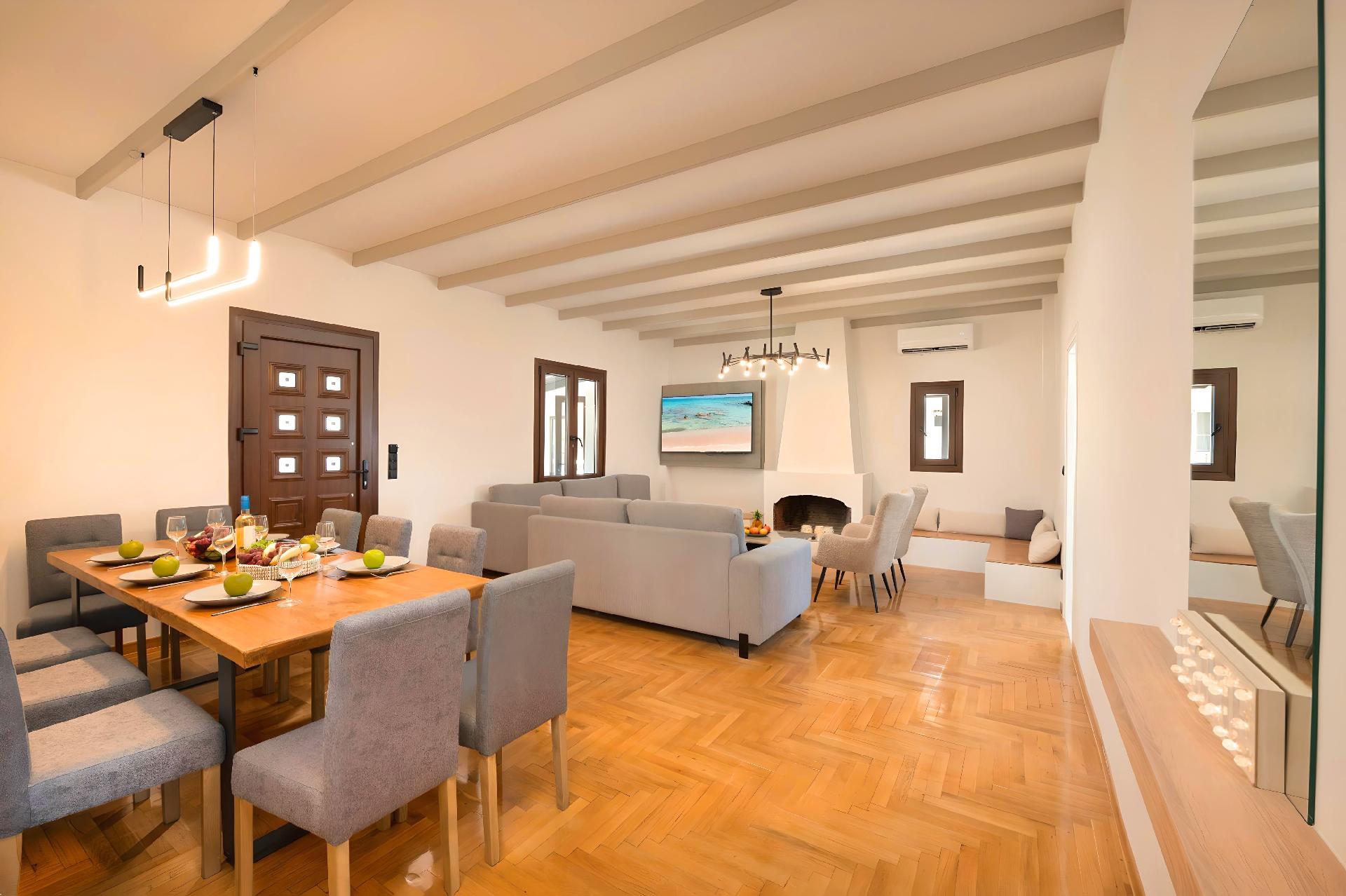 Inside, the holiday house is equipped with essential comforts to ensure a pleasant stay. It features five spacious bedrooms, tailored to provide restful nights for every guest. The house encompasses two well-appointed bathrooms, each with a shower, catering to the needs of a large group with ease. Revel in the convenience of a fully equipped kitchen, including a dishwasher, a coffee machine for capsules/pods, and an electric kettle. The living area, adorned with a smart TV, offers a cozy spot for entertainment or relaxation, complemented by air conditioning available throughout the house to keep you cool during those warm Kretan days.