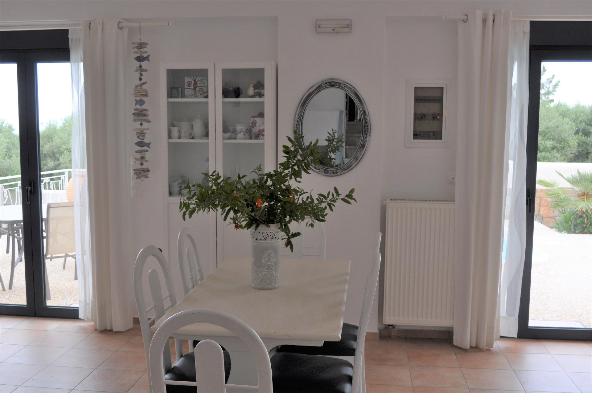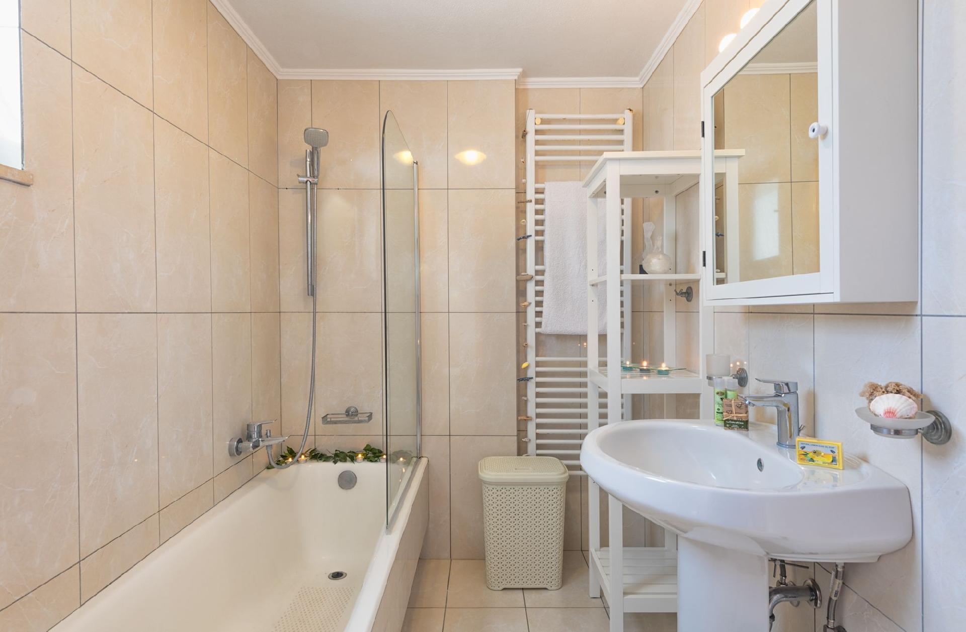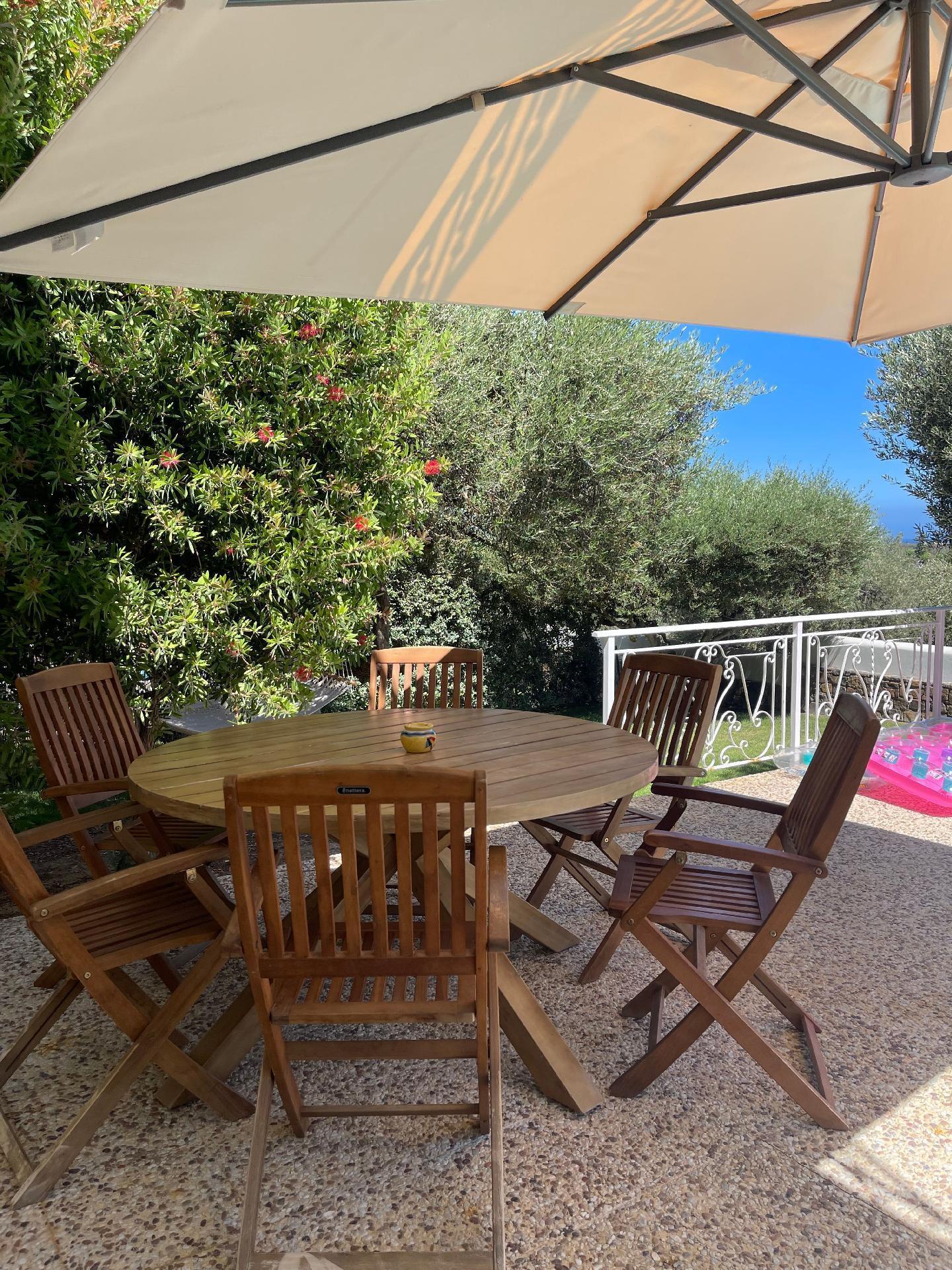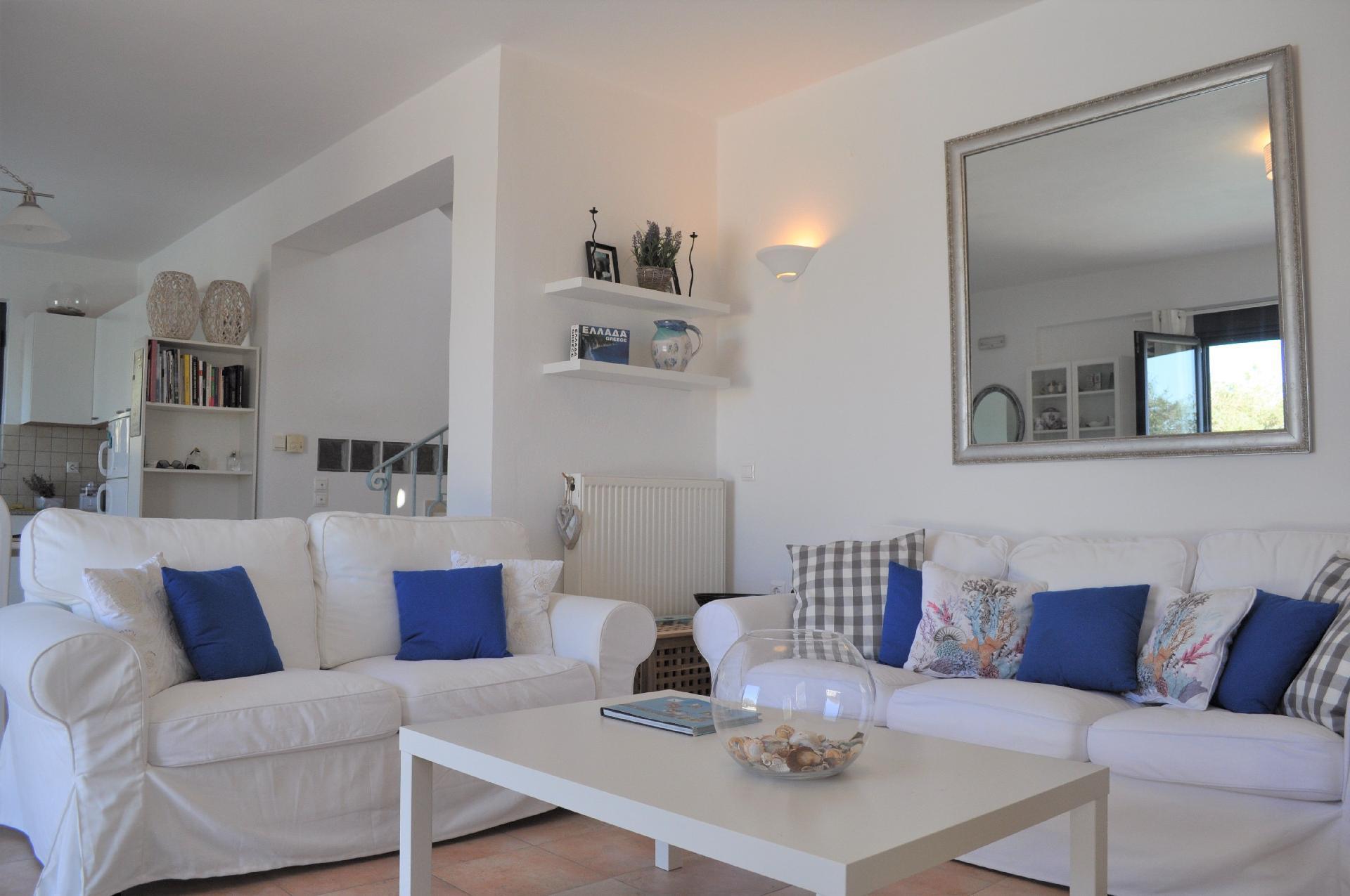 When you need a break from the endless sunshine, head inside to the bright living space and sprawl out on the sumptuous sofas. The crisp white colour scheme is a welcome relief from the heat, and although the style is simple, we like the laid-back approach.The ground floor is about 70 m² in size and comprises a living room with a fireplace, a flatscreen TV, triple and double sofa, a fully-equipped kitchen with an oven, microwave, coffee machine ( filter and Nespresso) and a dining area for 6 pax.The middle floor gives access to the first room with twin beds and a guest toilet with sink .The upper floor offers 2 bedrooms, both equipped with a double bed, very large cupboard, a dressing table with mirror and a large balcony.The balconies are the perfect spot to sip an afternoon tea (or a cocktail if you're up for it) and admire the sparkling sea views – in fact, it's the best spot in the house for oceanfront sunsets.Main bathroom with shower-bath, toilet and sink is also situated in the upper floor.