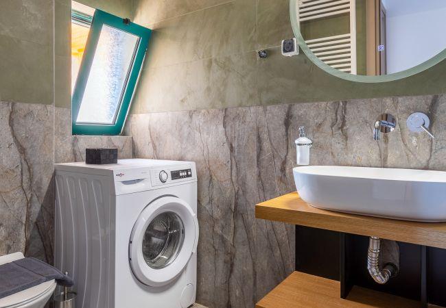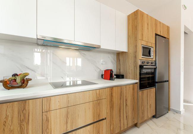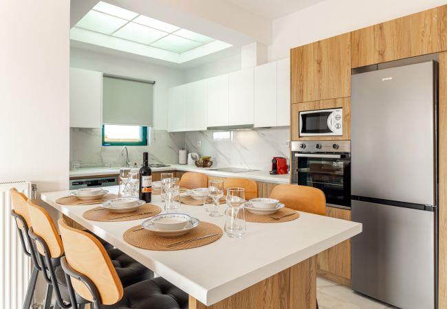 Inside, the open plan living and kitchen area is bright and inviting. The fully equipped modern kitchen features a chic island with 6 stools, perfect for casual dining or morning coffee. The living room offers a large, comfortable corner sofa and a 55” smart TV, opening onto a furnished terrace for outdoor relaxation.