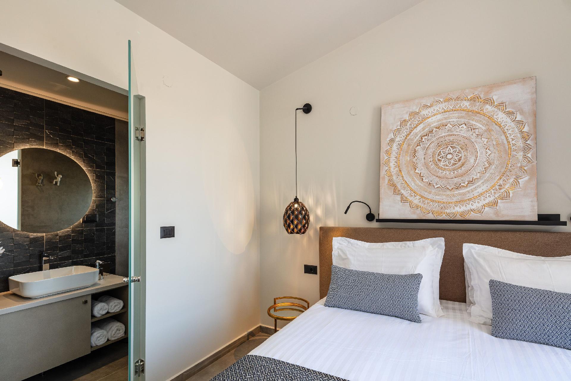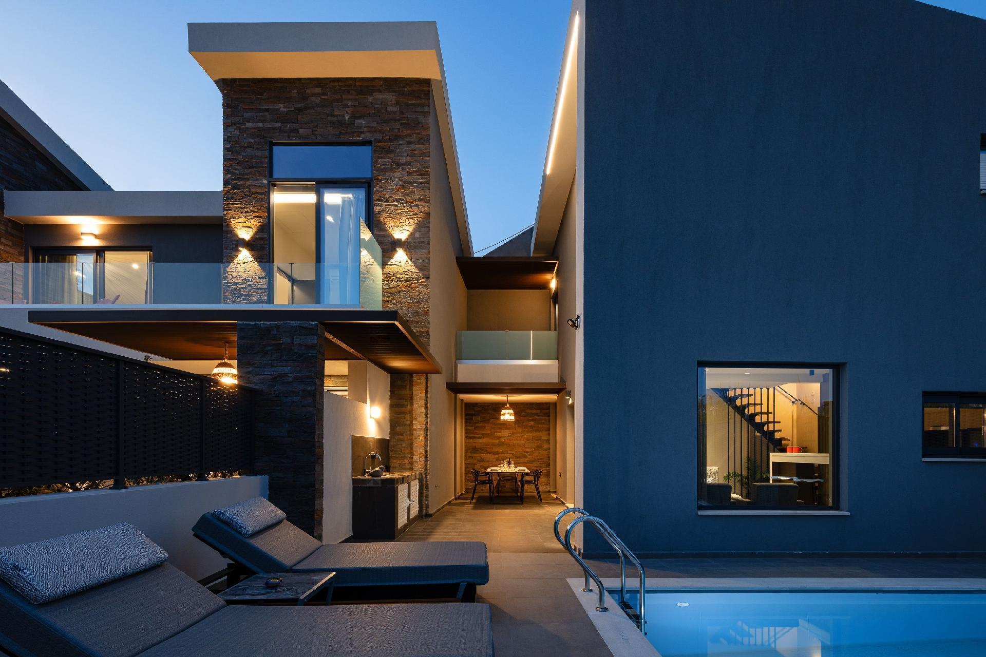 VillAgioi Villa III spans two thoughtfully designed floors and accommodates up to 5 guests. The villa welcomes you through the main gate and private parking area directly into the outdoor leisure space, seamlessly blending into the bright open-plan interior.