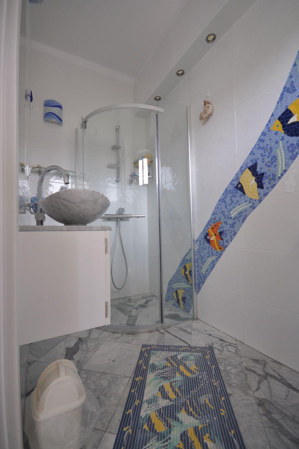 Within this architectural gem, you will find a generous living area spread over two floors, equipped with all the comforts of home and more. The ground floor comprises a tastefully furnished living room of around 100 m² with satellite TV, Wi-Fi, and an inviting lounge set next to a fireplace. A sophisticated dining area with seating for 12, a state-of-the-art kitchen, and a bedroom with en-suite bathroom ensure comfort at all times. The first floor houses 4 spacious bedrooms, each with air conditioning, private bathrooms and spacious balconies offering breathtaking sea views.