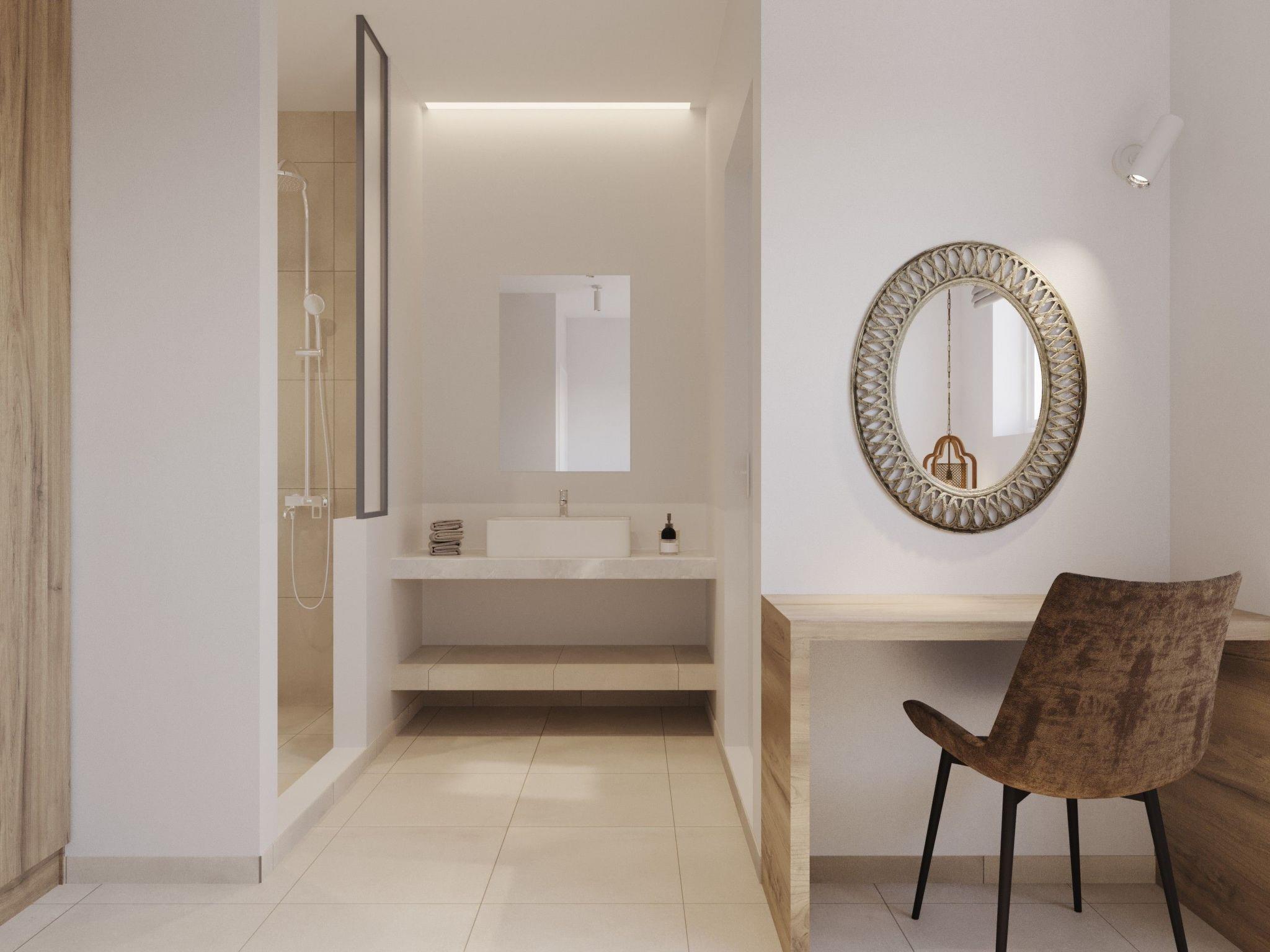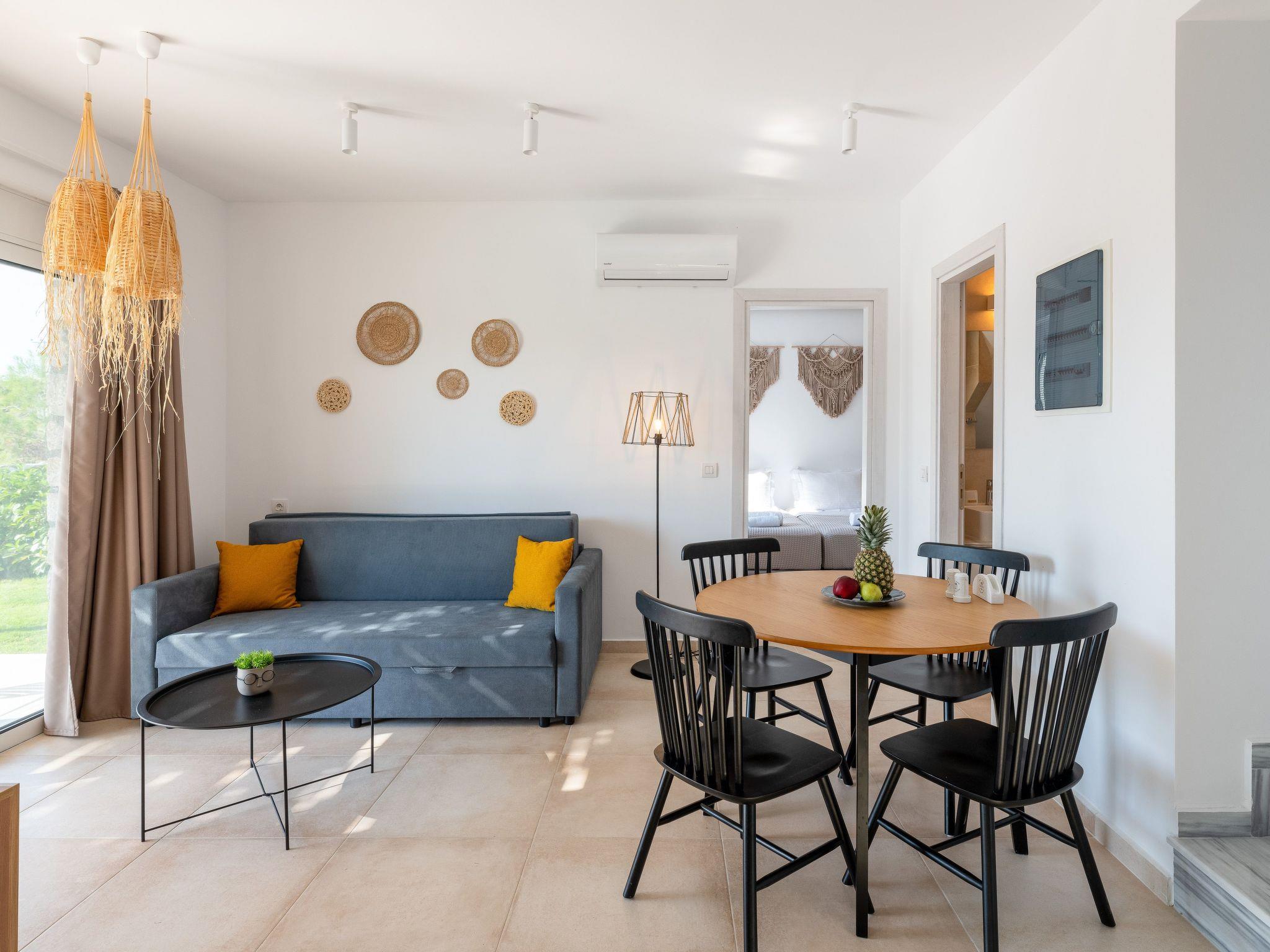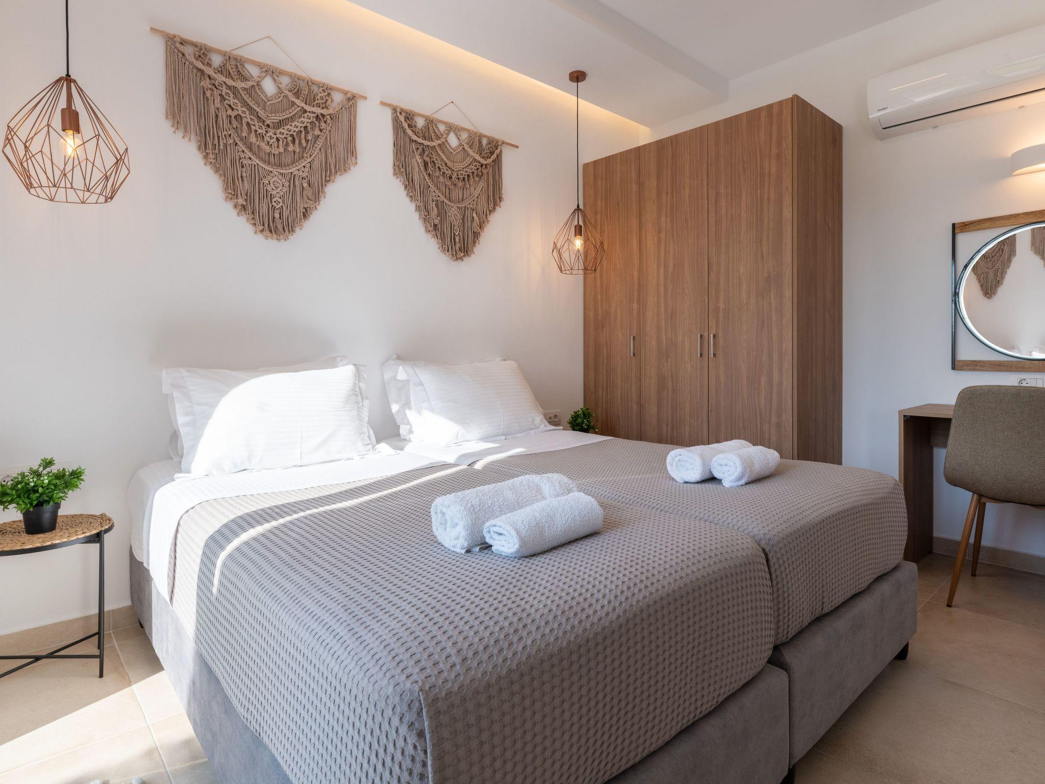 The beach is about 1km metres away. Charaki bay its 1 km away ,with its restaurants and supermarkets Massari village its 200 m away with all you need for shoping , pharmacy etc