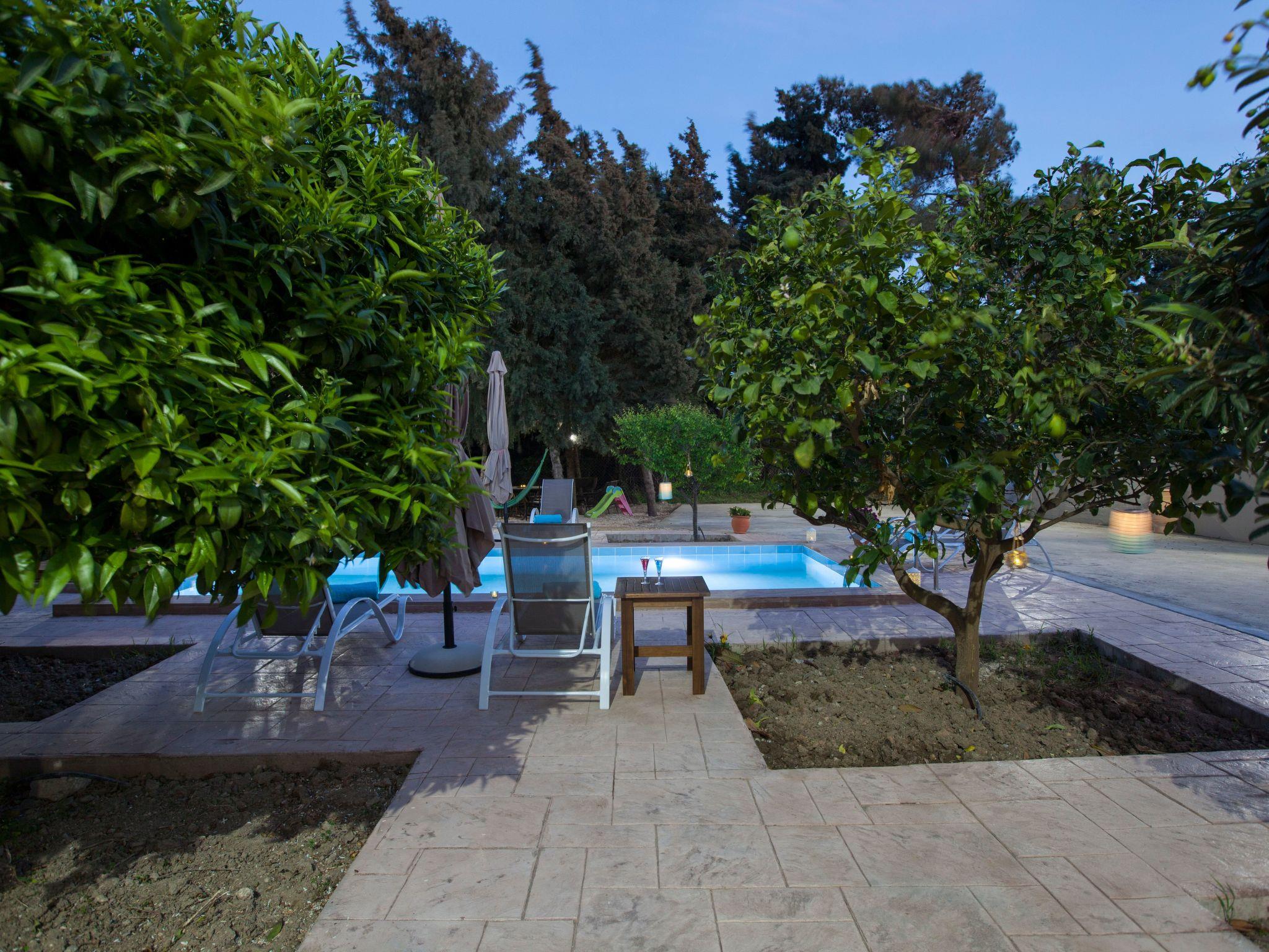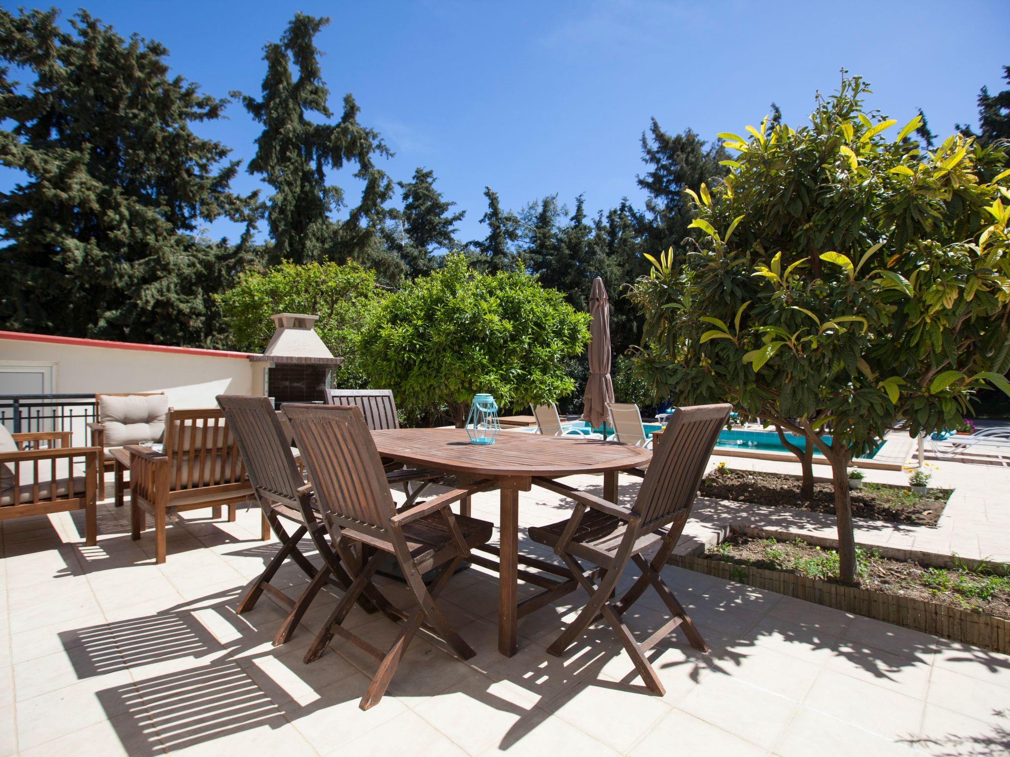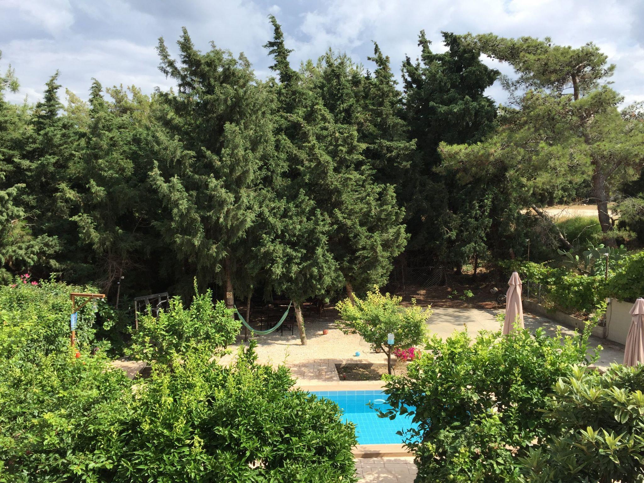 In a safe area, the villa is surrounded by a Mediterranean garden (citrus and pomegranate trees, herbs), which is extended to a little private forest with pine trees and cypresses.The villa is located in a safe and quite area, 500 m away from the main road of the island, which is a perfect distance to both avoid noise and have easy access too. In the neighbourhood, there is a grocery, cooking house and a large playground with a modern café snack-bar, where you can go on foot in about 5 minutes. Koskinou village, a UN Cultural Heritage protected village, with traditional tavernas is only 15 minutes walking. The closest large supermarkets are 5 minutes driving and Rhodes town is only a 10-minute drive away from the villa.