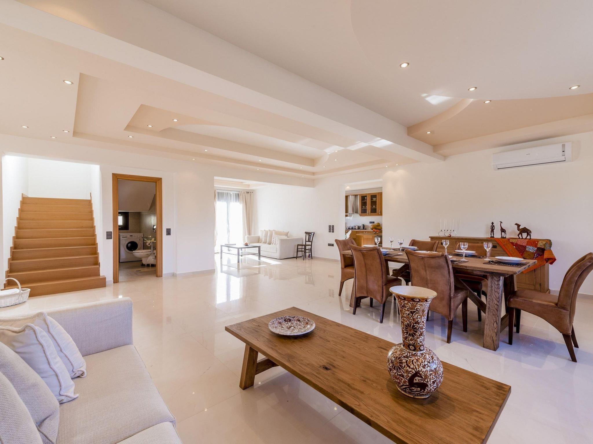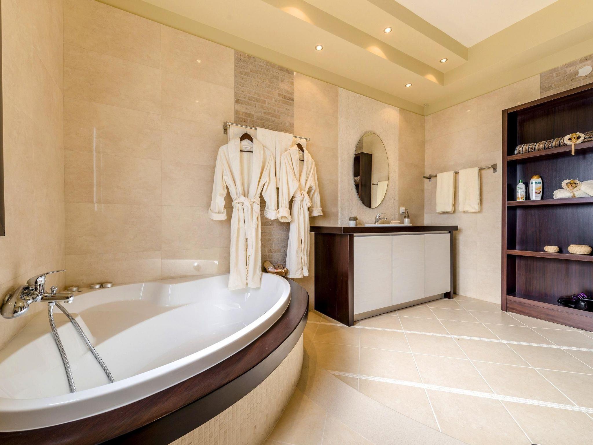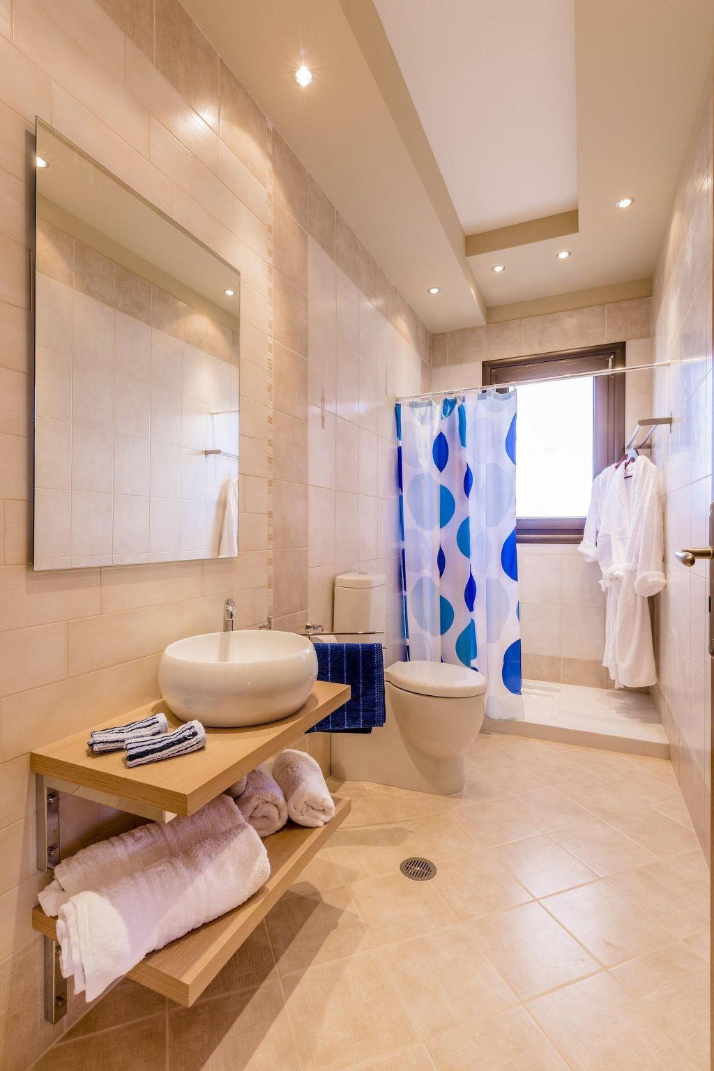 The fully air conditioned (hot/cold) villa has only recently been newly built in 2014 and is secured by a CCTV alarm system. It is equipped to the highest standards offering all the modern comforts you might need for a memorable holiday. Spread over two floors, it features a generous living-/dining area, a separate top modern kitchen, three bedrooms, one with ensuite bathroom, a separate bathroom and a guest toilet. Marble flooring lends an elegant atmosphere to the whole ground floor which hosts two seating areas, a large dining area, the separate kitchen and the guest toilet. The living area has a stylish wall mounted fireplace and is furnished with a comfortable cream coloured four seater sofa, a coffee table, a large digital flat screen satellite television with DVD and Blu Ray player, a stereo system and a safe where you can store your belongings. Top this all off there is a small massage machine for the back, neck and shoulders that you can use while sitting on the sofa. The dining area features a handcrafted solid wood table with six leather chairs and the second seating arrangement with an additional sofa and a wooden coffee table. The bright and airy separate fully fitted kitchen has a casual dining table with four chairs and is equipped with a dishwasher, ceran cooktop, oven, large fridge/freezer combination, microwave, espresso and cappuccino machine, juicer, electric kettle and a toaster. There's also a high chair. In the guest toilet you will find a washing machine. A wide wooden staircase leads up to the first floor where you will find the three bedrooms, one ensuite and two with direct access to their own balconies, and the separate bathroom. The ensuite master bedroom is furnished with a 190 cm x 200 cm romantic canopy bed, a digital satellite television and a baby crib. The ensuite bathroom has a very generous walk-in shower, a bowl sink wash basin with wall mirror and a toilet. The second bedroom is furnished with two 100 cm x 200 cm single beds and a large wardrobe offering plenty of storage space for your clothes and luggage and the third bedroom offers a 150 cm x 200 cm double bed and a large wardrobe. The separate bathroom boasts a wellness area making it a great space to relax in. You will find a jacuzzi cabinet, oversized bathtub shower combo, a wash basin with an extra large cupboard and a toilet. Reliable WiFi internet access is offered free of charge.