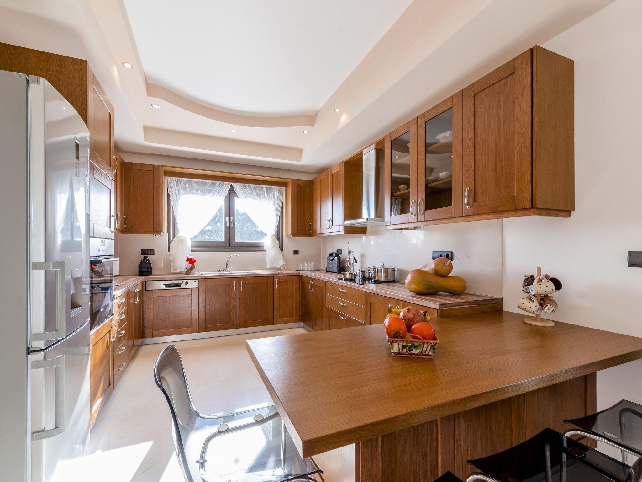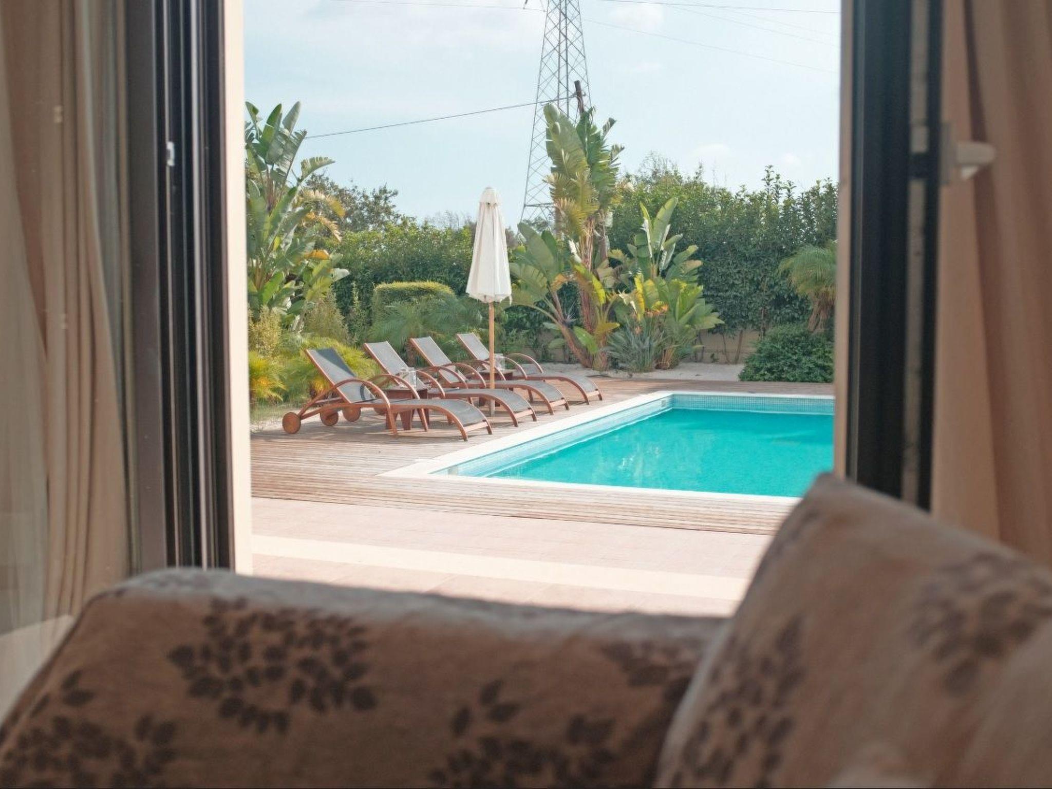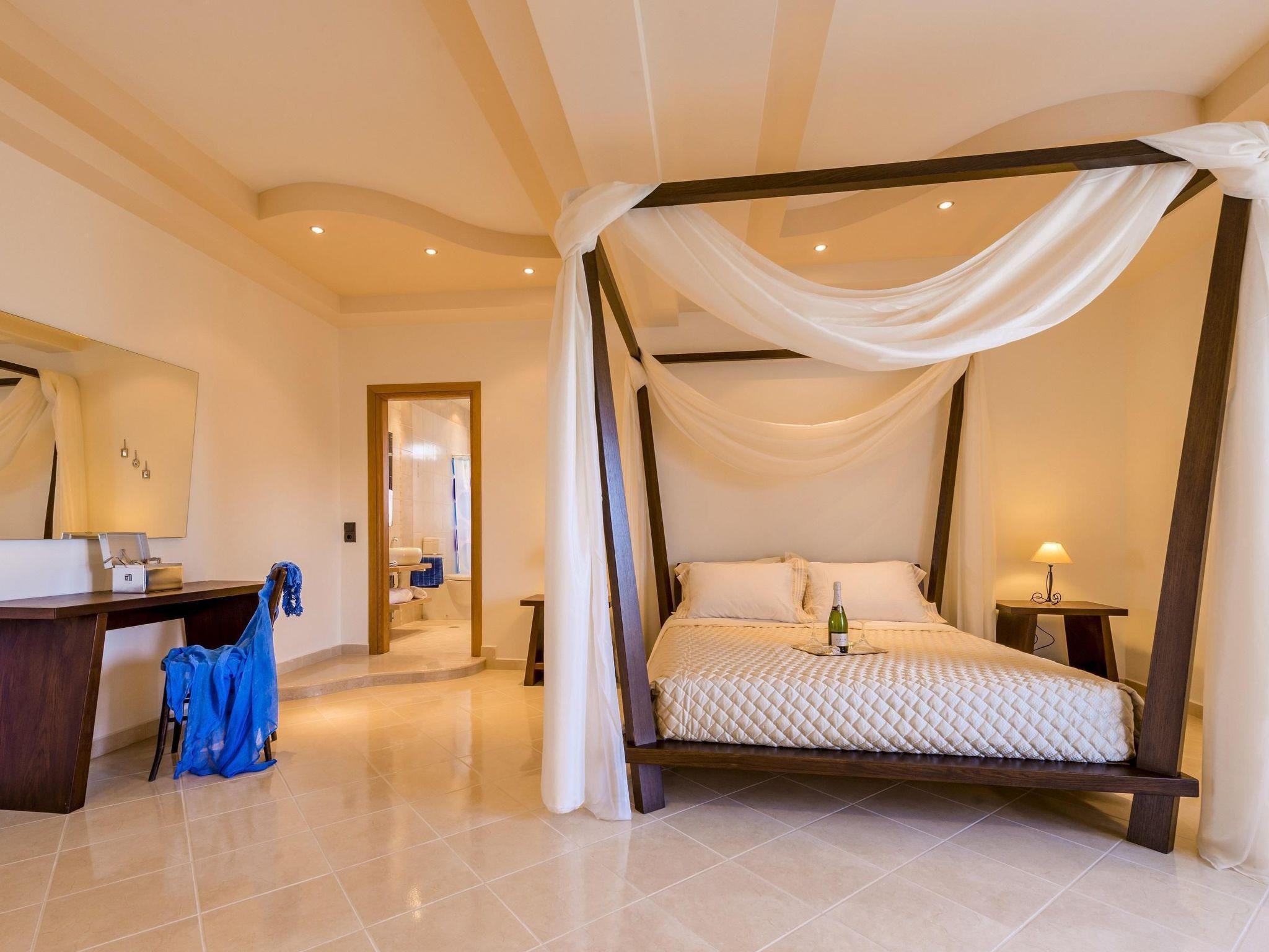 The fully air conditioned (hot/cold) villa has only recently been newly built in 2014 and is secured by a CCTV alarm system. It is equipped to the highest standards offering all the modern comforts you might need for a memorable holiday. Spread over two floors, it features a generous living-/dining area, a separate top modern kitchen, three bedrooms, one with ensuite bathroom, a separate bathroom and a guest toilet. Marble flooring lends an elegant atmosphere to the whole ground floor which hosts two seating areas, a large dining area, the separate kitchen and the guest toilet. The living area has a stylish wall mounted fireplace and is furnished with a comfortable cream coloured four seater sofa, a coffee table, a large digital flat screen satellite television with DVD and Blu Ray player, a stereo system and a safe where you can store your belongings. Top this all off there is a small massage machine for the back, neck and shoulders that you can use while sitting on the sofa. The dining area features a handcrafted solid wood table with six leather chairs and the second seating arrangement with an additional sofa and a wooden coffee table. The bright and airy separate fully fitted kitchen has a casual dining table with four chairs and is equipped with a dishwasher, ceran cooktop, oven, large fridge/freezer combination, microwave, espresso and cappuccino machine, juicer, electric kettle and a toaster. There's also a high chair. In the guest toilet you will find a washing machine. A wide wooden staircase leads up to the first floor where you will find the three bedrooms, one ensuite and two with direct access to their own balconies, and the separate bathroom. The ensuite master bedroom is furnished with a 190 cm x 200 cm romantic canopy bed, a digital satellite television and a baby crib. The ensuite bathroom has a very generous walk-in shower, a bowl sink wash basin with wall mirror and a toilet. The second bedroom is furnished with two 100 cm x 200 cm single beds and a large wardrobe offering plenty of storage space for your clothes and luggage and the third bedroom offers a 150 cm x 200 cm double bed and a large wardrobe. The separate bathroom boasts a wellness area making it a great space to relax in. You will find a jacuzzi cabinet, oversized bathtub shower combo, a wash basin with an extra large cupboard and a toilet. Reliable WiFi internet access is offered free of charge.