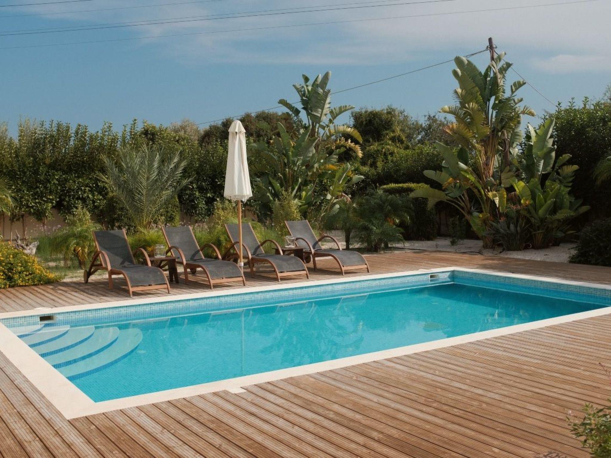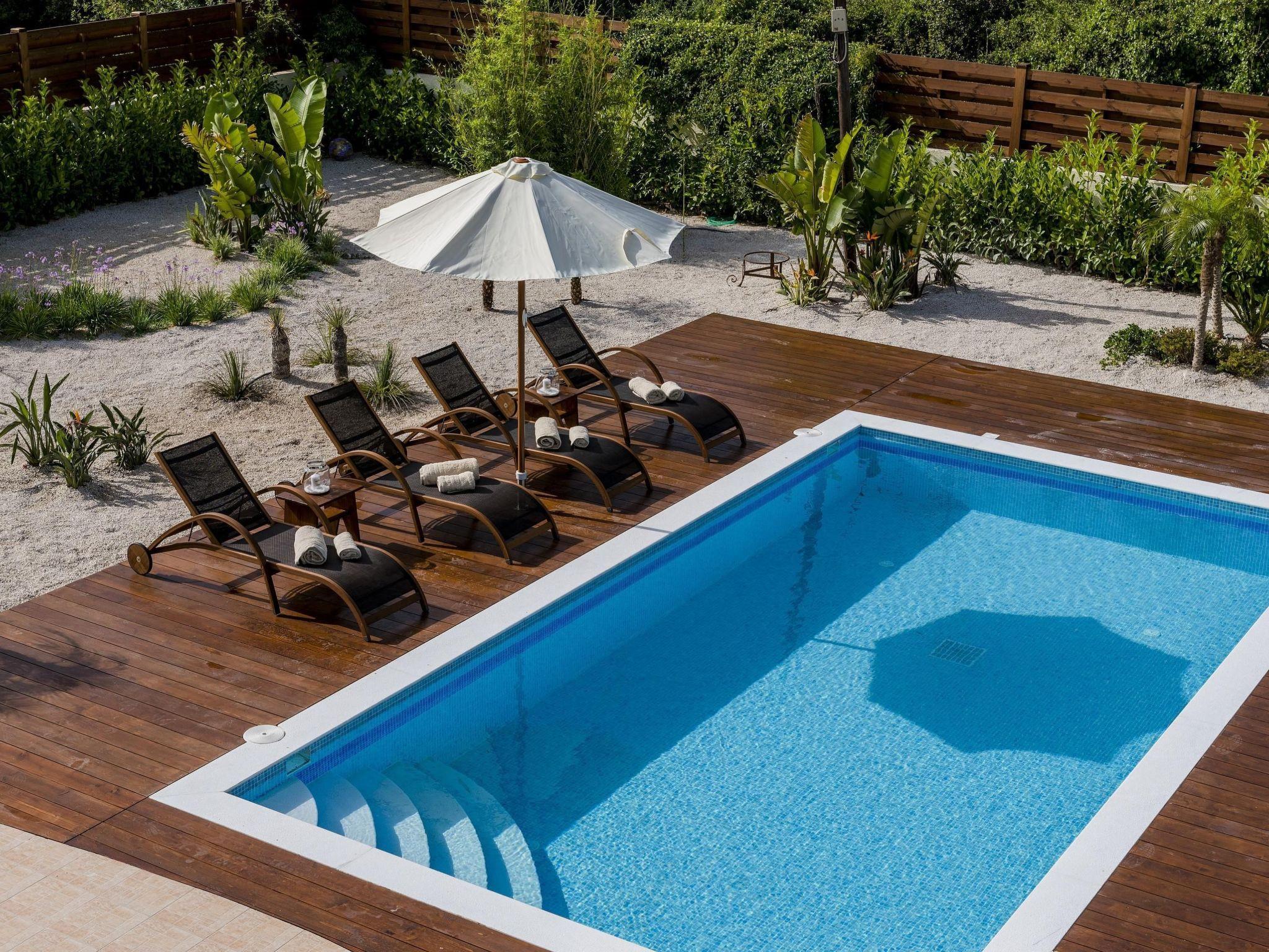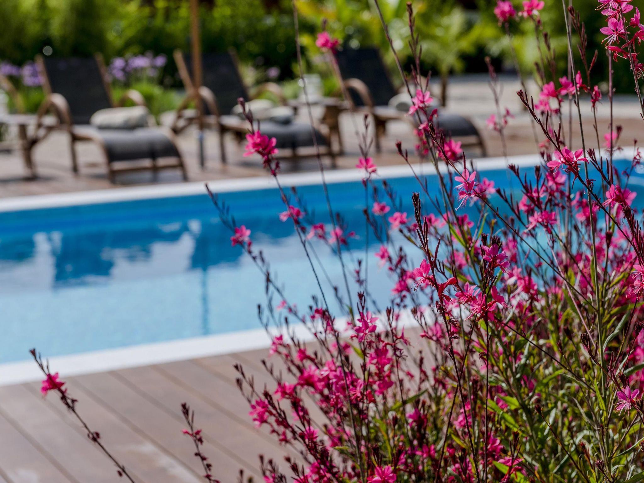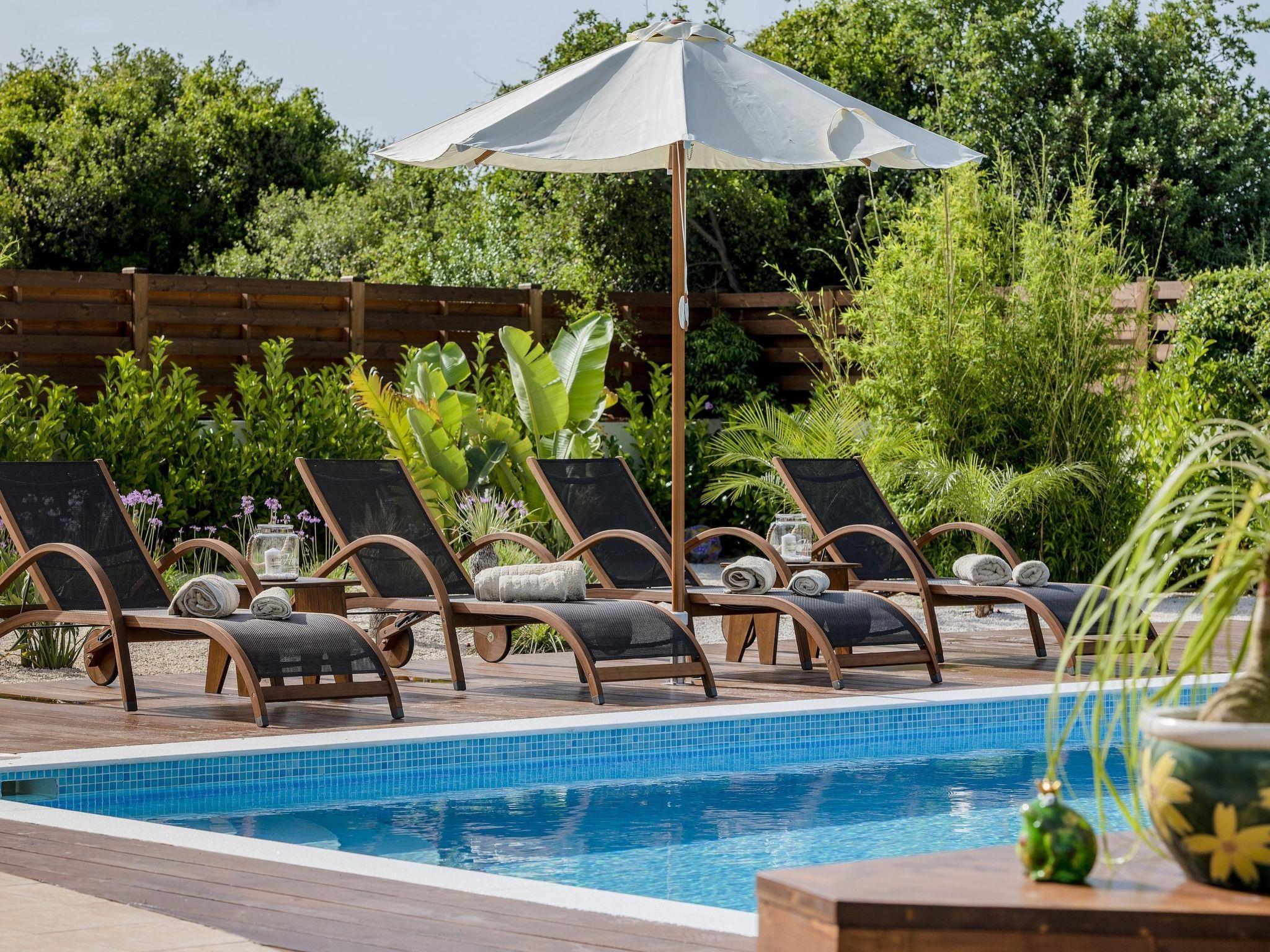 Large sliding glass doors in the living area open onto the garden with urban design. Natural stone pebbles and carefully selected plants and flowers create an exclusive atmosphere. The sophisticated gazebo terrace with a wood burning stove and barbecue is furnished with a large wooden dining table and six matching chairs. Here, you can enjoy long barbecue evenings under the starlit skies. A car is recommended for exploring the island. Secure parking spaces are available on the enclosed premises. A brand new private swimming pool is available of of 33 m2 and 1,20m depth.