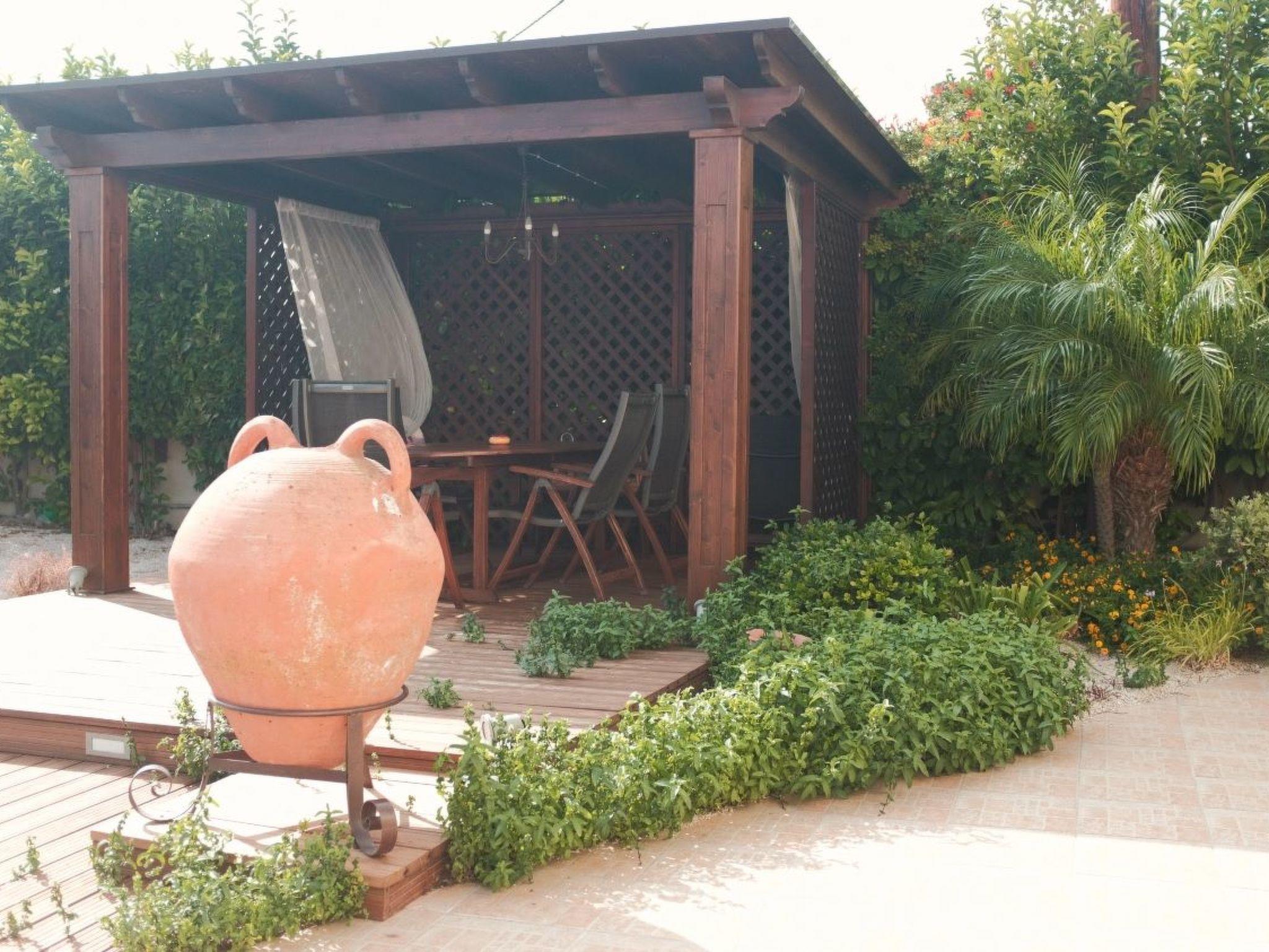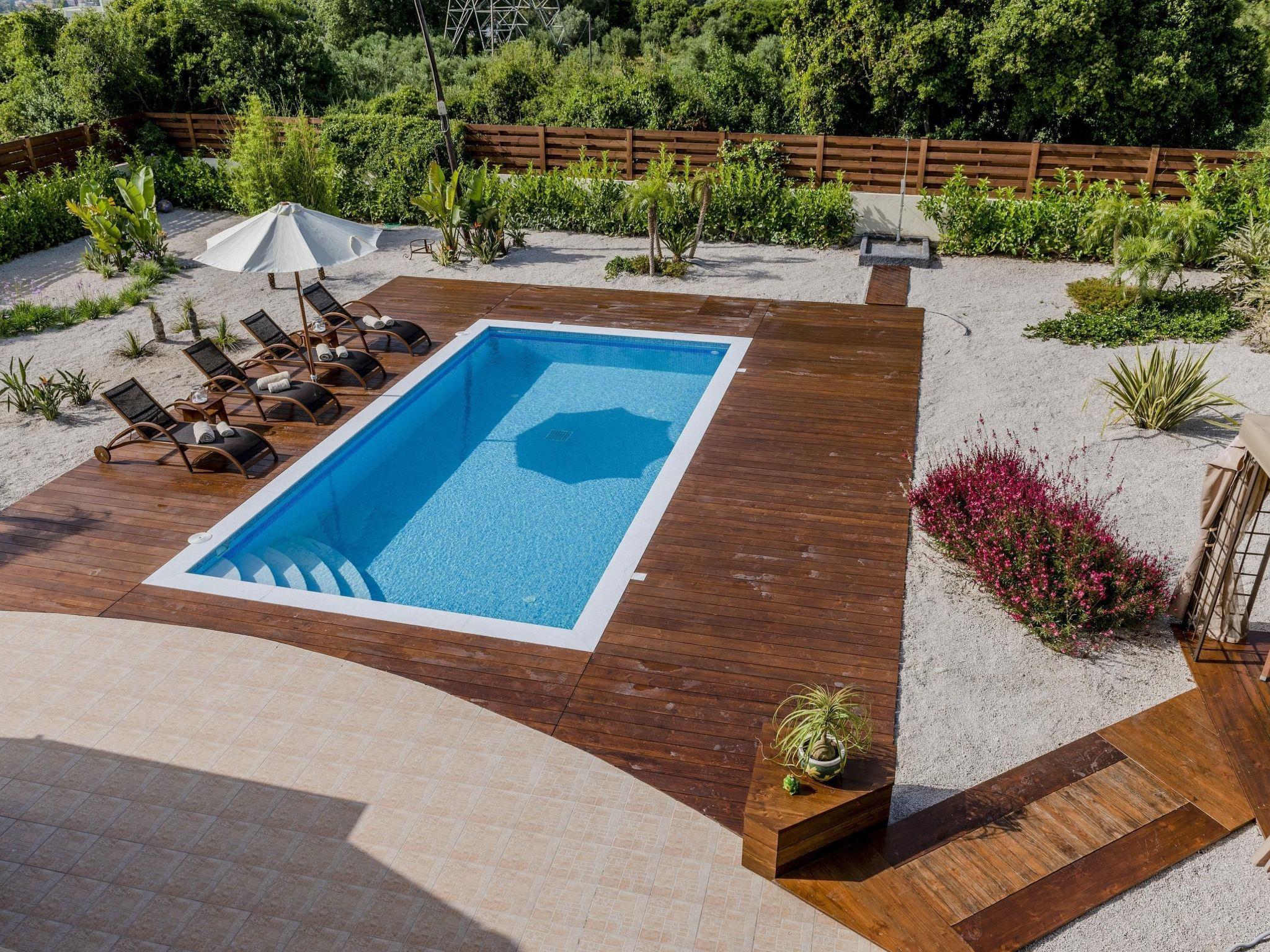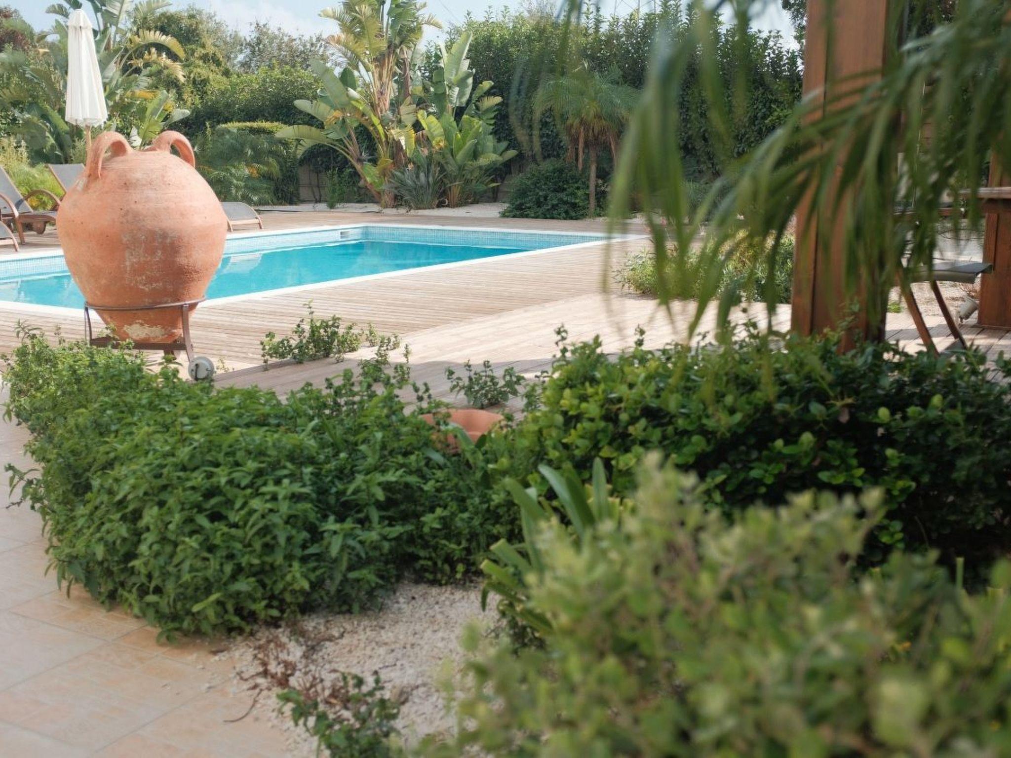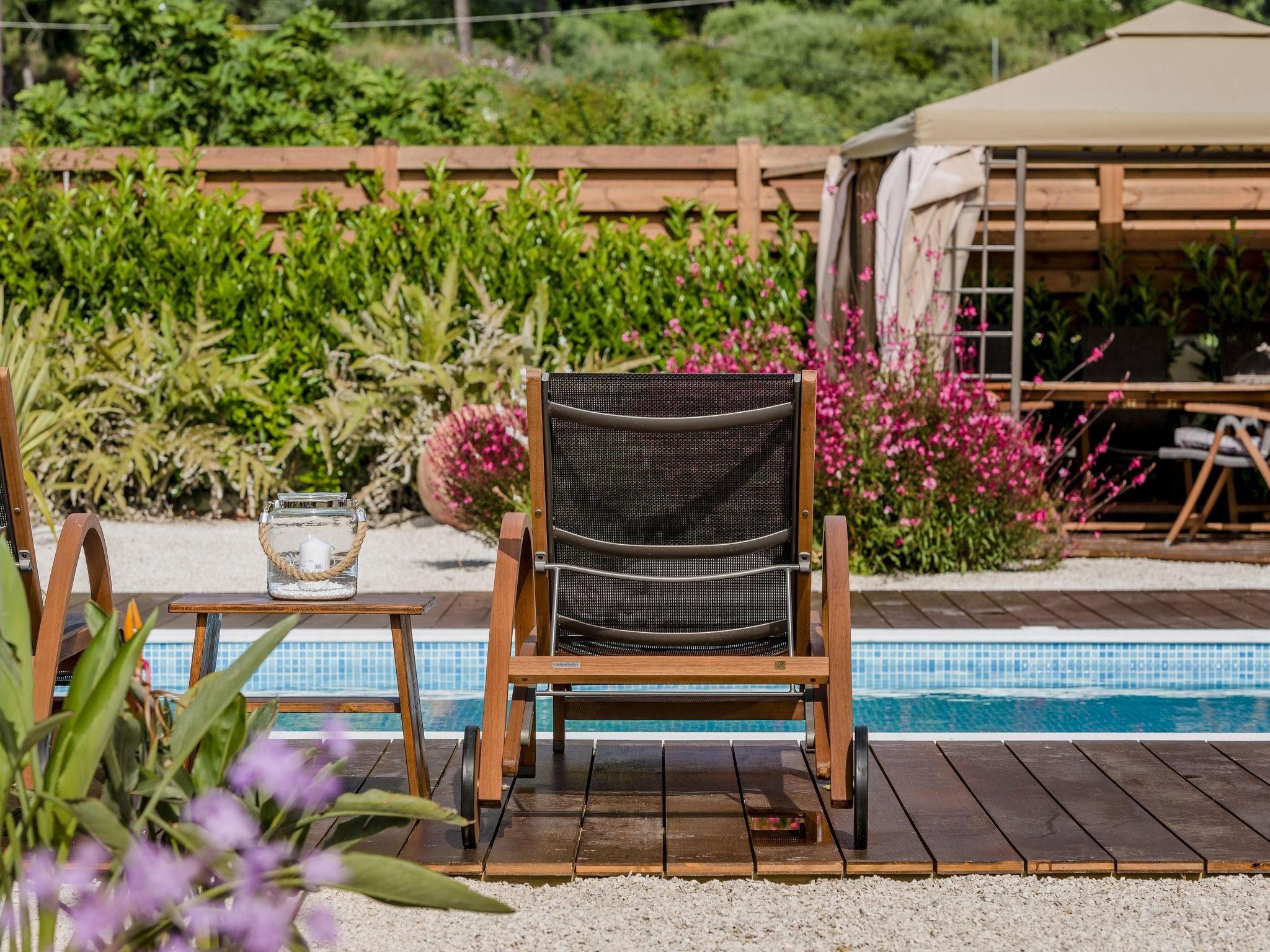 Large sliding glass doors in the living area open onto the garden with urban design. Natural stone pebbles and carefully selected plants and flowers create an exclusive atmosphere. The sophisticated gazebo terrace with a wood burning stove and barbecue is furnished with a large wooden dining table and six matching chairs. Here, you can enjoy long barbecue evenings under the starlit skies. A car is recommended for exploring the island. Secure parking spaces are available on the enclosed premises. A brand new private swimming pool is available of of 33 m2 and 1,20m depth.