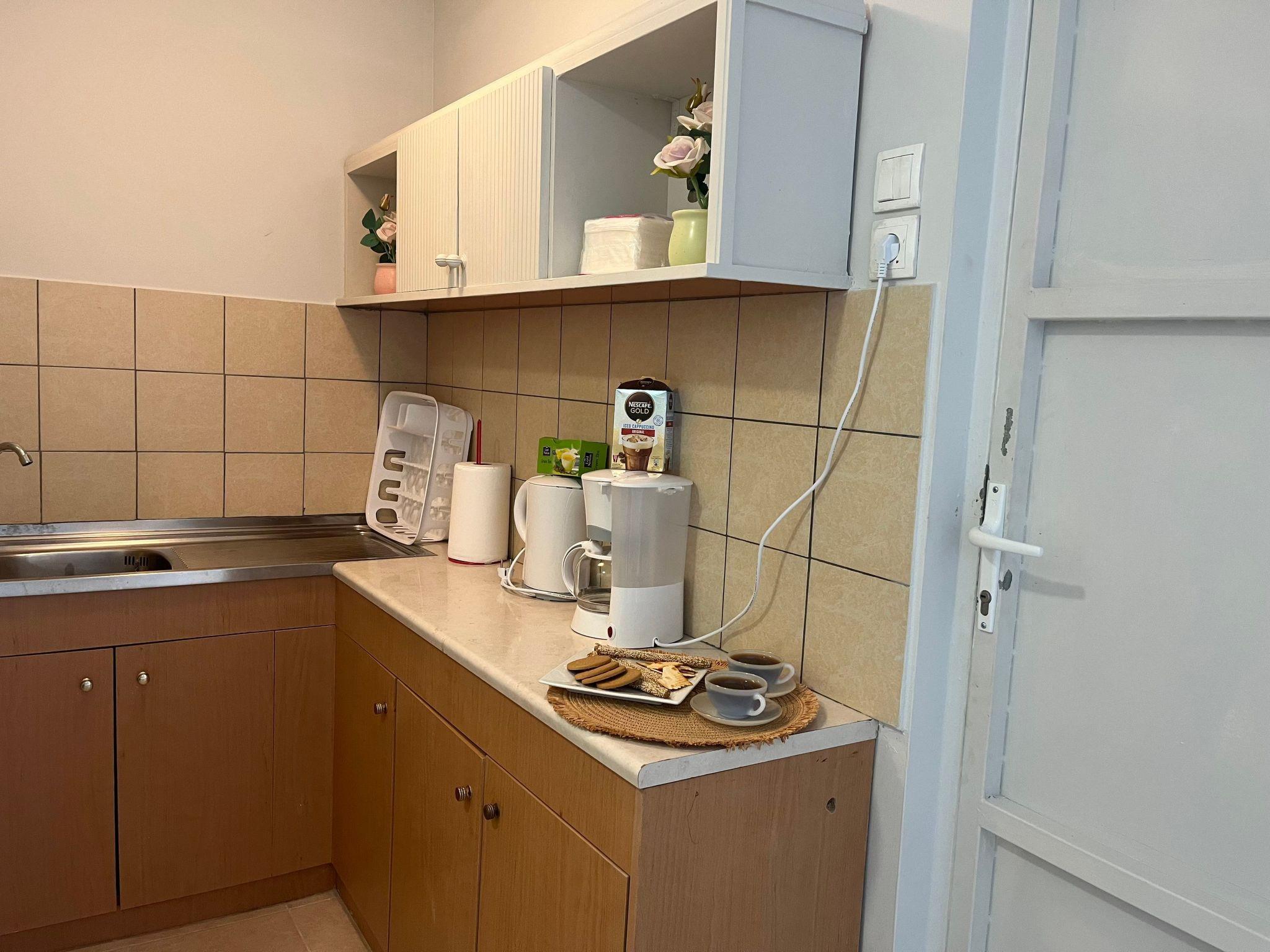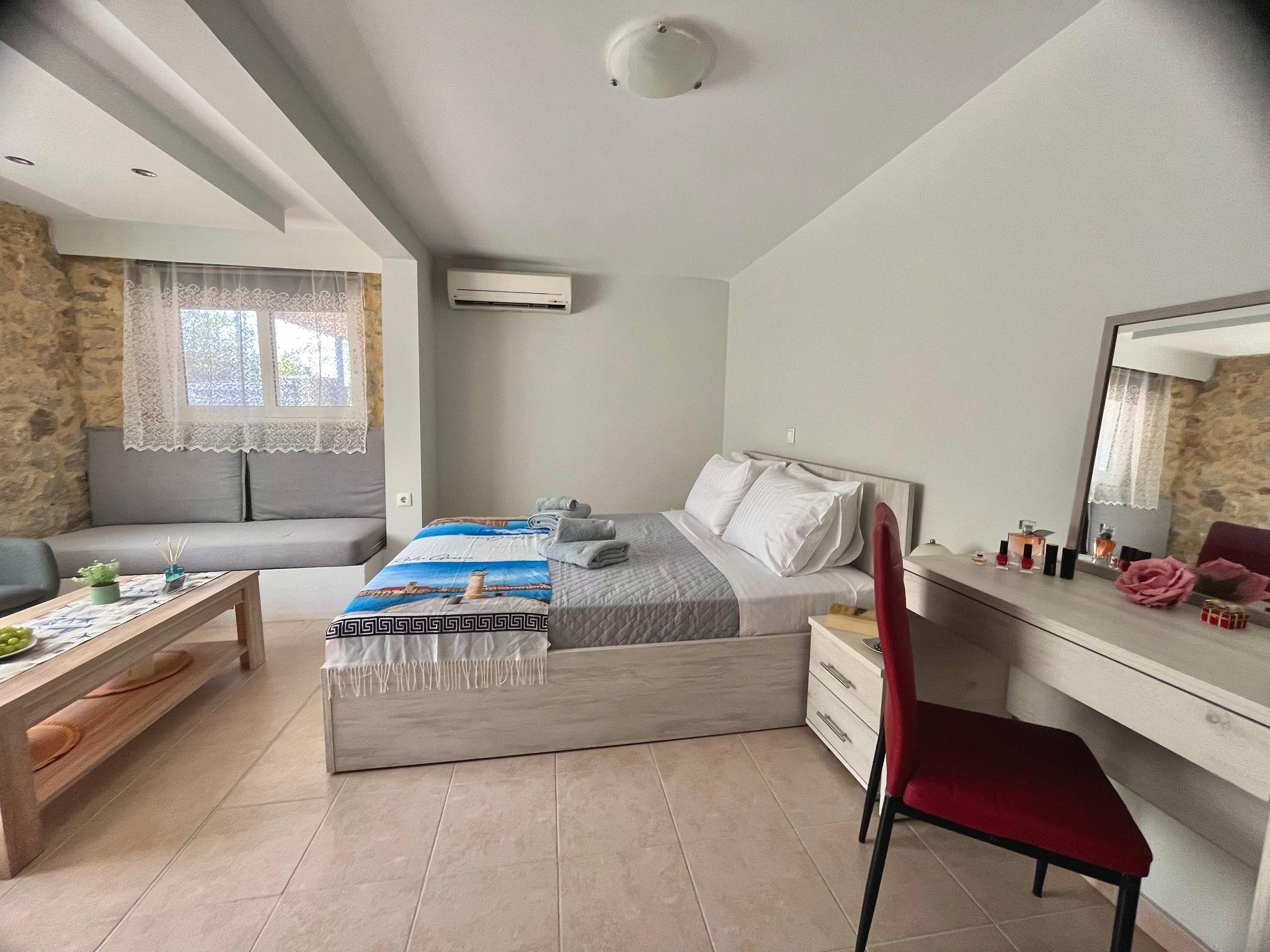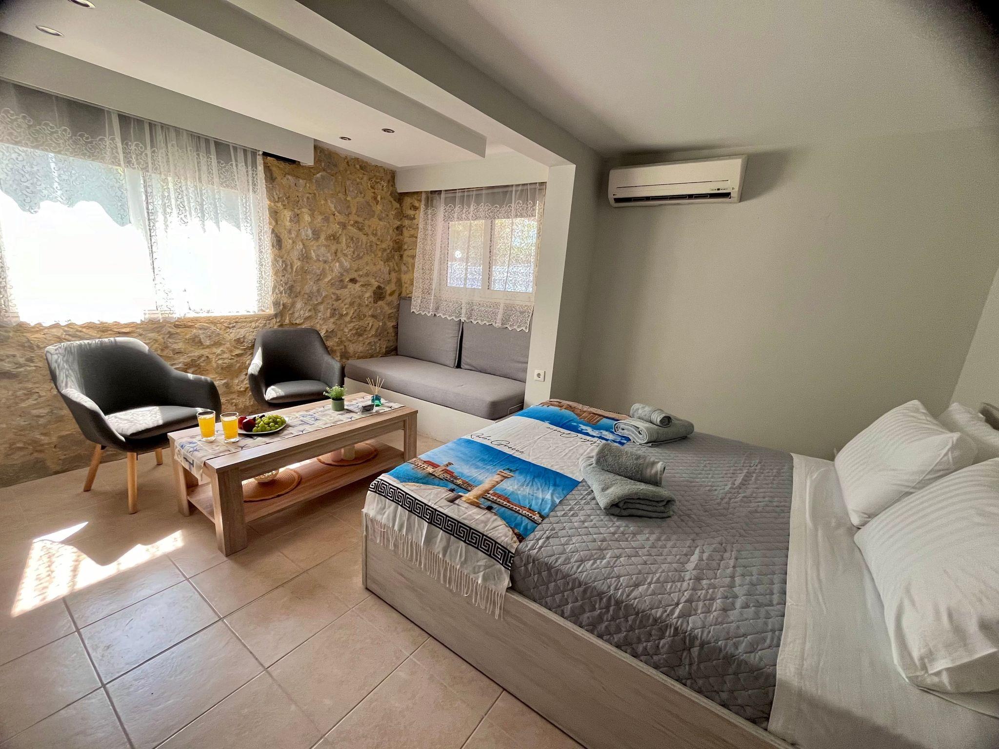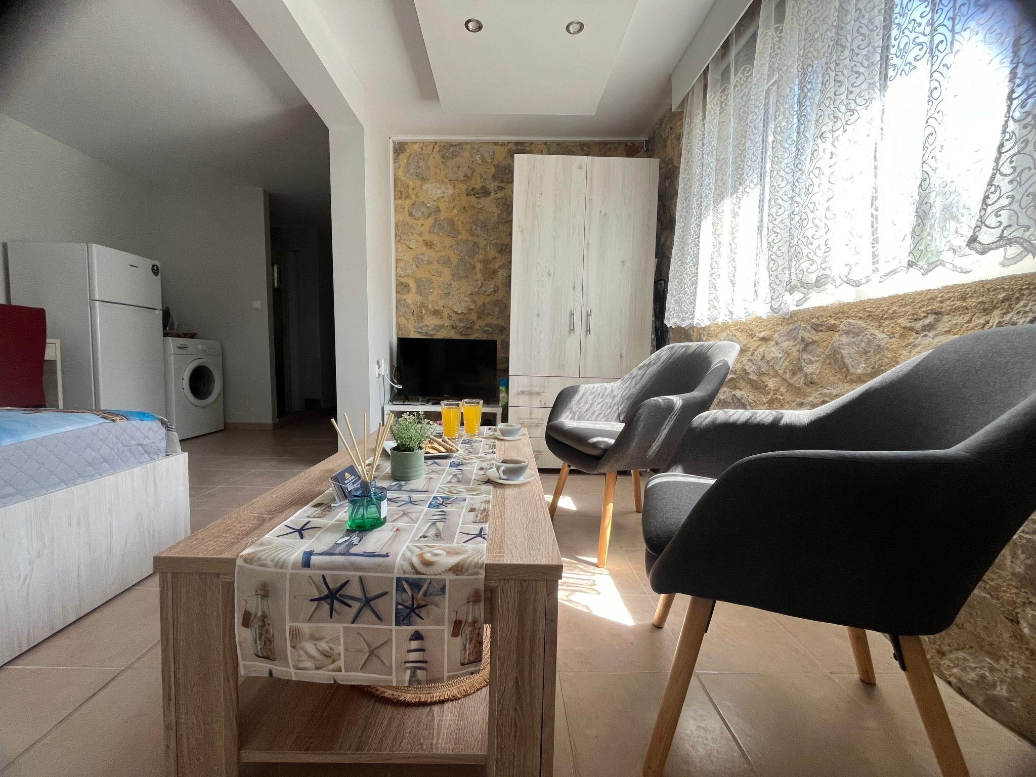 Inside, Galene features a cohesive open-plan space, beautifully blending the living, sleeping, and dining areas. The apartment is fully equipped with air conditioning to ensure a comfortable stay regardless of the outside temperature. For your convenience, it includes a shower in the bathroom and a kitchenette equipped with a filter coffee machine and an electric kettle. Moreover, guests have exclusive access to a washing machine within the unit, making it ideal for longer stays.