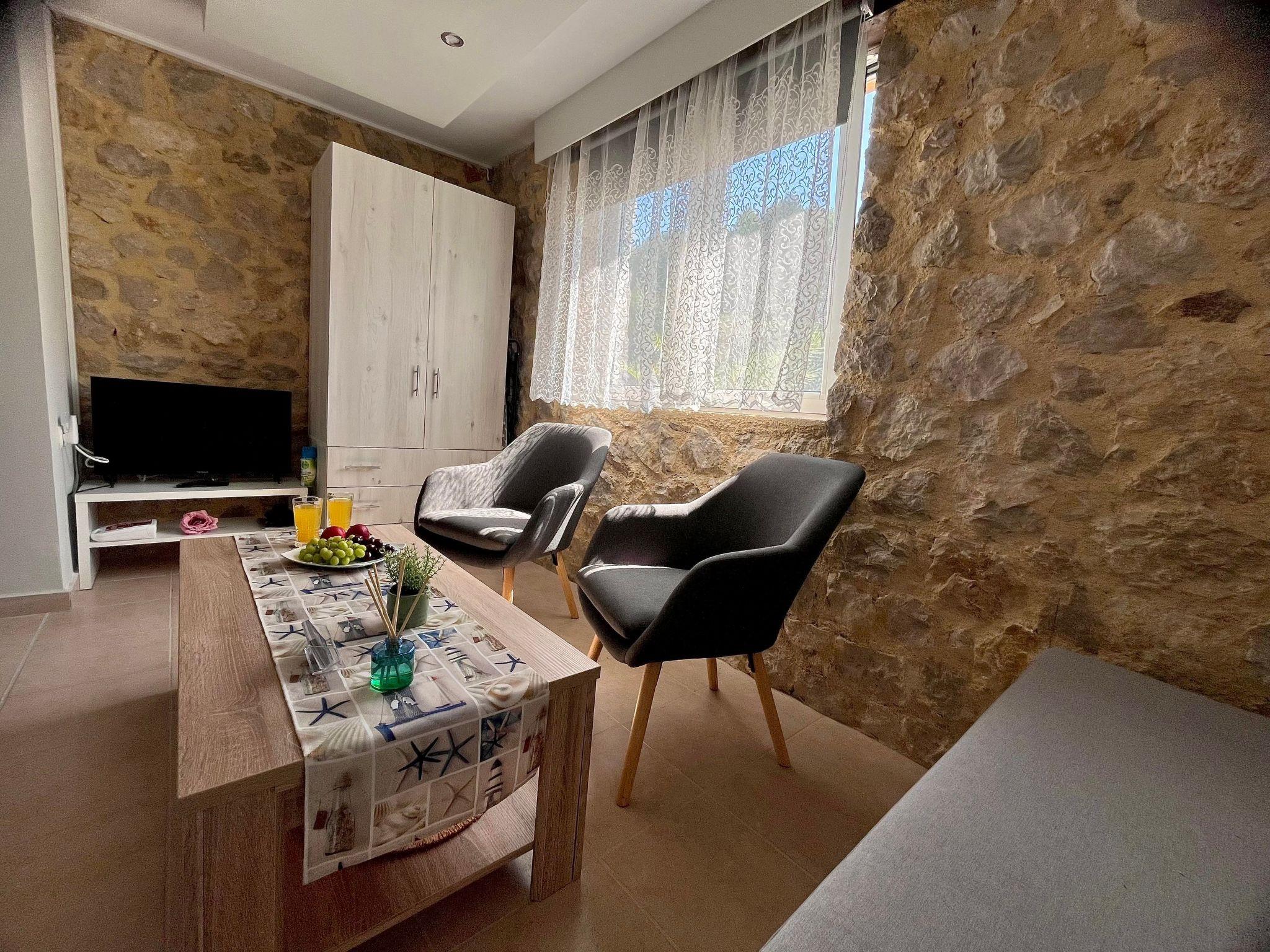 Welcome to "Galene," a 32 sq.m studio apartment that boasts a modern architectural design and focuses on the essence of simplicity, creating an intimate atmosphere for up to 3 adults. We are thrilled to offer a new private pool experience in our two new apartments, including Galene, starting from this year’s summer period. Dive into comfort and style, making it your home away from home for those seeking tranquility and convenience.