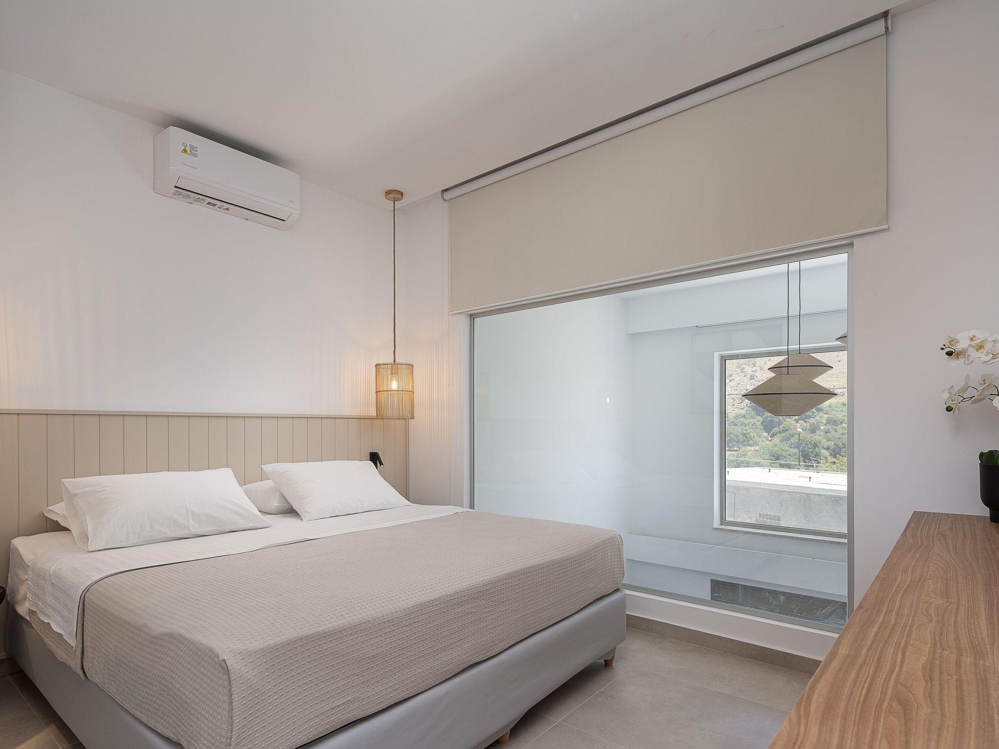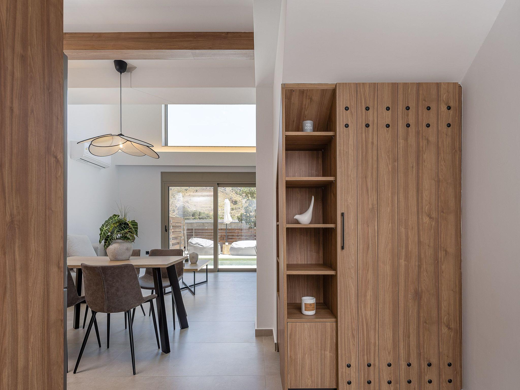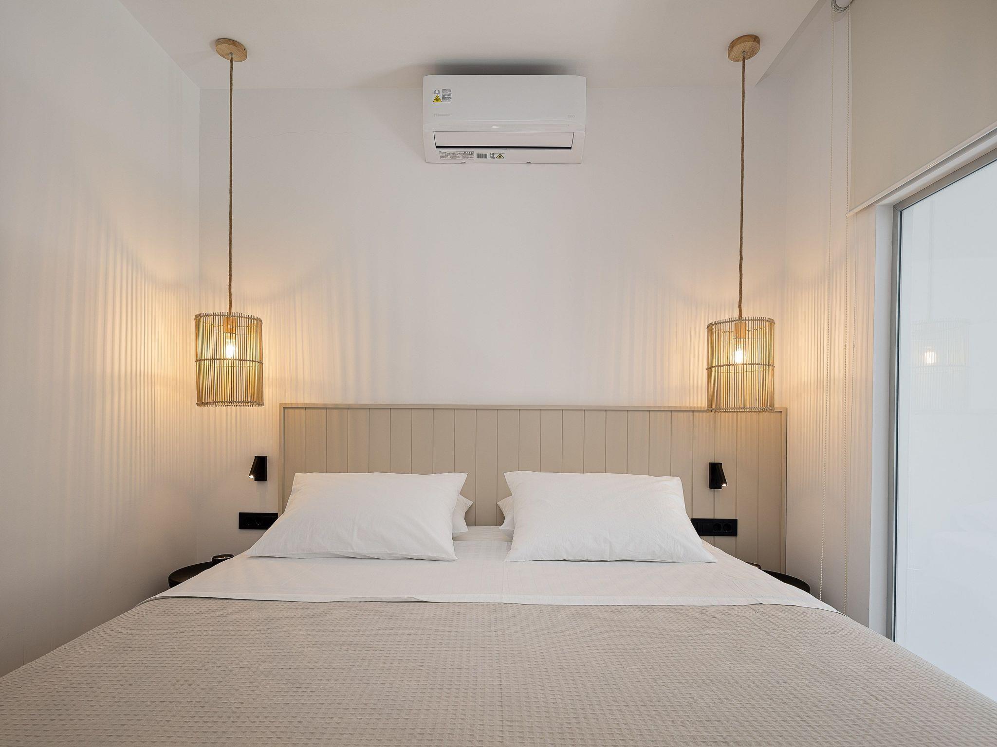 The villa spans approximately 80 sqm of indoor living space and 90sqm of outdoor area, making it ideal for groups or families. The villas feature a spacious open-plan living area, where guests can relax on a comfortable sofa while enjoying modern amenities such as a 50’’ Smart TV with satellite channels. Large sliding doors provide access to private terraces or the pool area, creating an easy flow between the indoor and outdoor spaces. The villa has a fully functional kitchen, allowing guests to prepare meals with ease, and the dining area offers a welcoming space for shared meals. An extra guest can be accommodated on the sofa in the living area upon request at an extra cost. The sofa is comfortable for both adults and children as the size is 1.10*2.20m.