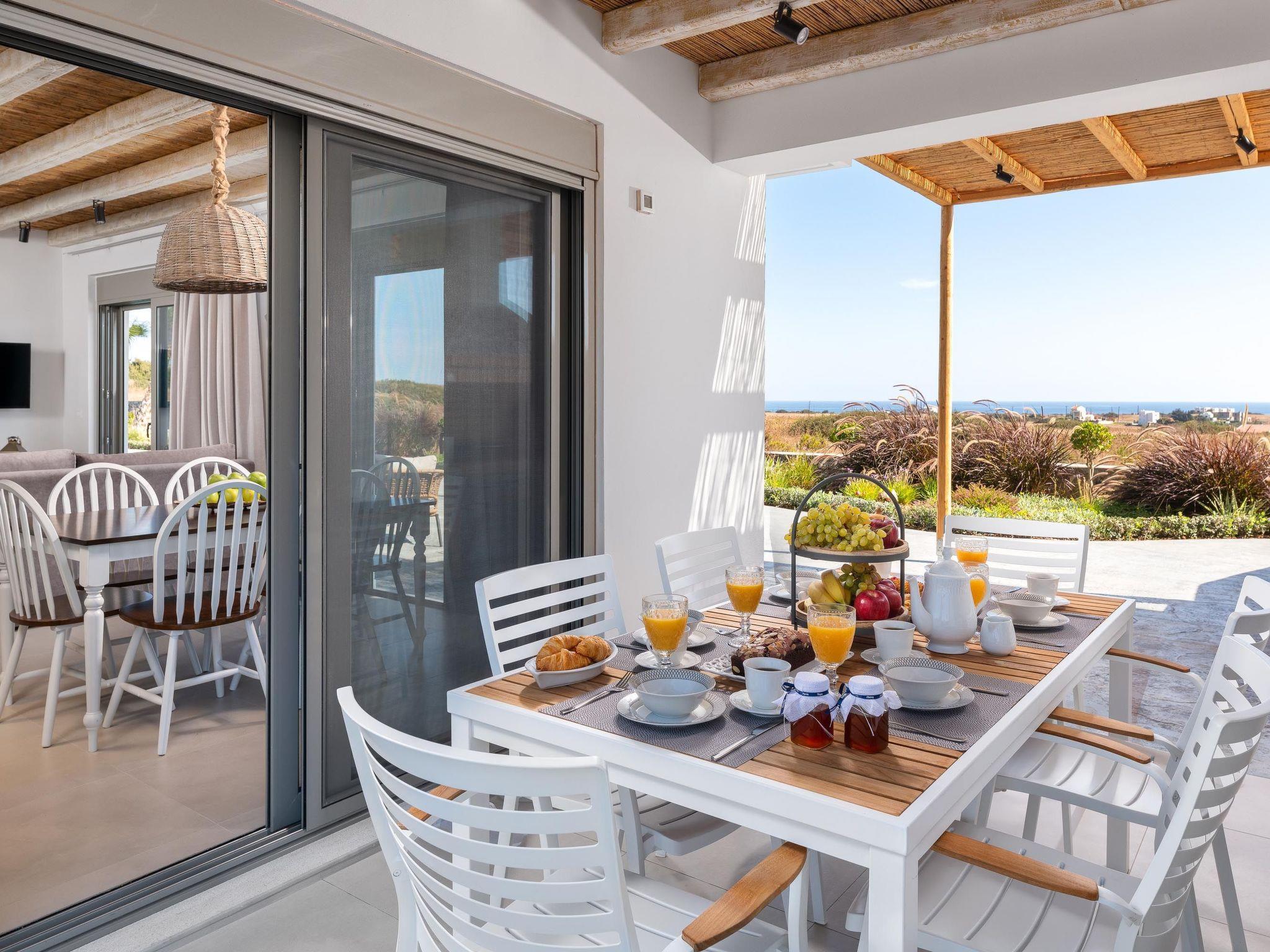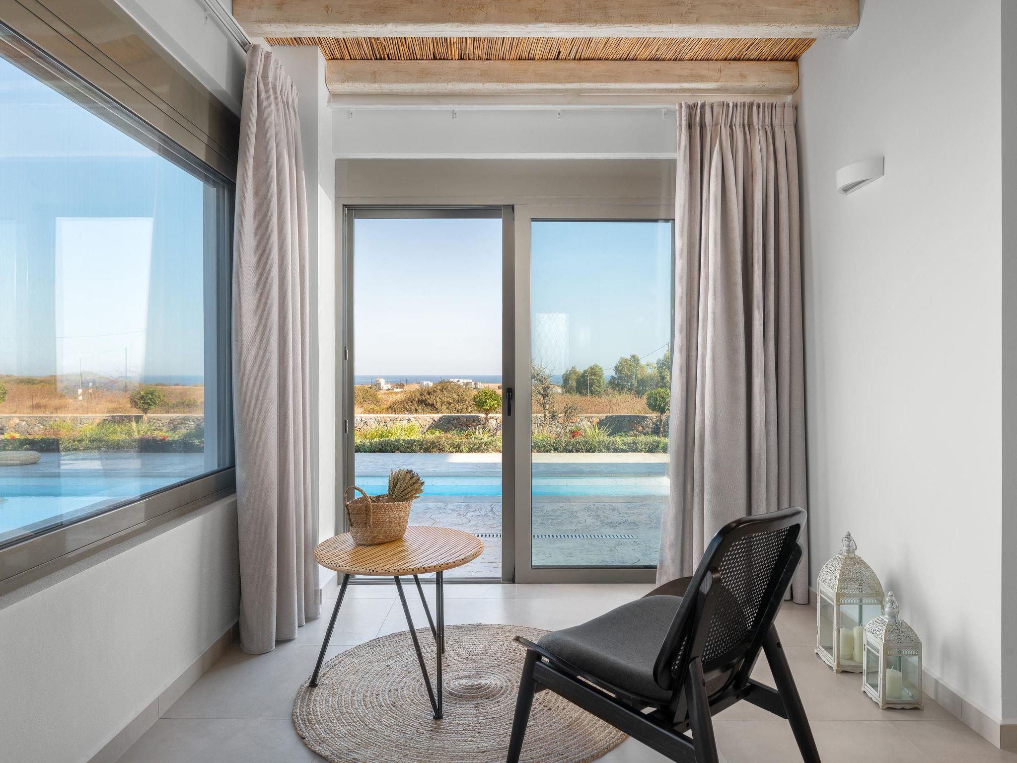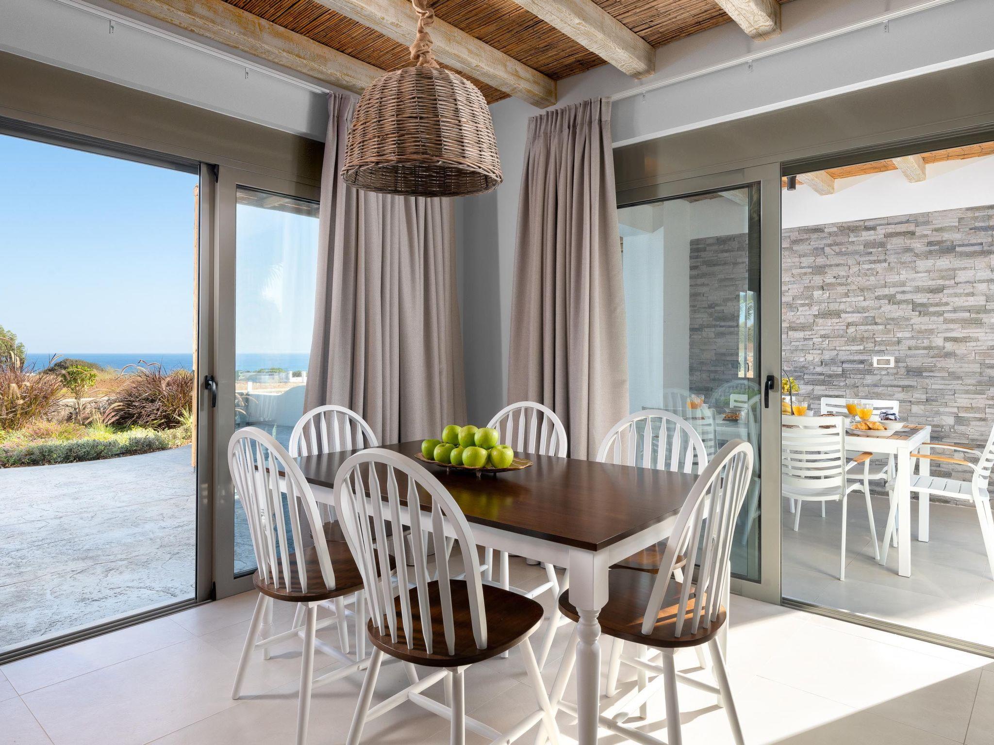 On the upper level, Pounentis villa, offers 2 spacious double bedded rooms. Two bedrooms owns an en-suite bathroom with a stylish shower and a chic furnished balcony with a remarkable view to the sea. On the ground floor there’s a fully equipped kitchen and a spacious open plan dining / living area which has a comfy double sofa- bed one extra bathroom with a shower and one bedroom with double bed as well as a bathroom with a shower. Guests will also find a flat screen with satellite channels. The cozy living room opens to an inspiring furnished veranda with direct access to the architectural statement of the villa, the swimming pool along with the BBQ facilities. The private pool area in warm colors has stylish sunbeds with comfortable cushions and parasols encircled by lush lawns and a well-tended garden. There, you can work on your tan and enjoy the unique Greek summer weather. Pounentis Villa is situated next to Maistros Villa. These two identical villas ensure complete privacy for guests, each featuring its own private pool and amenities.