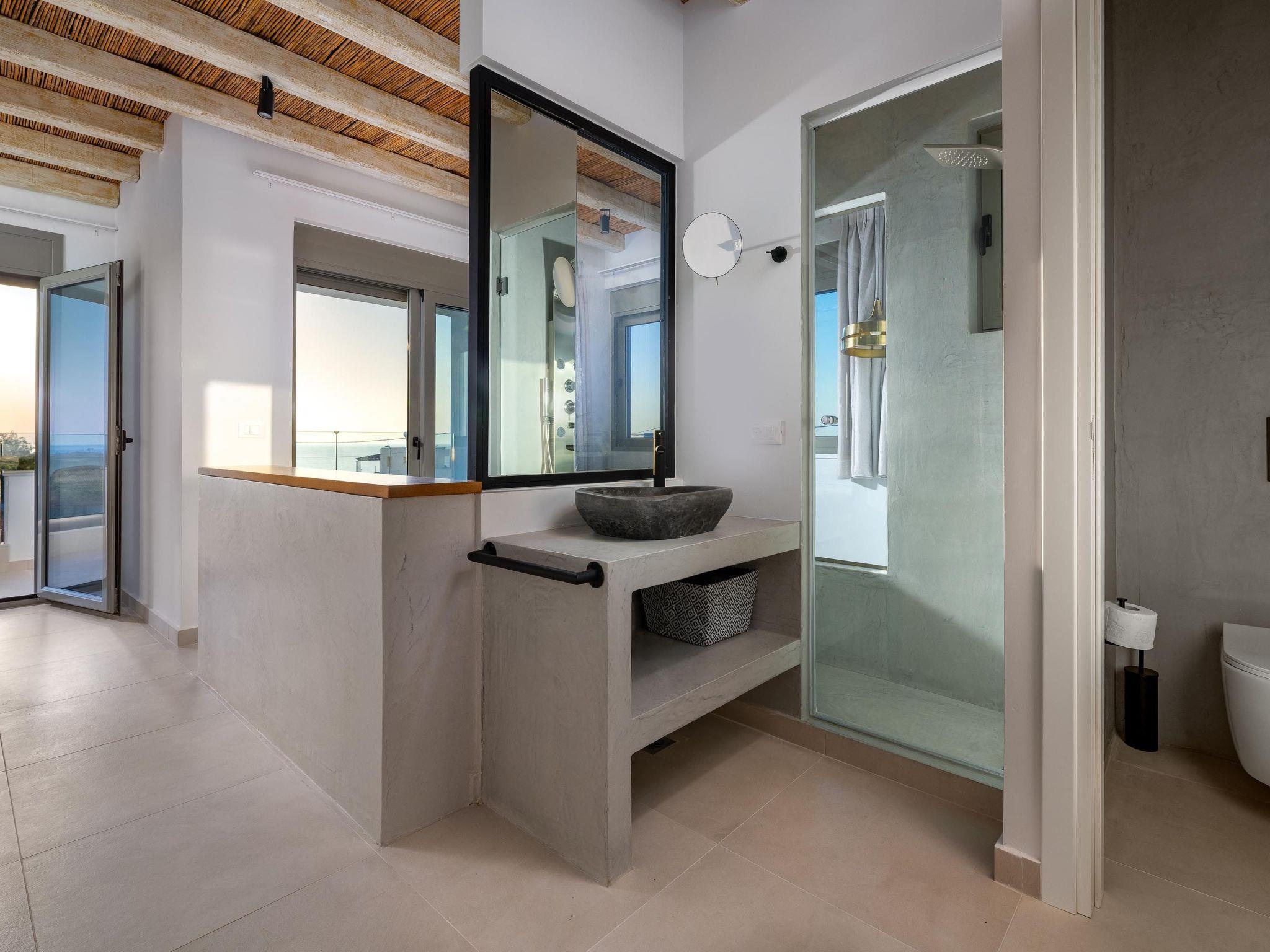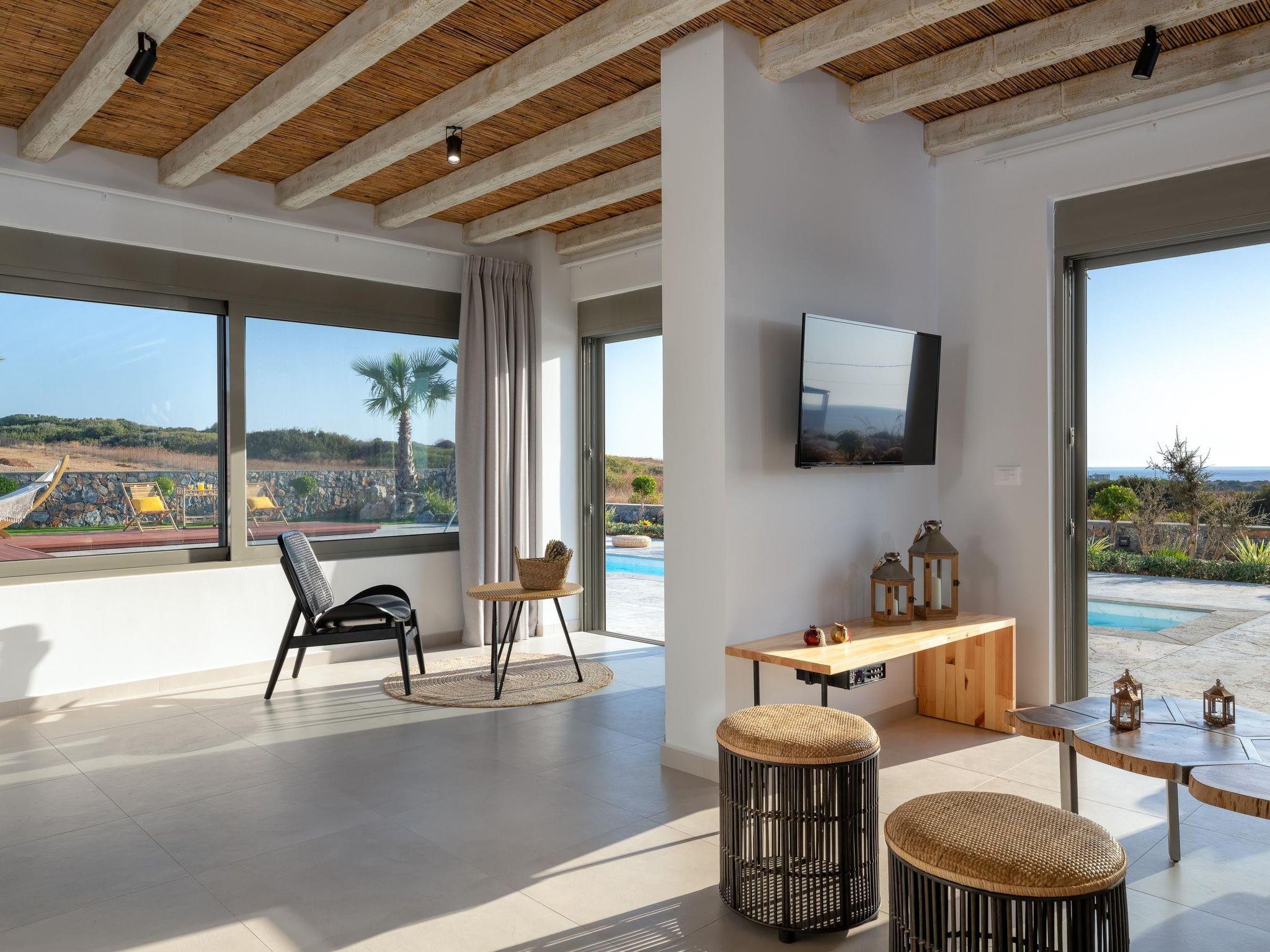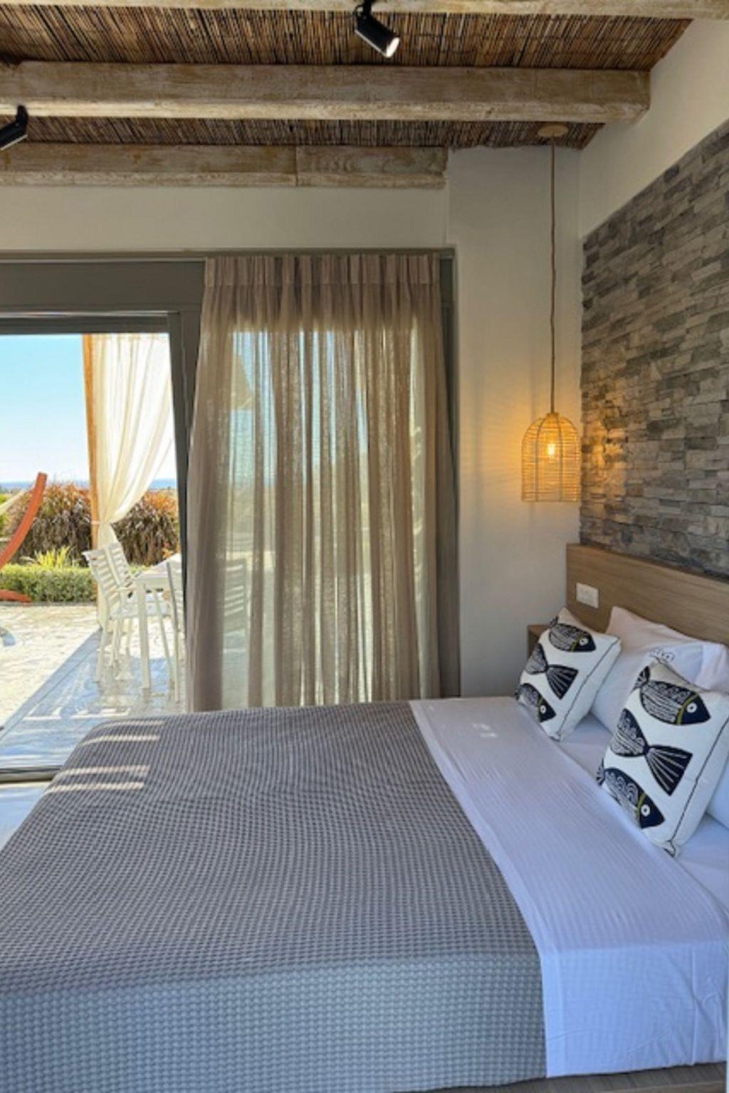 On the upper level, Maistros villa, offers 2 spacious double bedded rooms. Two bedrooms owns an en-suite bathroom with a stylish shower and a chic furnished balcony with a remarkable view to the sea. On the ground floor there’s a fully equipped kitchen and a spacious open plan dining / living area which has a comfy double sofa- bed one extra bathroom with a shower and one bedroom with double bed as well as a bathroom with a shower. Guests will also find a flat screen with satellite channels. The cozy living room opens to an inspiring furnished veranda with direct access to the architectural statement of the villa, the swimming pool along with the BBQ facilities. The private pool area in warm colors has stylish sunbeds with comfortable cushions and parasols encircled by lush lawns and a well-tended garden. There, you can work on your tan and enjoy the unique Greek summer weather. Pounentis Villa is situated next to Maistros Villa. These two identical villas ensure complete privacy for guests, each featuring its own private pool and amenities.