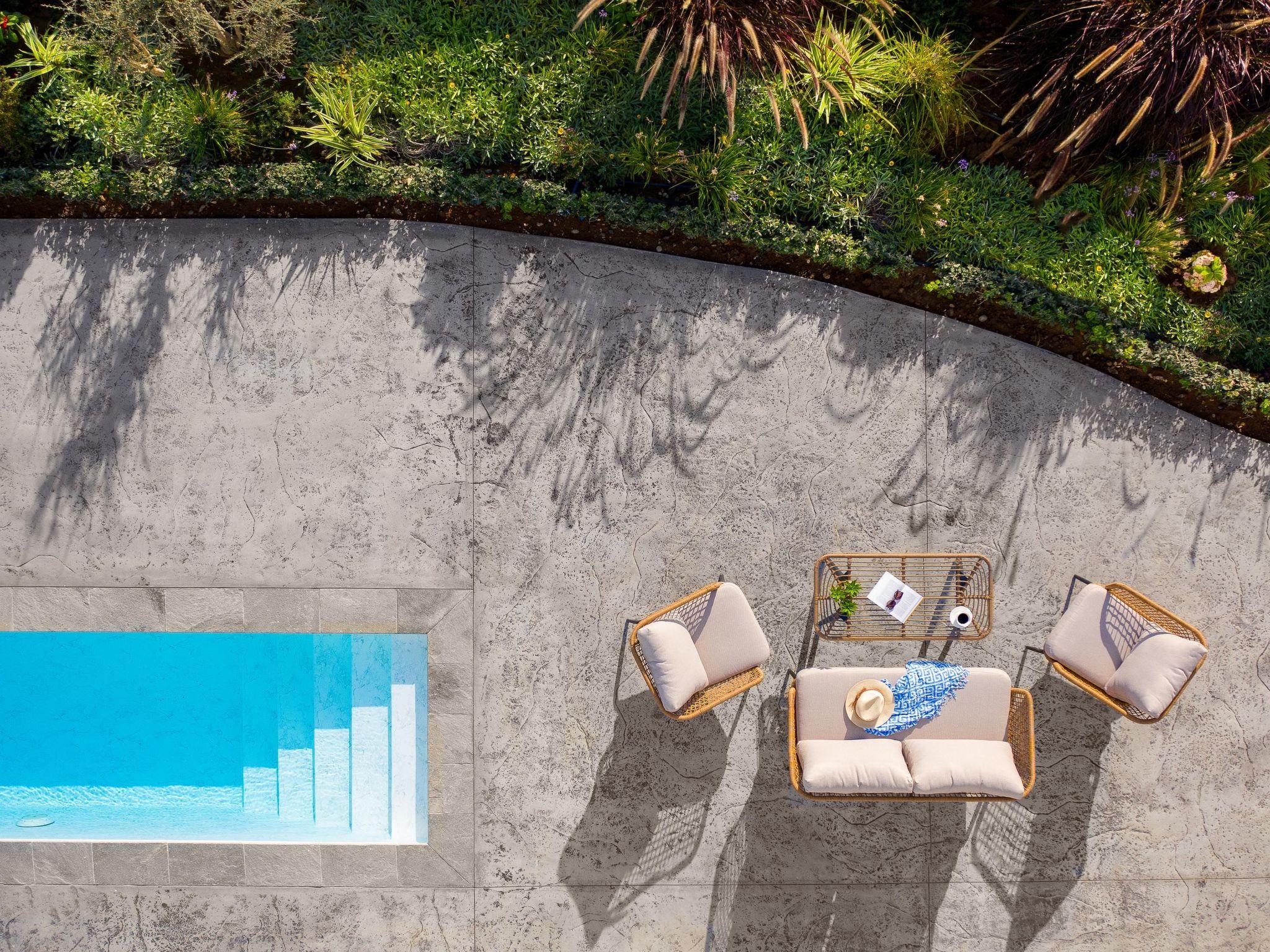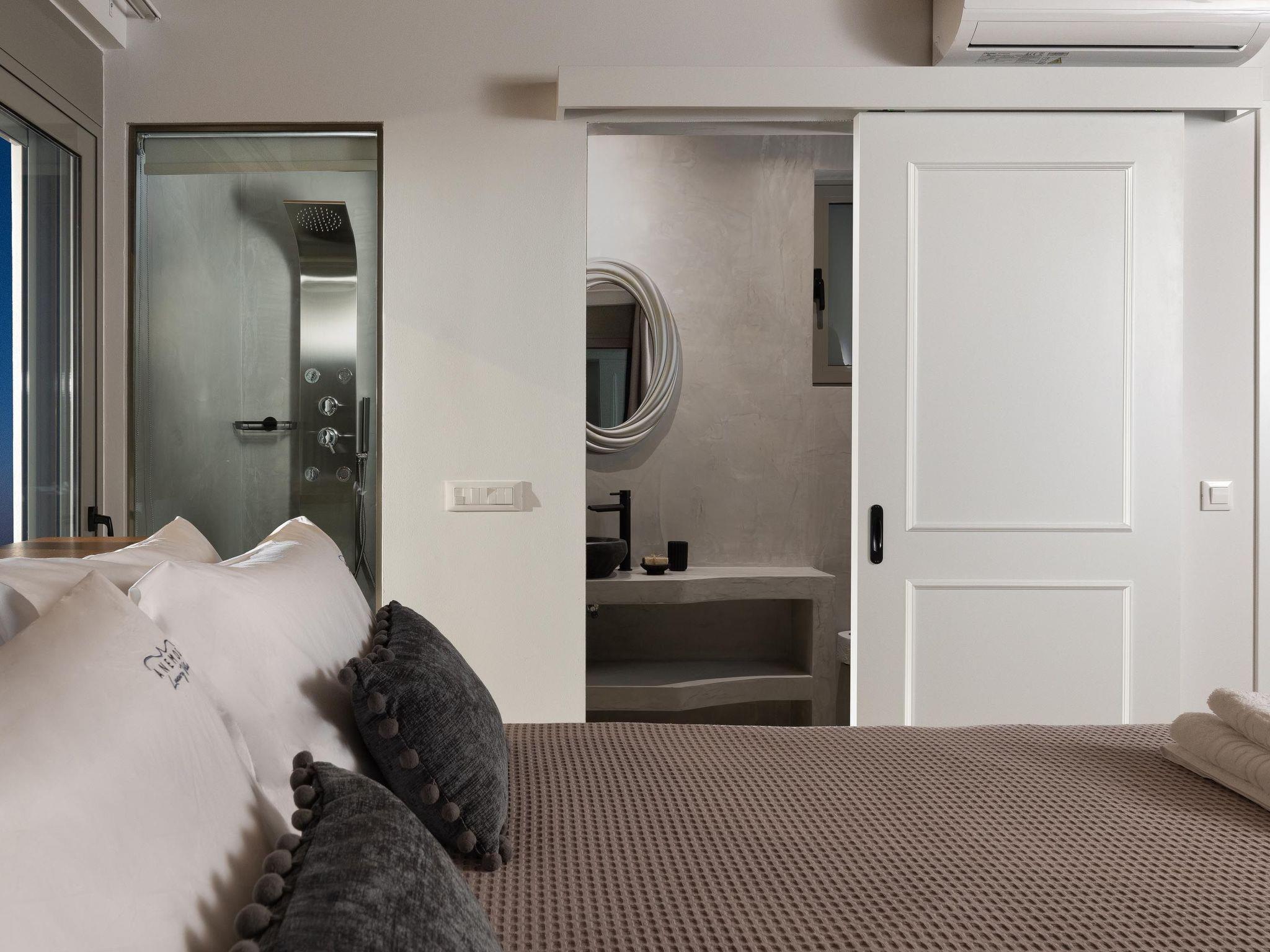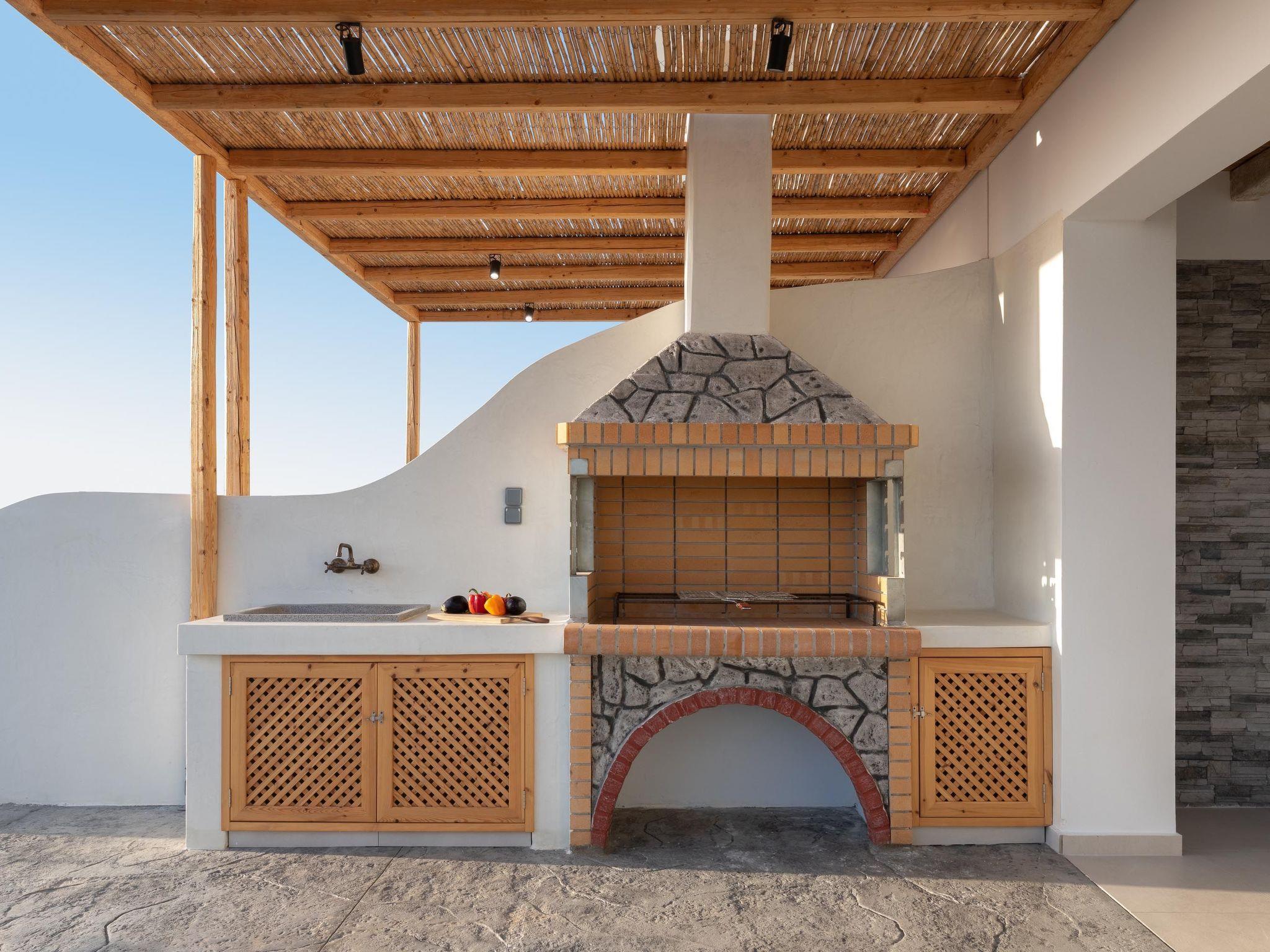 On the upper level, Maistros villa, offers 2 spacious double bedded rooms. Two bedrooms owns an en-suite bathroom with a stylish shower and a chic furnished balcony with a remarkable view to the sea. On the ground floor there’s a fully equipped kitchen and a spacious open plan dining / living area which has a comfy double sofa- bed one extra bathroom with a shower and one bedroom with double bed as well as a bathroom with a shower. Guests will also find a flat screen with satellite channels. The cozy living room opens to an inspiring furnished veranda with direct access to the architectural statement of the villa, the swimming pool along with the BBQ facilities. The private pool area in warm colors has stylish sunbeds with comfortable cushions and parasols encircled by lush lawns and a well-tended garden. There, you can work on your tan and enjoy the unique Greek summer weather. Pounentis Villa is situated next to Maistros Villa. These two identical villas ensure complete privacy for guests, each featuring its own private pool and amenities.