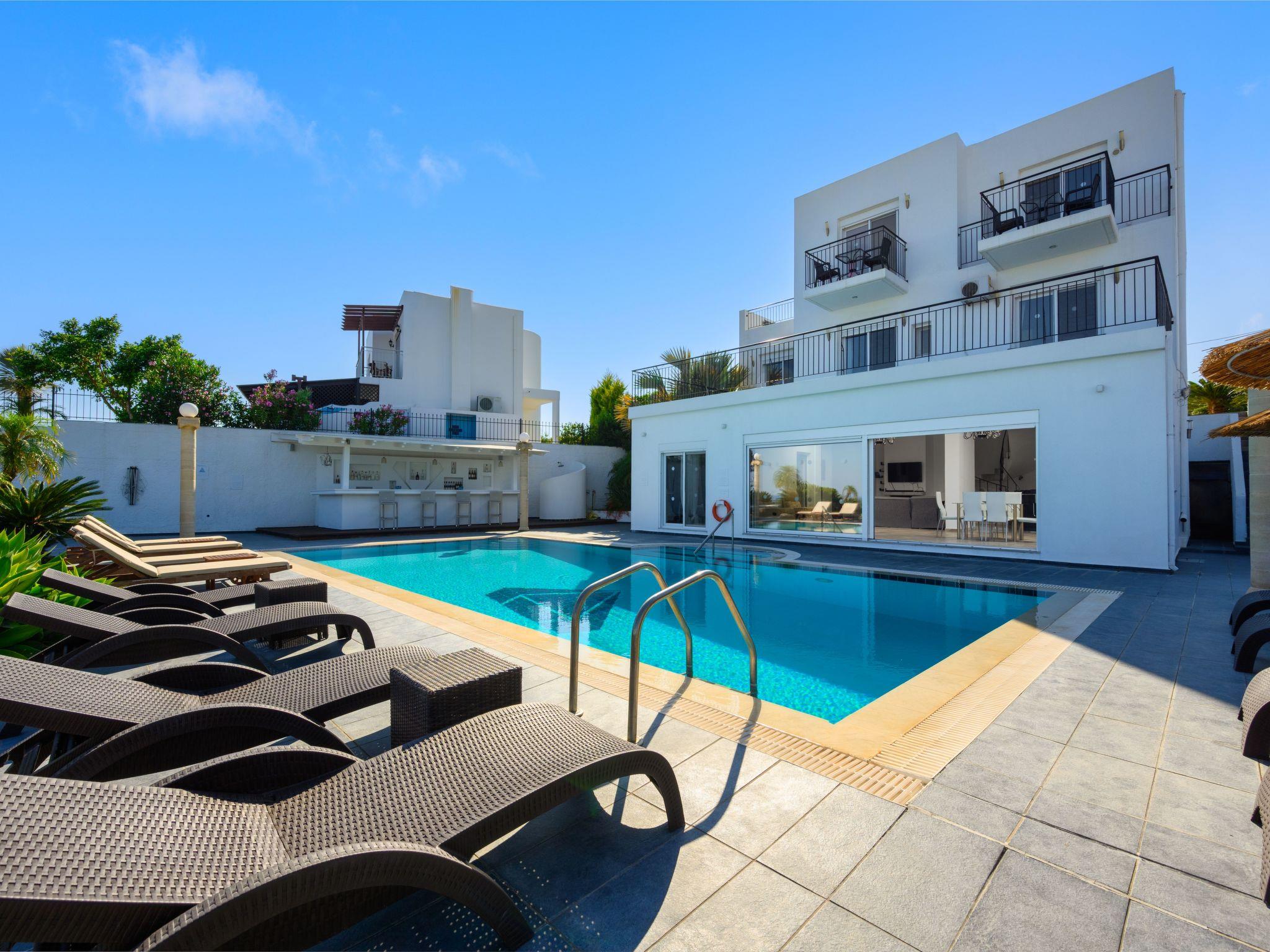 This incredible villa offers 4 fantastic bedrooms, each of which is fully airconditioned and offers an ensuite bathroom. Also, all bedrooms have a flat-screen TV with cable channels and a balcony. From the balconies, you can admire the beautiful emerald waters of Rhodes. Two of the bedrooms have double beds. One of the bedrooms offers a double bed and bunk beds and the other bedroom has twin beds. Also, there is a single sofa bed in the living room. Two of the bathrooms have a bathtub and the rest two have showers. There’s an open plan fully equipped kitchen, designed in sophisticated tones, suitable for any meal preparation. Guests will find a cozy living room and a seating area where you can enjoy your meal. There’s free Wi-Fi access throughout the property. Outdoors, there’s a fantastic private swimming pool with its sunbeds where you can refresh and enjoy the summer sun privately. This amazing villa also offers an outdoor bar, surrounded by gardening, where you can prepare drinks, put music and have fun with your friends or family. Also, there’s a furnished area and BBQ facilities to enjoy a delicious meal.