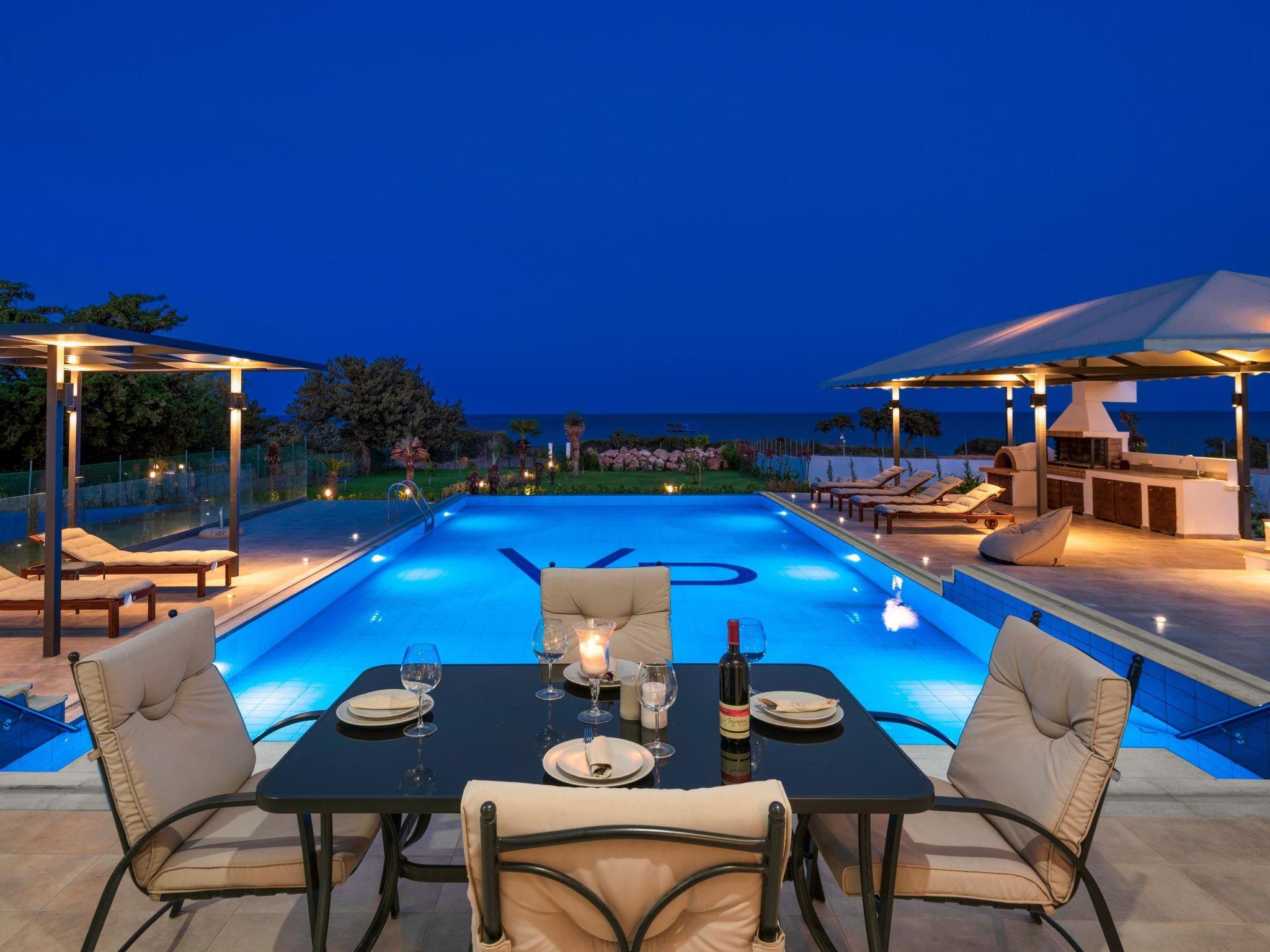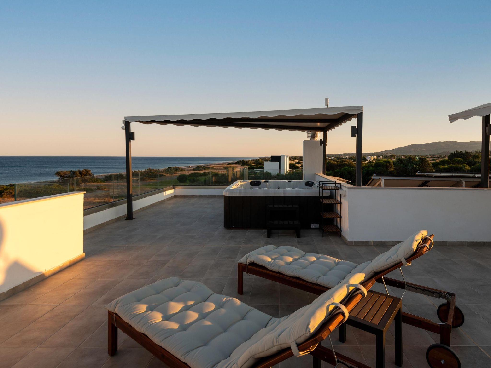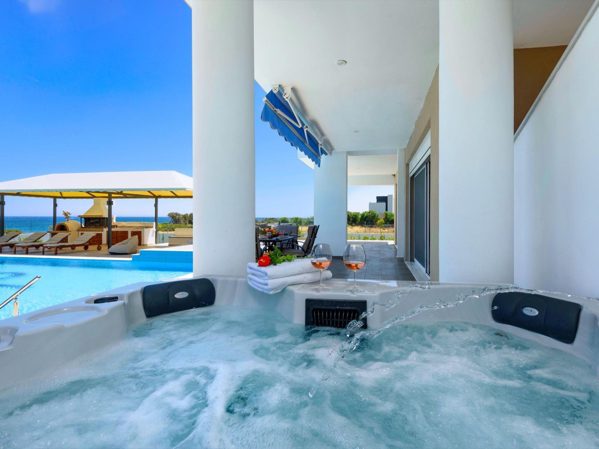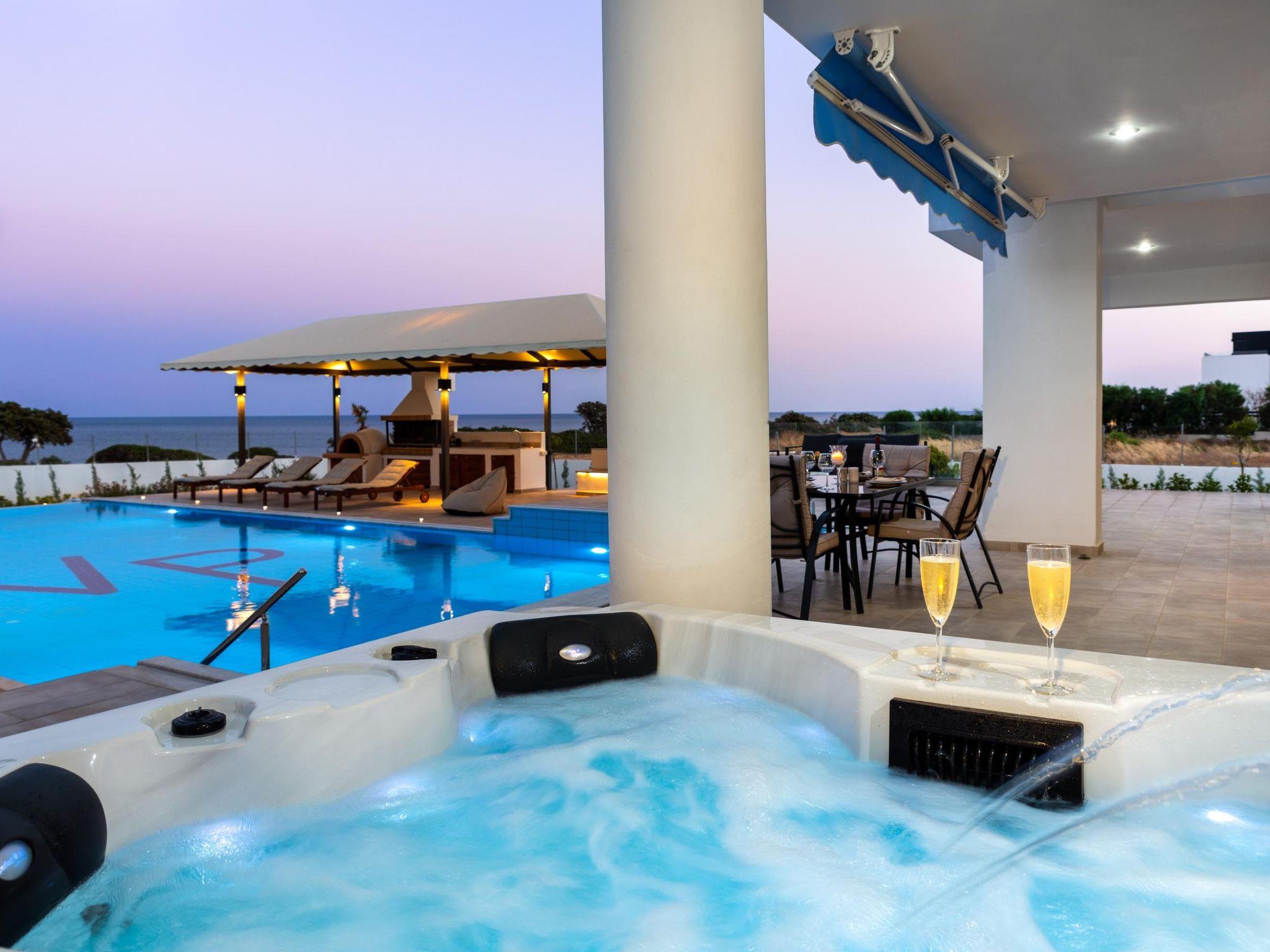 Viviane Paulos Villa is a beachfront villa located in the unspoiled south part of the island, Gennadi. It offers a private swimming pool and 2 heated jacuzzies as well as an easy access to the closest beach in a walking distance of 5 minutes. This beautiful villa also offers sunbeds at the beach for extra fun. Viviane Paulos Villa conveniently accommodates up to 12 guests. There’s an access to the upper floors from the exterior stairs. Also, in the basement, it’s the house of a gentle couple, the pool maintenance man and the cleaning lady of the villa.This incredible beachfront villa features large interior spaces with an elegant design that creates a welcoming atmosphere, as well as exceptional outdoor spaces with great gardening and amenities. There are 5 fully airconditioned bedrooms with double beds and flat screen TVs. Also, there are 2 single sofa beds in the living room. Guests will find 2 wonderful bathrooms with showers as well as an outdoor wc. Also, there’s an open plan kitchen, fully equipped for any meal preparation as well as a living room and a dining area. Outdoors, the villa is equally impressive as indoors. It offers beautiful gardening surrounding the magnificent pool area and the heated jacuzzi that are equipped with parasols and sun beds, creating the perfect setting for a relaxed time under the golden rays of the Greek sun. Also, the villa offers incredible furnished balconies and a heated jacuzzi on the rooftop. There’s an incredible BBQ installation and a furnished area where guests can enjoy a truly unique outdoor gathering. There’s an access to the upper floors from the exterior stairs. This beautiful villa also offers sunbeds at the beach for extra fun.