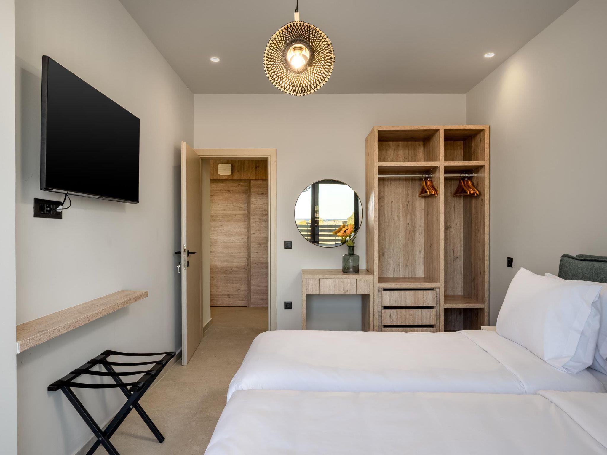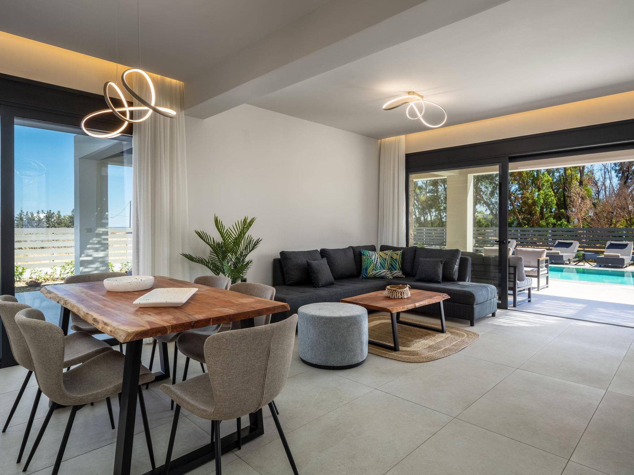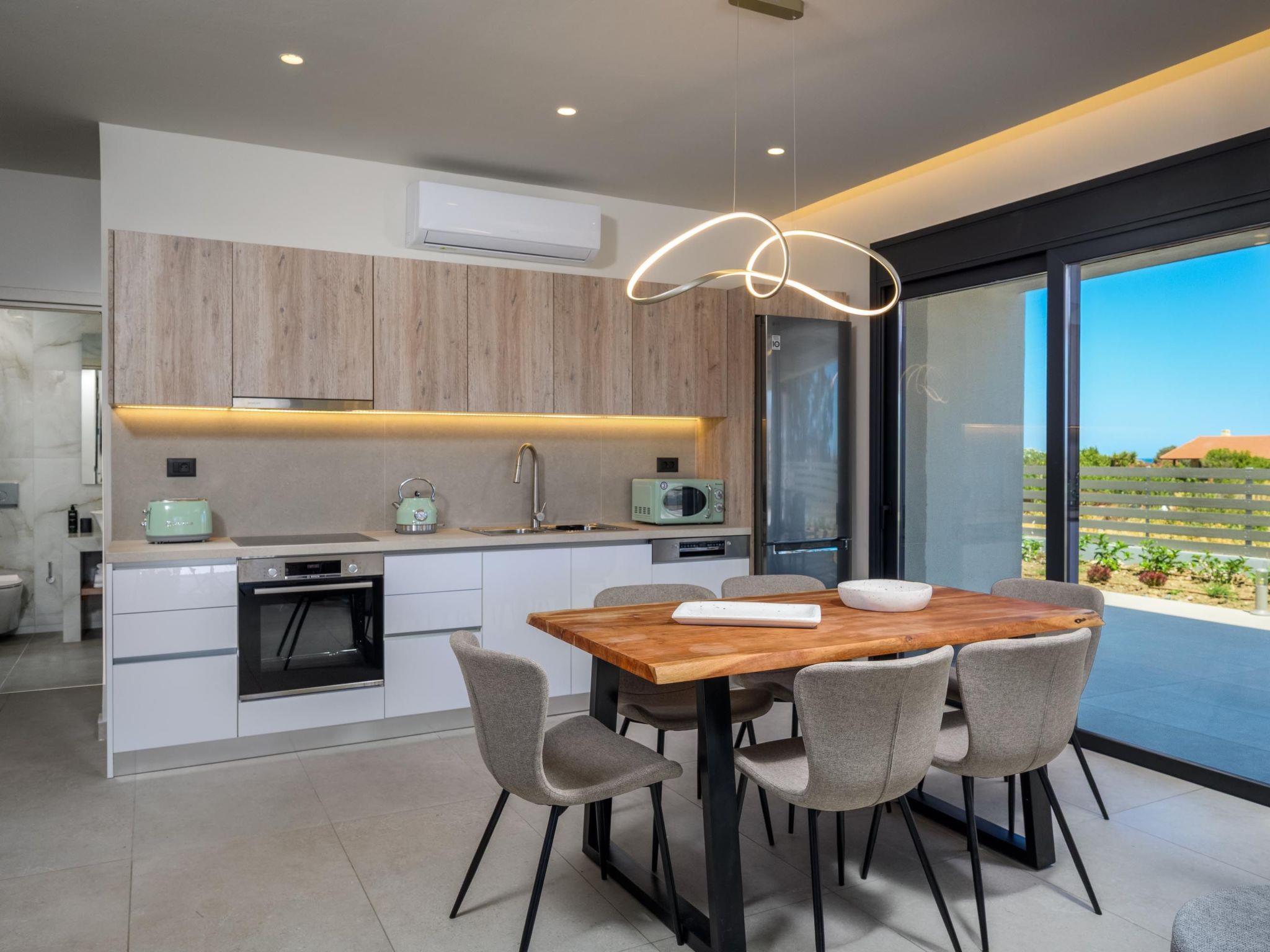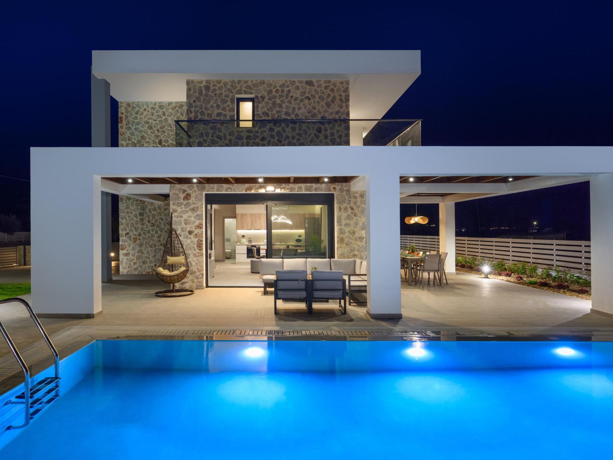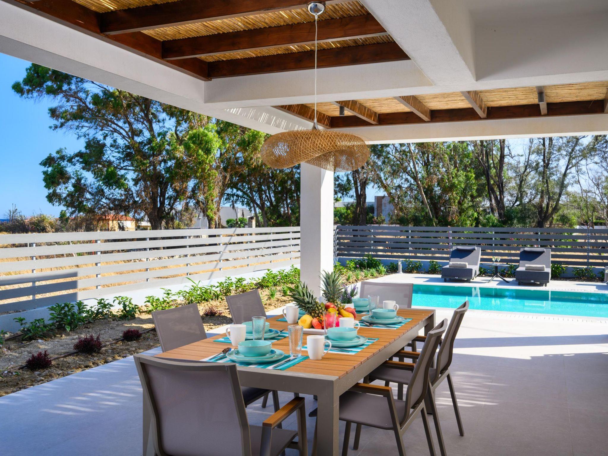 Terra Magna Cèlia Villa, located on the right side, comfortably accommodates up to six guests. The villa features three bedrooms—two on the first floor with double beds and ensuite bathrooms with showers, and one on the ground floor with two single beds that can be combined into a double. There is also a bathroom with a shower on the ground floor. The fully equipped kitchen allows for easy meal preparation. Outside, guests can enjoy a private swimming pool, a gas BBQ, and a spacious outdoor dining area with comfortable furniture, perfect for relaxing or entertaining. Just a short walk from the sea, Terra Magna Cèlia Villa offers a peaceful and stylish retreat ideal for families or groups looking for comfort, privacy, and convenience in beautiful Kiotari.