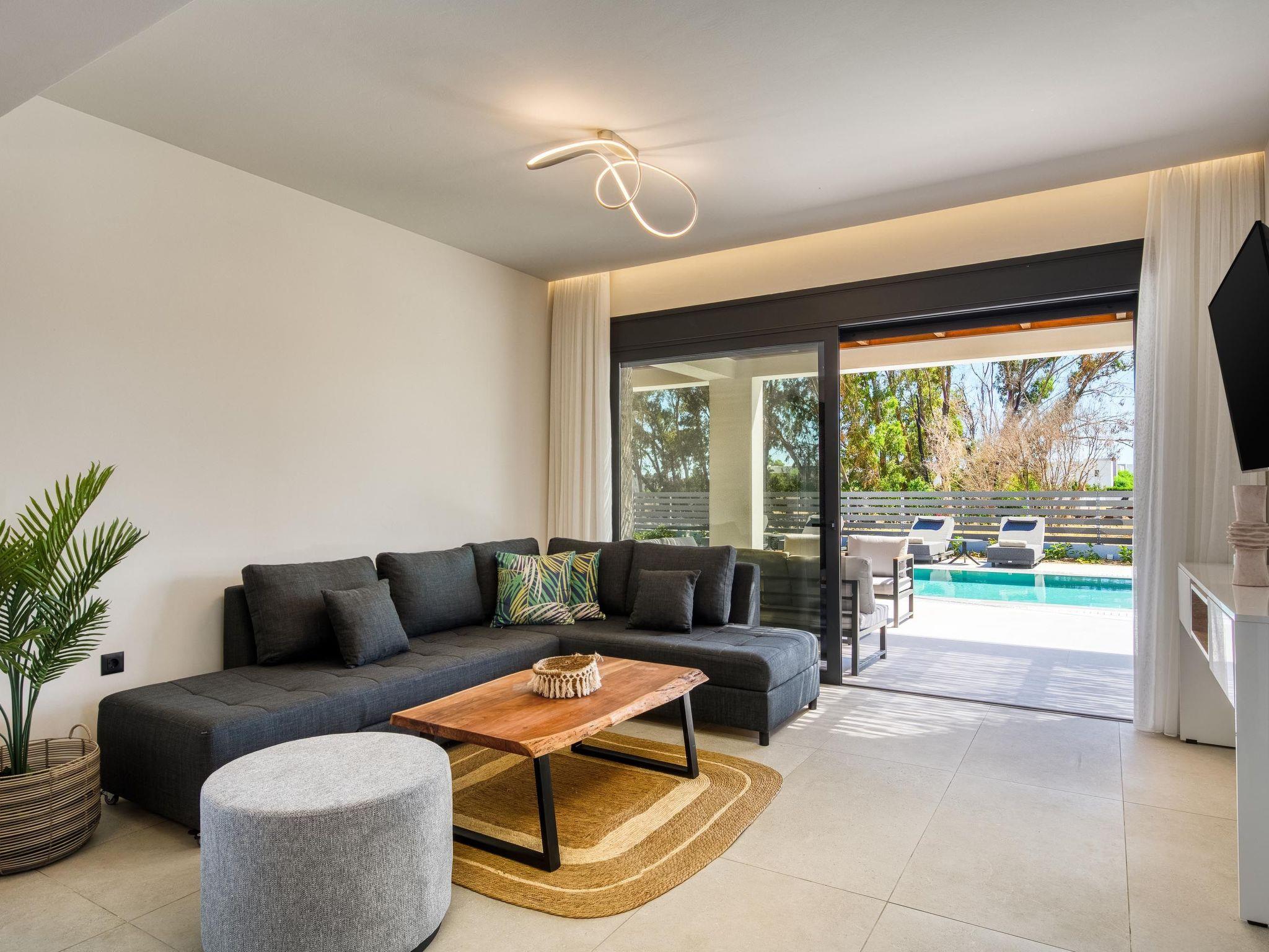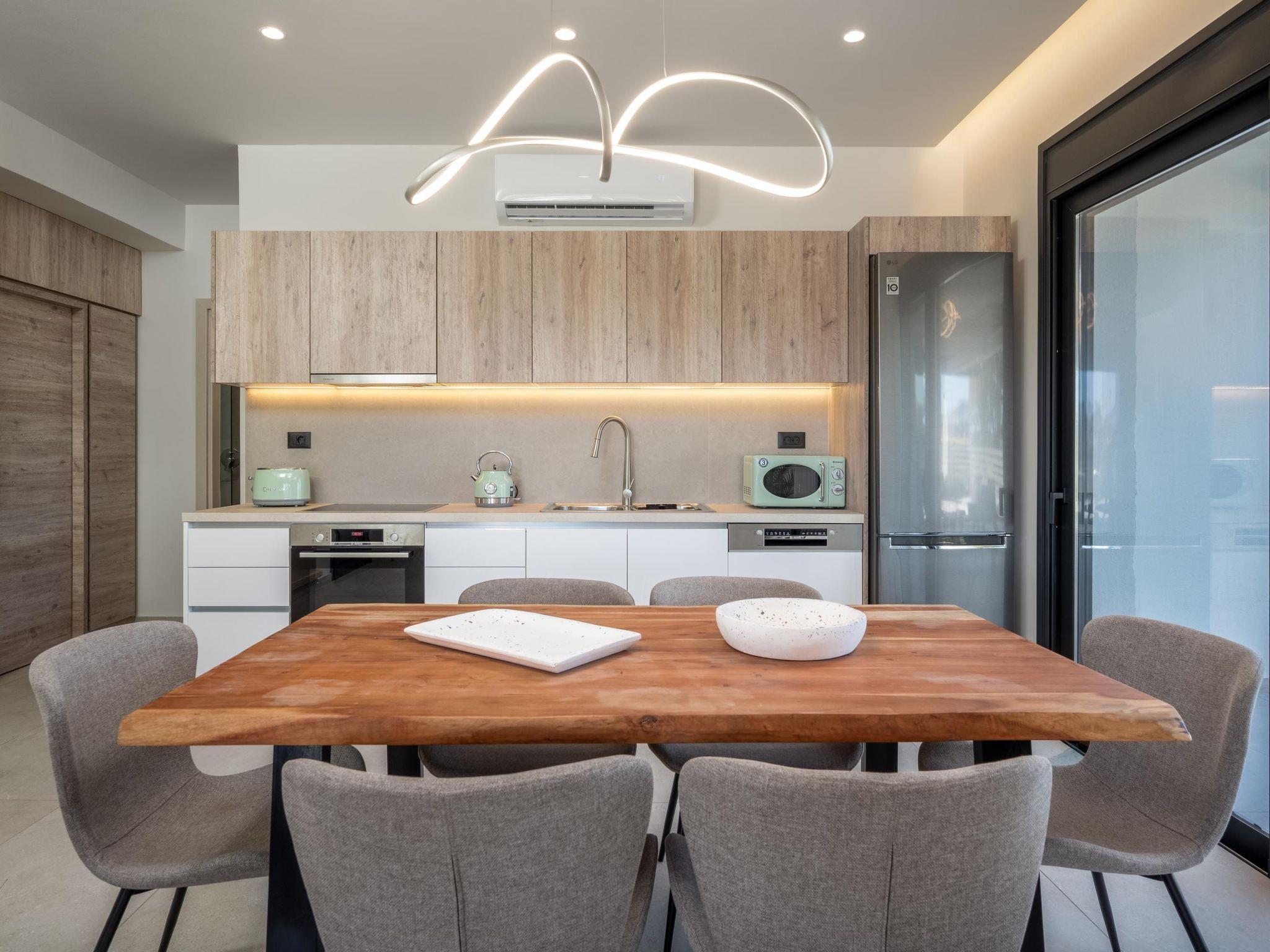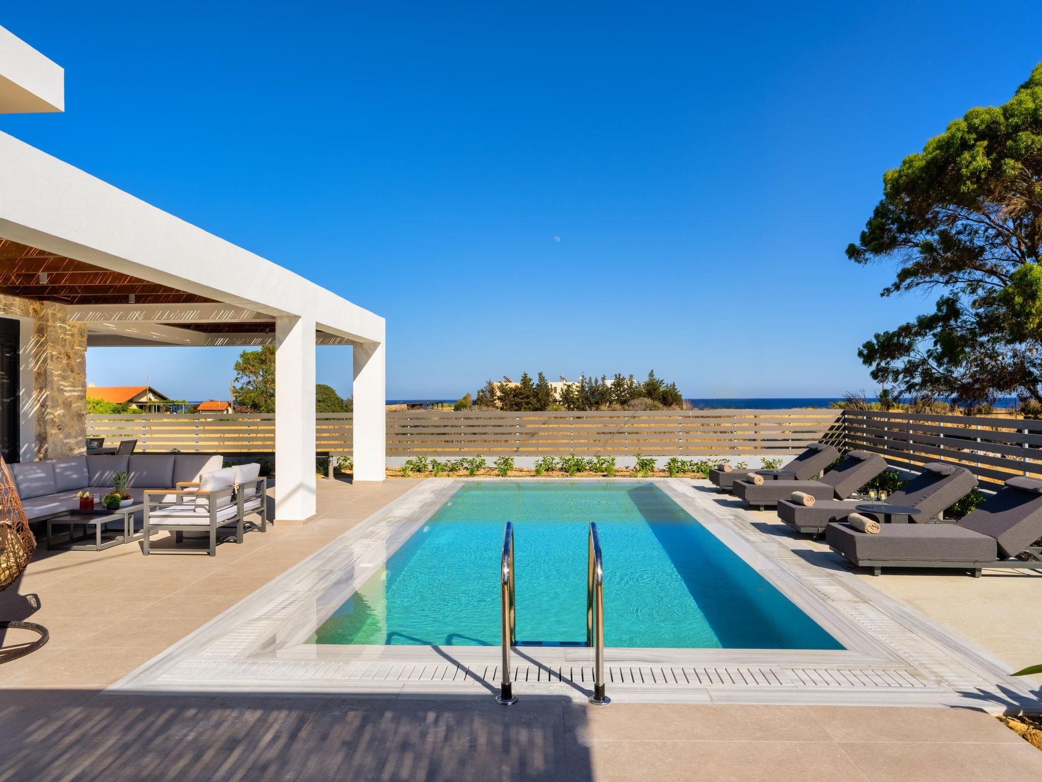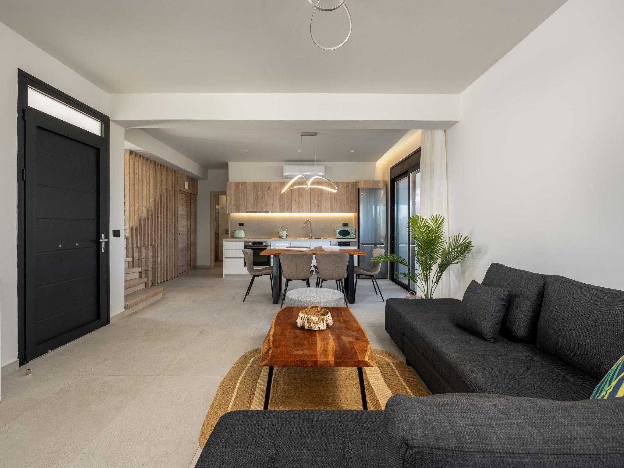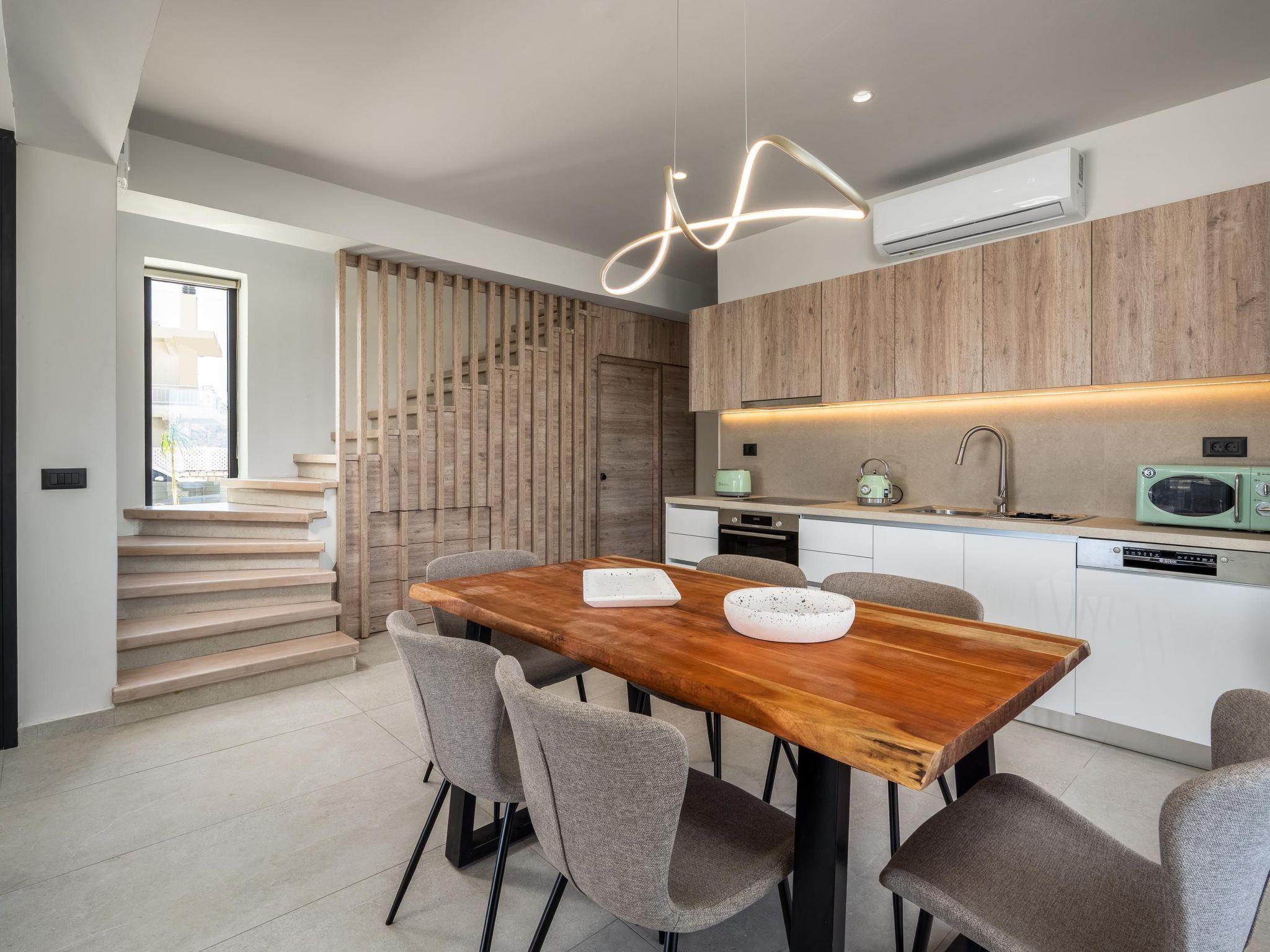 Terra Magna Cèlia Villa, located on the right side, comfortably accommodates up to six guests. The villa features three bedrooms—two on the first floor with double beds and ensuite bathrooms with showers, and one on the ground floor with two single beds that can be combined into a double. There is also a bathroom with a shower on the ground floor. The fully equipped kitchen allows for easy meal preparation. Outside, guests can enjoy a private swimming pool, a gas BBQ, and a spacious outdoor dining area with comfortable furniture, perfect for relaxing or entertaining. Just a short walk from the sea, Terra Magna Cèlia Villa offers a peaceful and stylish retreat ideal for families or groups looking for comfort, privacy, and convenience in beautiful Kiotari.