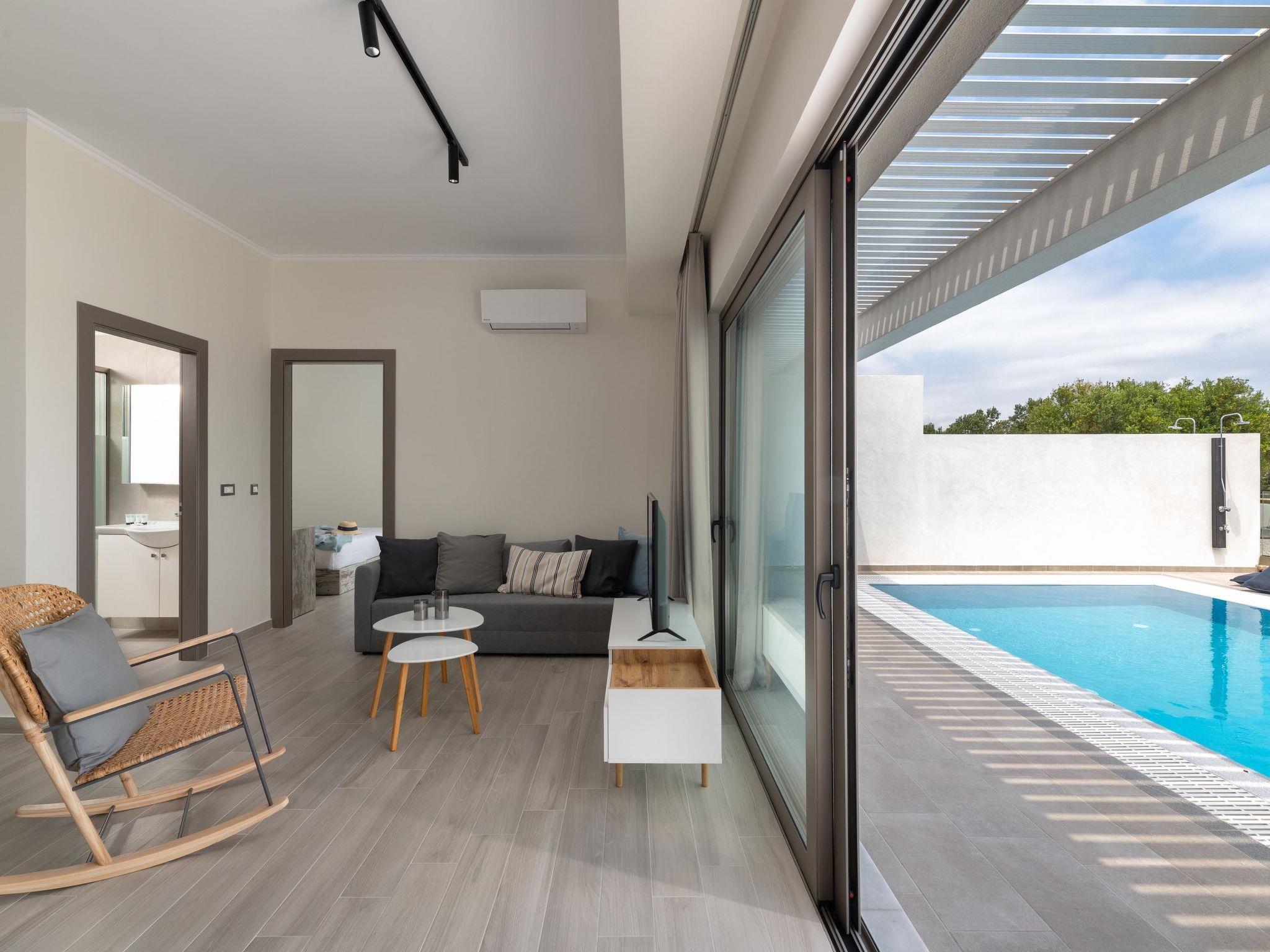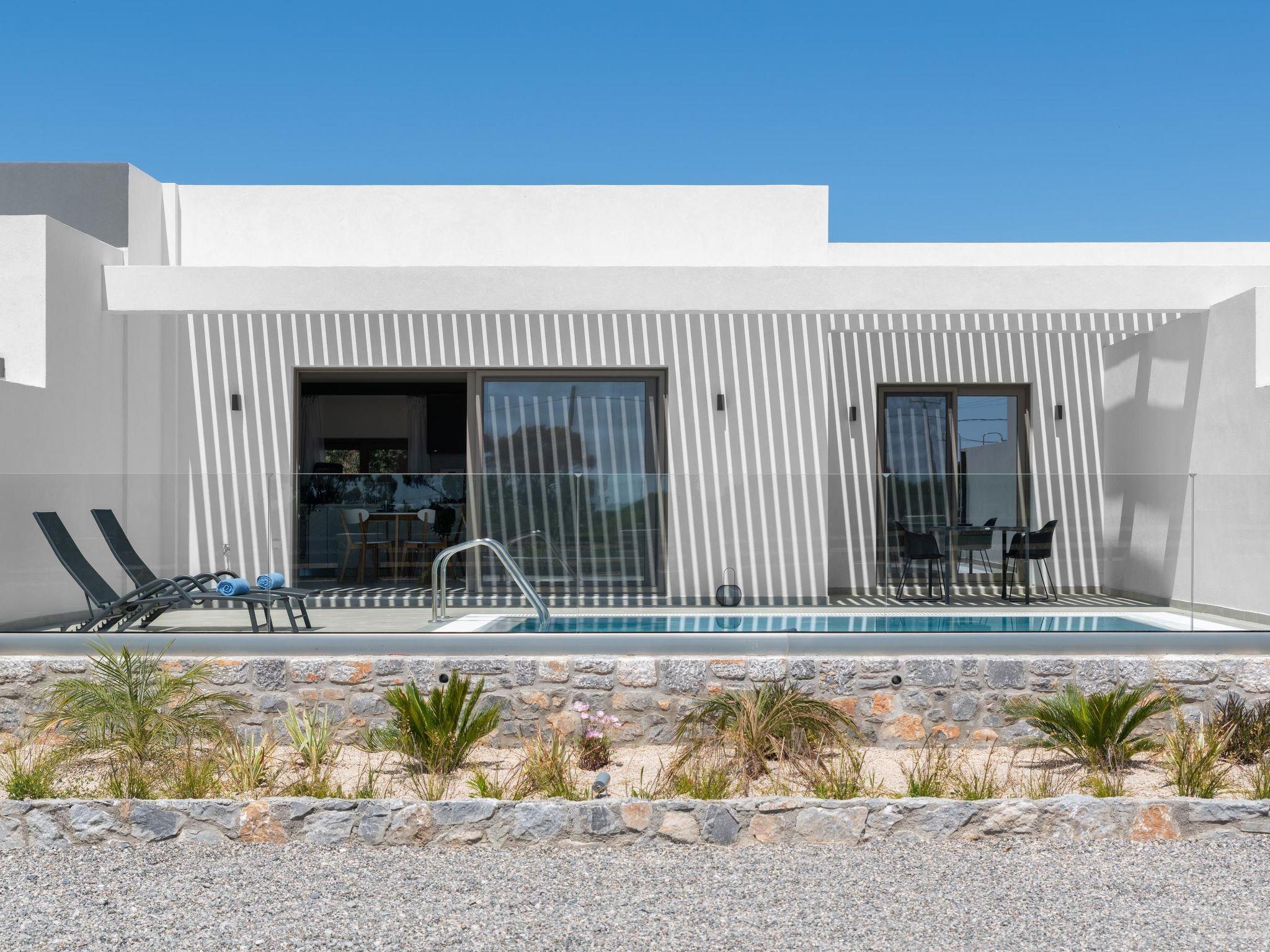 Facing on Armonia suites guests will find Eleni suite on the left side of the center suites of the property which can accommodate up to 3 people. The suite has one comfy bedroom with a spacious double bed and a sunny balcony. Also, the suite owns a modern sitting/living area with a cozy double sofa bed and a homey bathroom with a shower. The property provides a flat screen with satellite channels and free Wi-Fi. The minimal styled kitchen is fully equipped for any meal preparation of your choice. Guests can relax outside, in the wonderful furnished veranda next to the dreamy swimming pool. The private swimming pool is equipped with unique sunbeds and will offer you enjoyable moments under the Aegean sun.