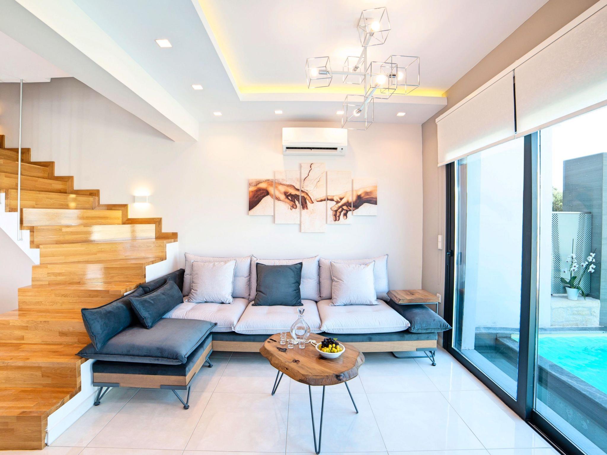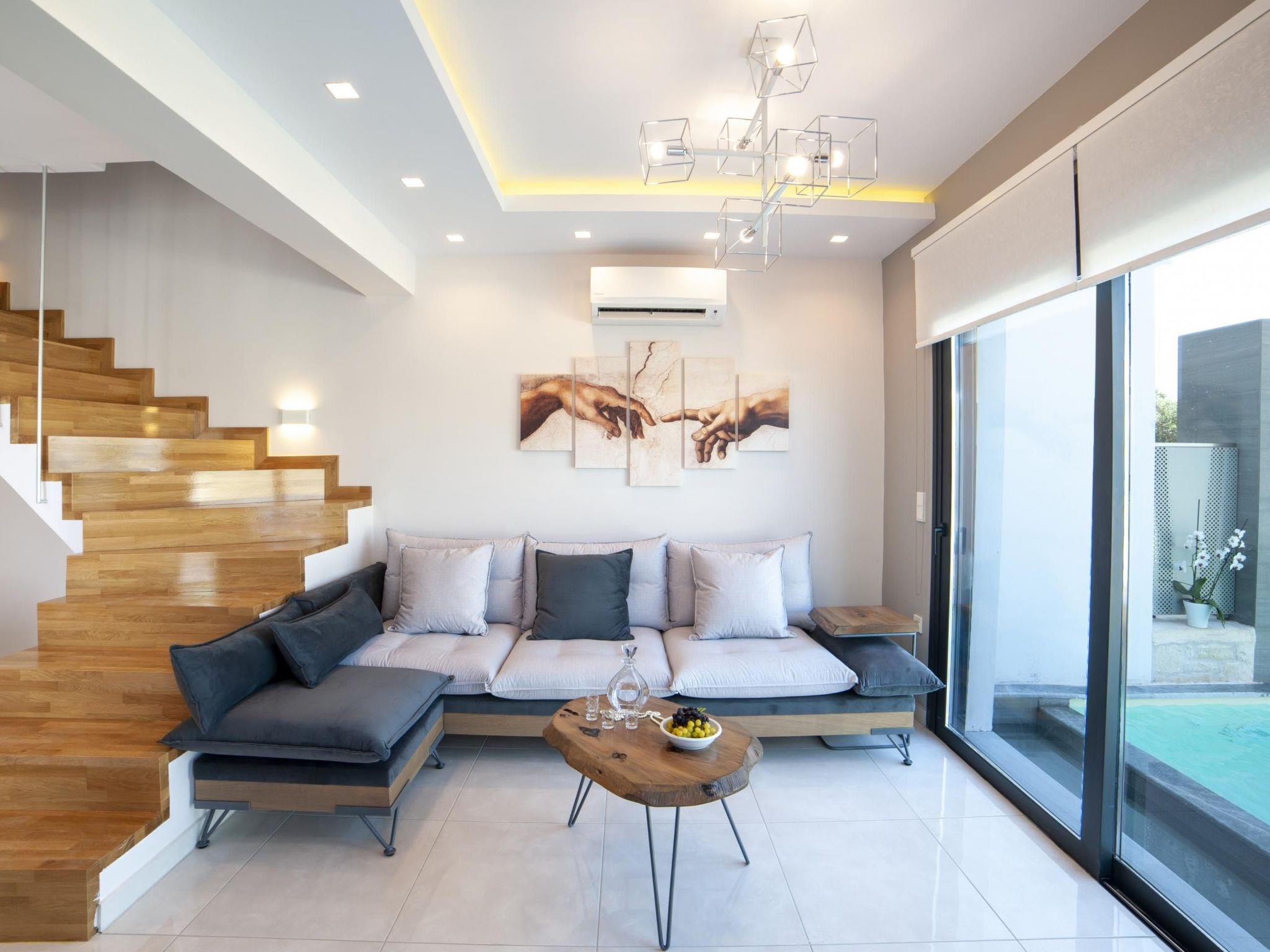 The Perla Villa, with its private pool, is distinguished by its ample space and its graceful ambience. It offers a stylishly designed master bedroom with a comfortable queen-size bed, a comfy second bedroom with twin push-together beds and an elegantly adorned bathroom with a rejuvenating shower. This chic Villa features a living room area with corner sofa, a separate cozy dining room with a fine bathroom with shower and a fully equipped kitchen. Outdoors, a spacious terrace with BBQ and dining area overlooks the Jacuzzi, the private pool and the relaxing sun beds area. Perla Bianca Villa Facilities Ground floor 50sqm * A living room with large Corner Sofa (can accommodate up to two quests) and direct access to the terrace and the pool area * A fully equipped Kitchen with an oven, microwave dishwasher, a fridge, a coffee maker, tea facilities, a toaster and a kettle. * A large bathroom with shower. Upper Floor 50sqm * A bedroom with a queen-size double bed. * A second bedroom with two twin push together beds. * A bathroom with shower. * TV at the living room. * Air-conditioning in all areas. * Free WiFi internet access. * Outdoor dining set (table with chairs). * Washing machine. * Iron and ironing board. * Safe deposit box. * Hair dryer. * Linen and towels. * Toiletries. * Swimming pool towels. * Baby cot. * High chair for children. * Towels and bed linen changed and cleaned every 3 or 4 days. * Private parking area. * Direct access to the swimming pool area. * Private Swimming pool 20sqm * Jacuzzi (for 4-5 quests) or if the jacuzzi is not working is ideal for children. * Sun lounge area with sun beds under a pergola. * BBQ with dining area next to the swimming pool. * Plot 300sqm