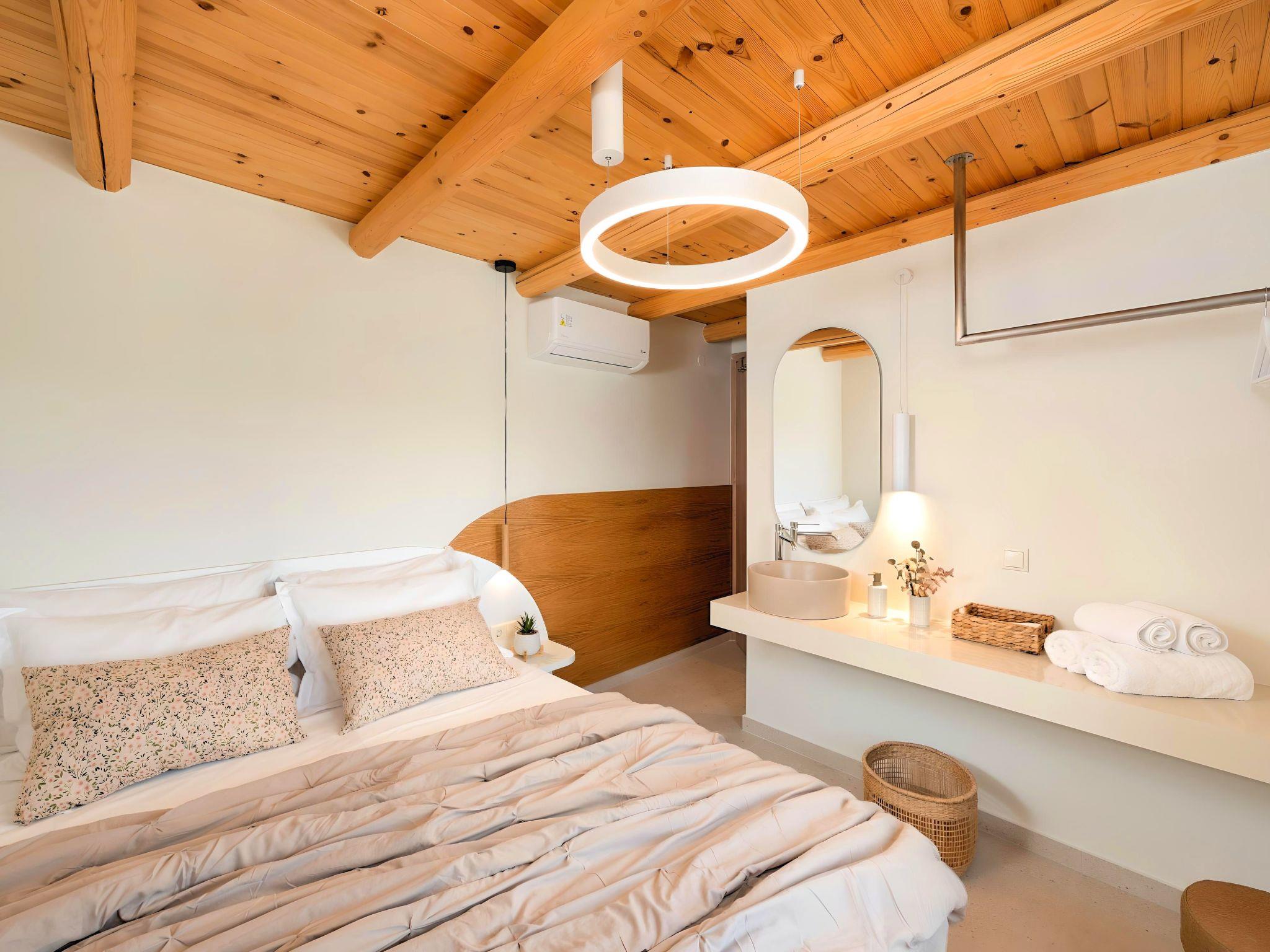 Wood dominates the ceilings, and the lighting creates an idyllic atmosphere. The large beds offer a comfortable sleeping experience, covered with top-quality linens.