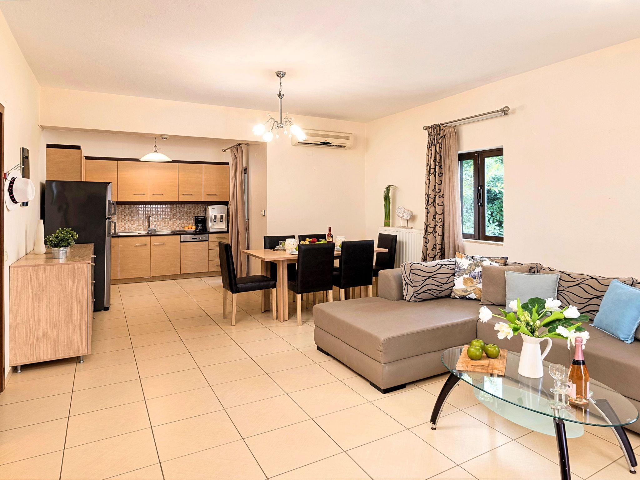 * A spacious living room with sofa beds (can accommodate 2 guests) direct access to the terraces and the pool area.
