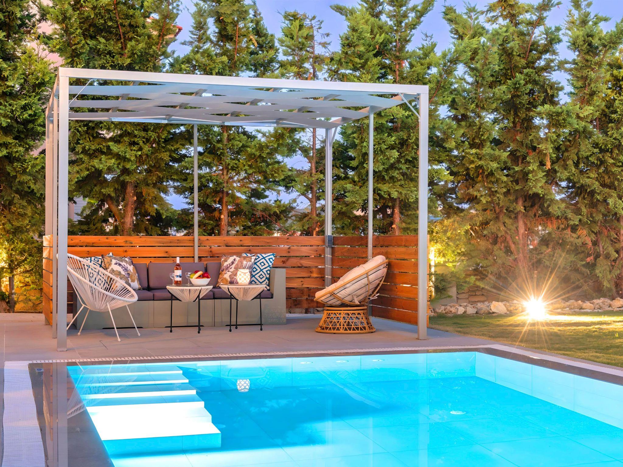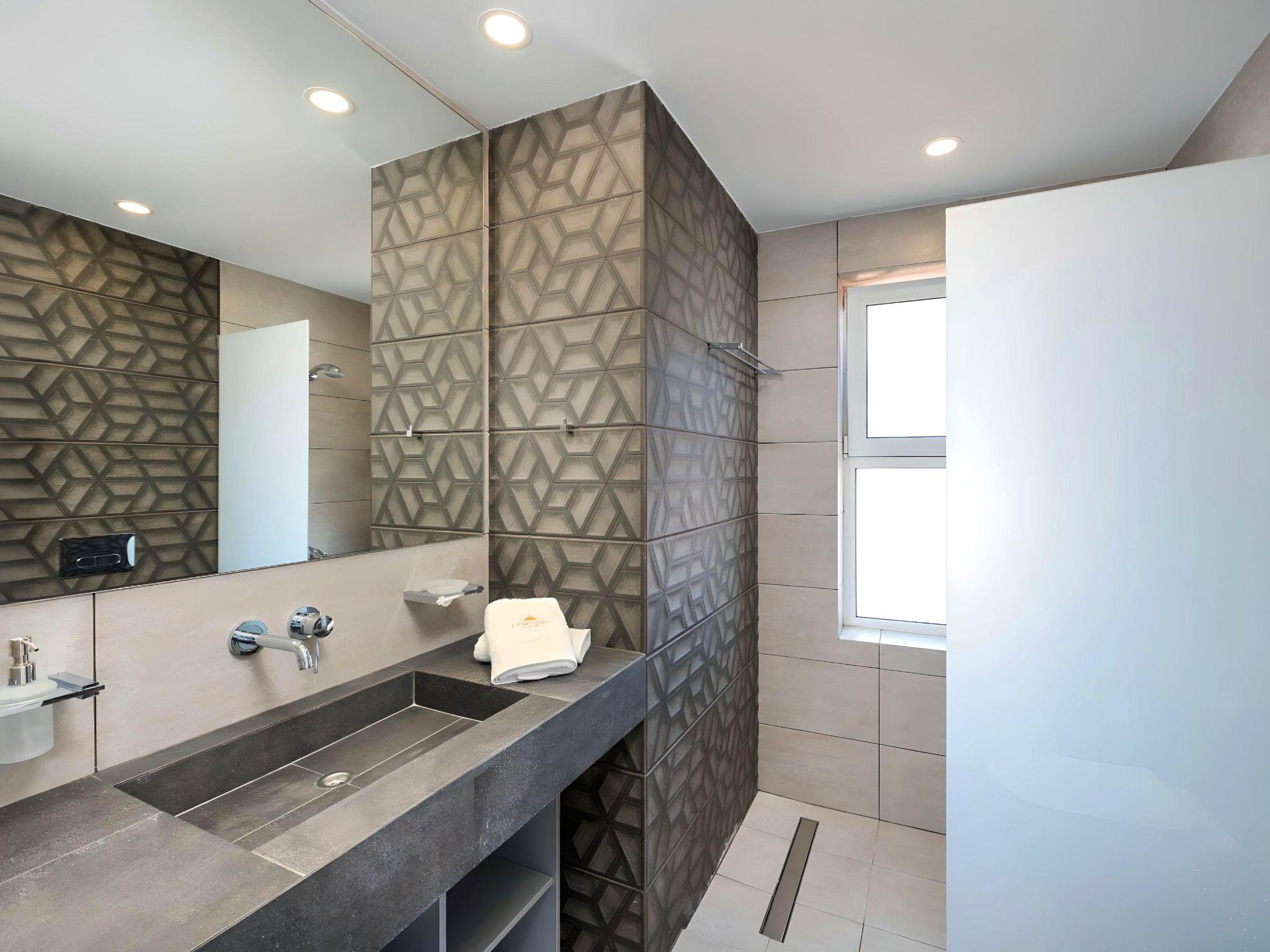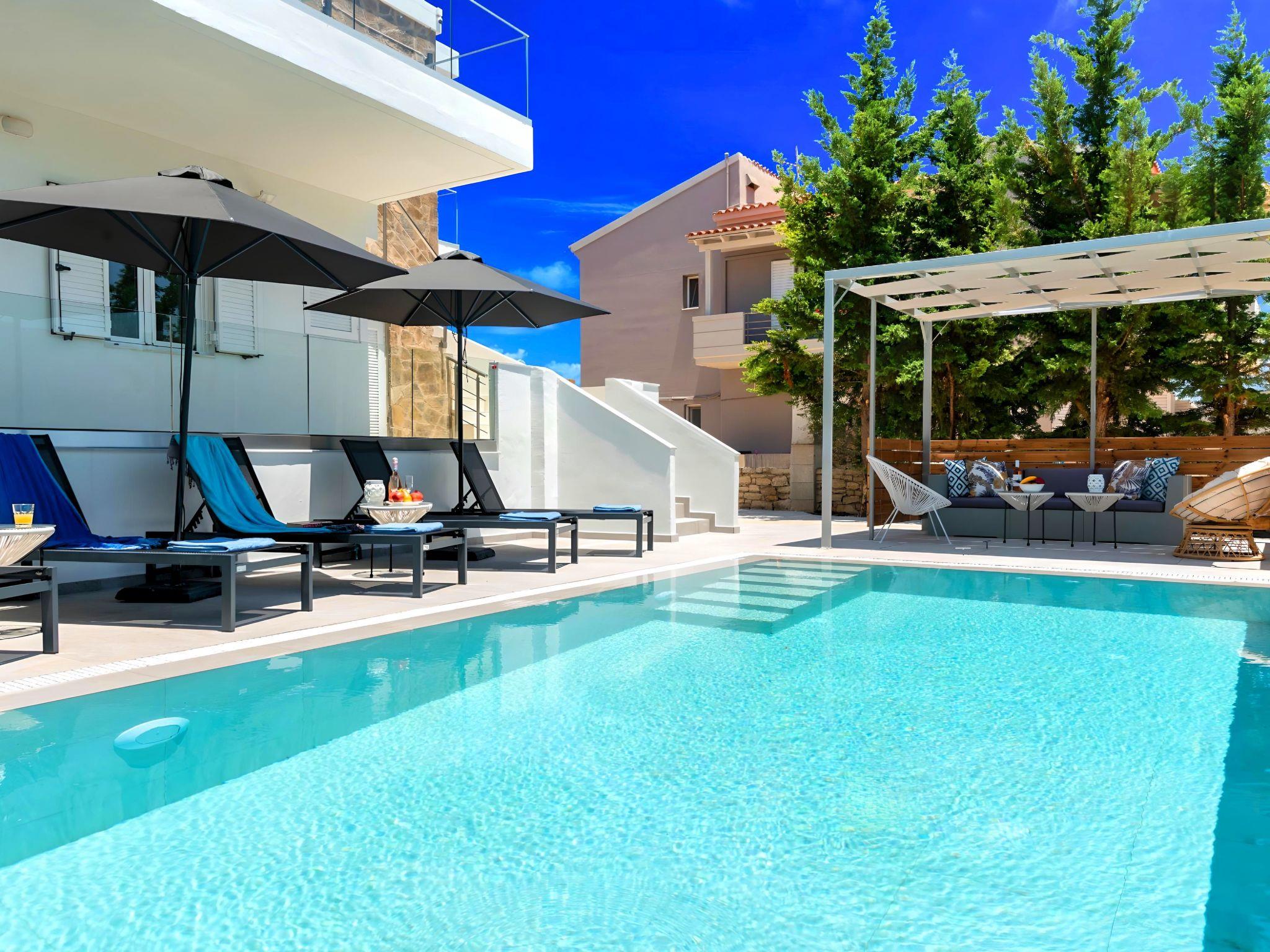 Outside, immerse yourself in the ultimate relaxation with a large swimming pool, perfect for a refreshing dip or leisurely swim. The sun terrace, adorned with comfortable sun loungers and umbrellas, invites you to bask in the warm Mediterranean sun. Enjoy your mornings with a cup of coffee or unwind in the evenings at the outdoor sitting area, ideal for savoring the gentle sea breeze and scenic views.