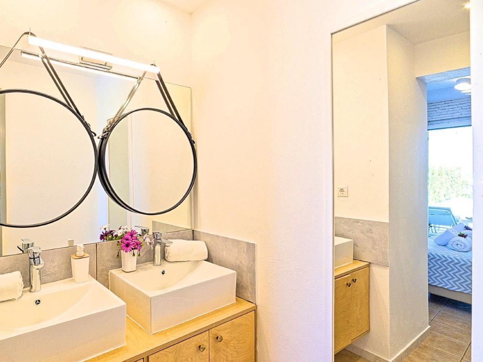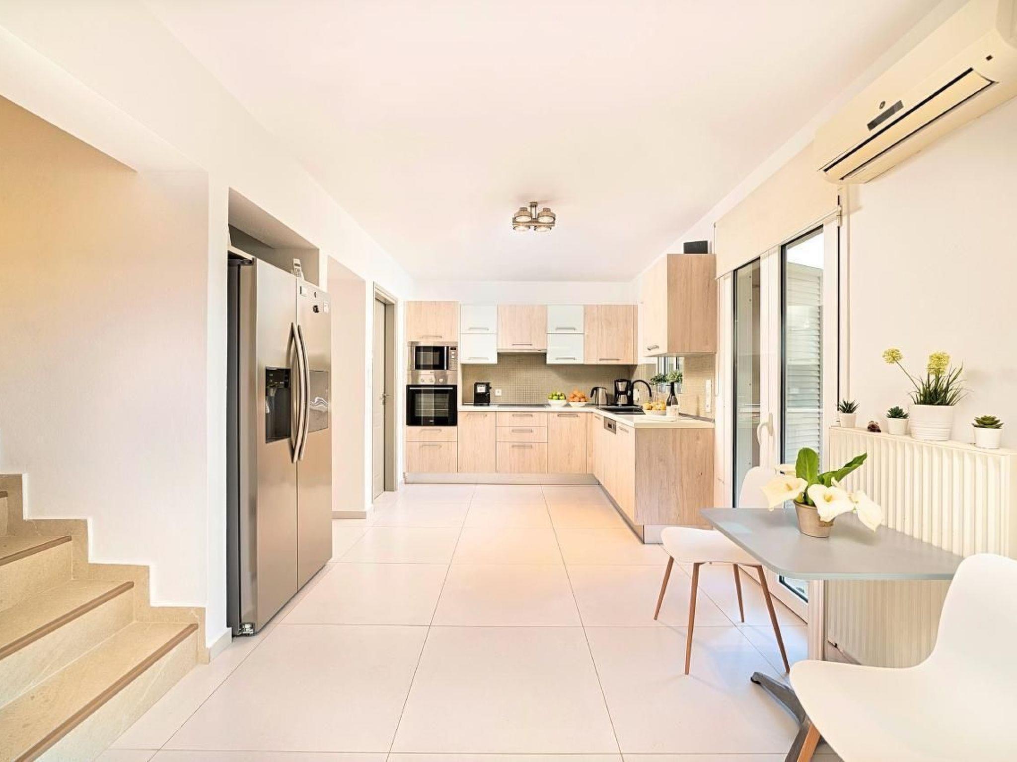 The Mansion is built on 4 levels and can accommodate up to 15 people, all 12 months year round. The first level of the west garden and the pool has 2 independent studios with their own private entrances. The same level of the main building has a lounge with a corner sofa seating 5 people, with an auxiliary kitchen and a spacious bedroom. Outside the same level, at the western garden overlooking the pool, there is a large dining space with sun loungers. Inside, a staircase leads upstairs to the second level of the Mansion. The main entrance from the upper street and the east garden is at this level. This second level has a fully equipped kitchen, a large lounge with comfortable sofas, a guest bathroom and a vast terrace with a dining table. At the third and fourth level there are the master bedroom of the mansion, a large loft bedroom, and two more terraces.