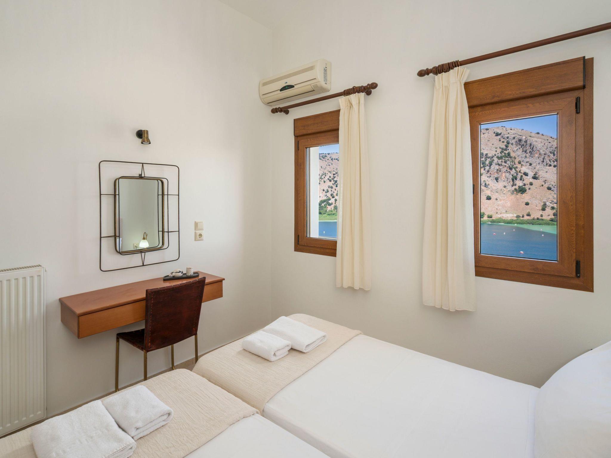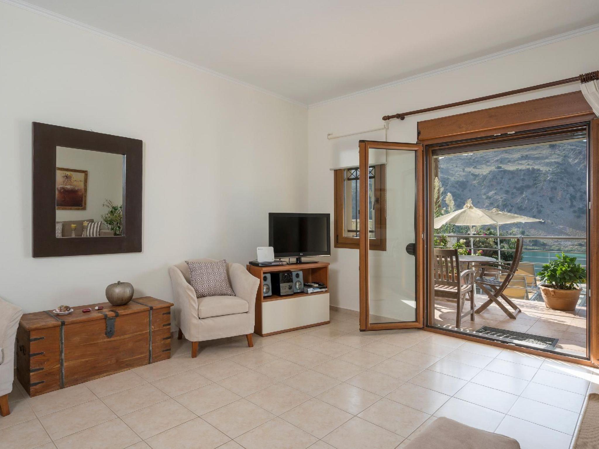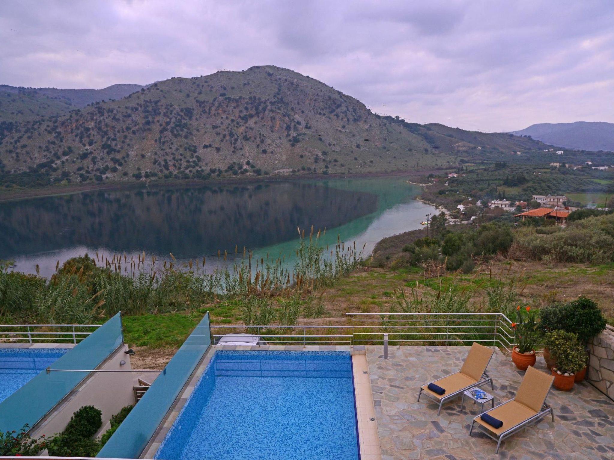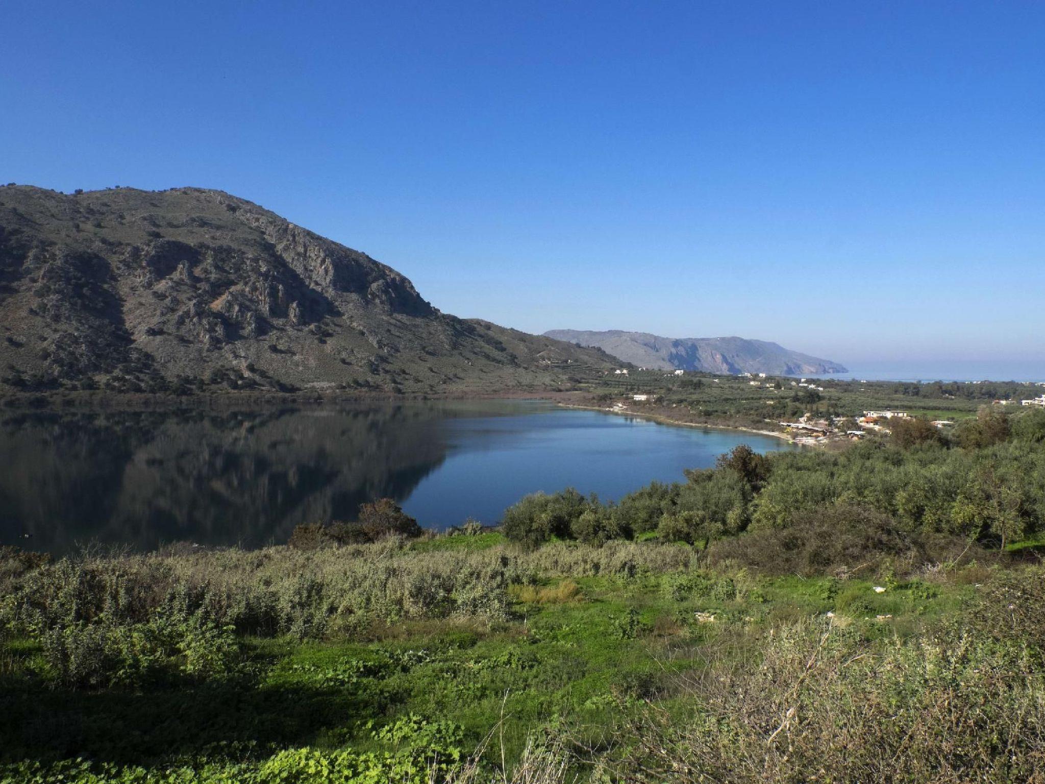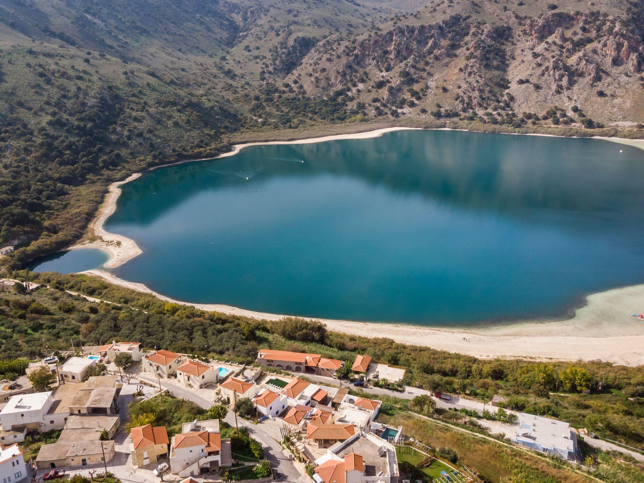 Apokoronas is one of the five former provinces of Chania prefecture and is situated at the northeast part of the prefecture. Kournas is one of the area’s traditional villages. The area of Apokoronas extends from the foothills of Lefka Ori north to the beach, with several gulfs, such the gulf of Almyros and Georgioupolis.Kournas Lake, 3 km from Georgioupolis, is the southern lake of whole Europe. It is created thanks to the underground water coming down from Lefka Ori and is trapped by the impervious rocks within the natural basin.Lake Kournas was known in antiquity as Lake Koressia. Its current name comes from the Arabic language and means bathtub and lake. The lake’s dark waters impress not only the visitors but also the natives, thus there is the belief that it is bottomless. The lake has some more legends and of course its own water nymph who appears on moonlit nights, combing her hair.The villas lie above Lake Kournas on the north end of Chania prefecture, almost in the middle between Chania (40 km to the east) and Rethymno (30 km to the west). From Kournas you can easily get to the highway (1000 m) and visit Chania, the Omalos plateau, the Samaria Gorge (79 km), Fragokastelo and other places in Chania prefecture, or drive west and visit Rethymno with the impressive castle or Heraklion and Knossos (105 km), an important town in the antiquity.There are daily departures from Piraeus to the port of Souda, only 45 km form the lake. You could also travel by aeroplane to Chania or Heraklion from Athens or most European cities.
