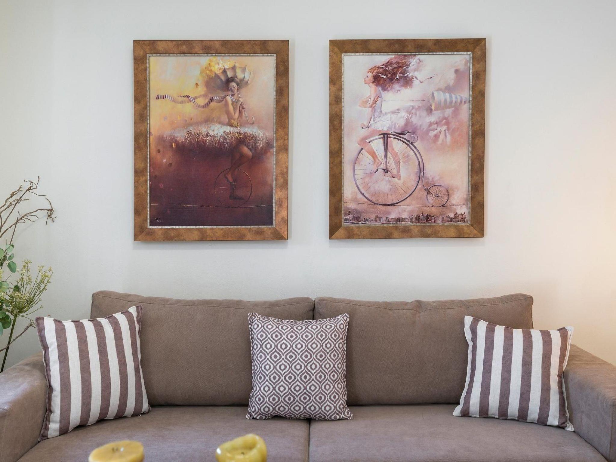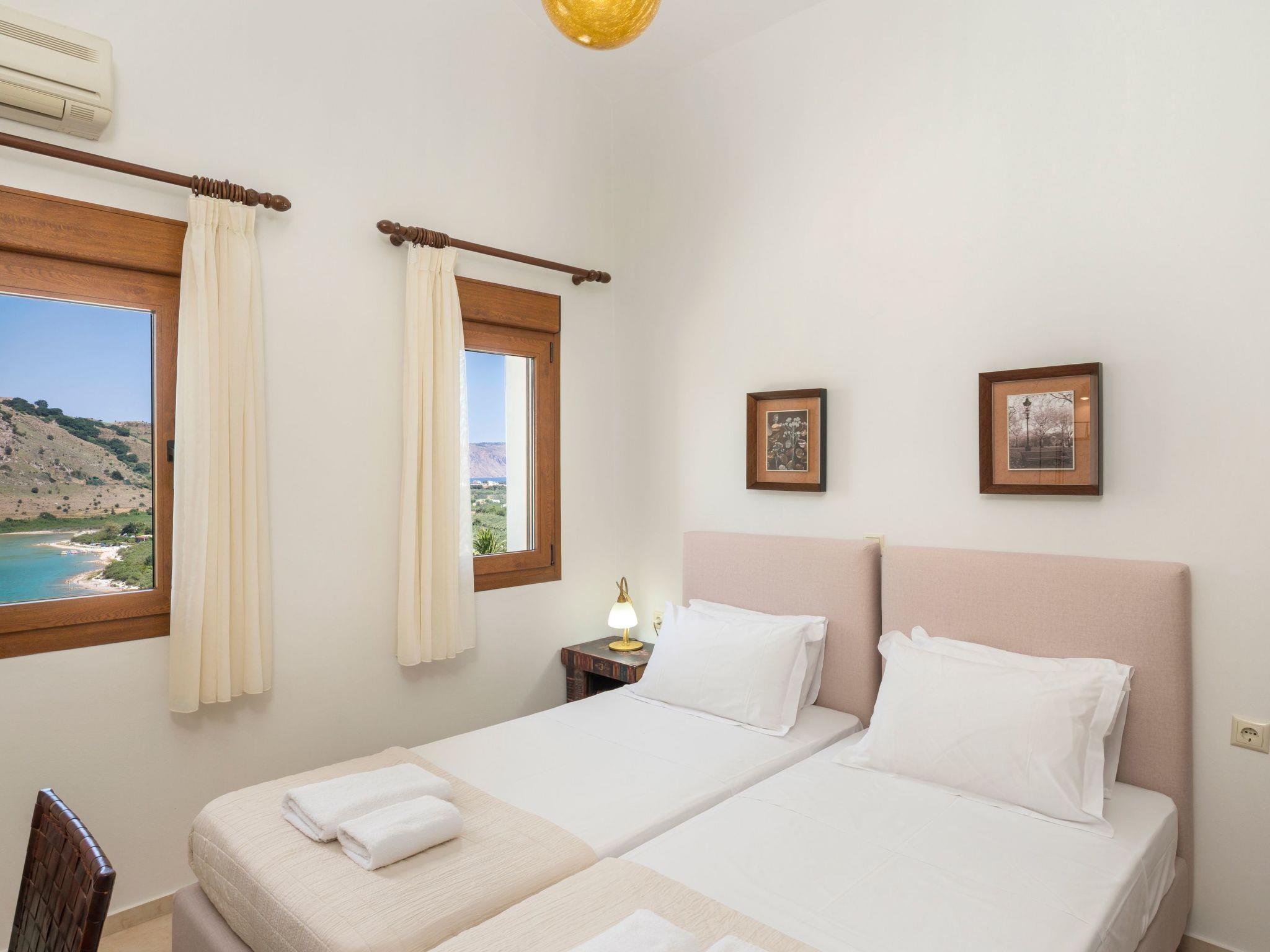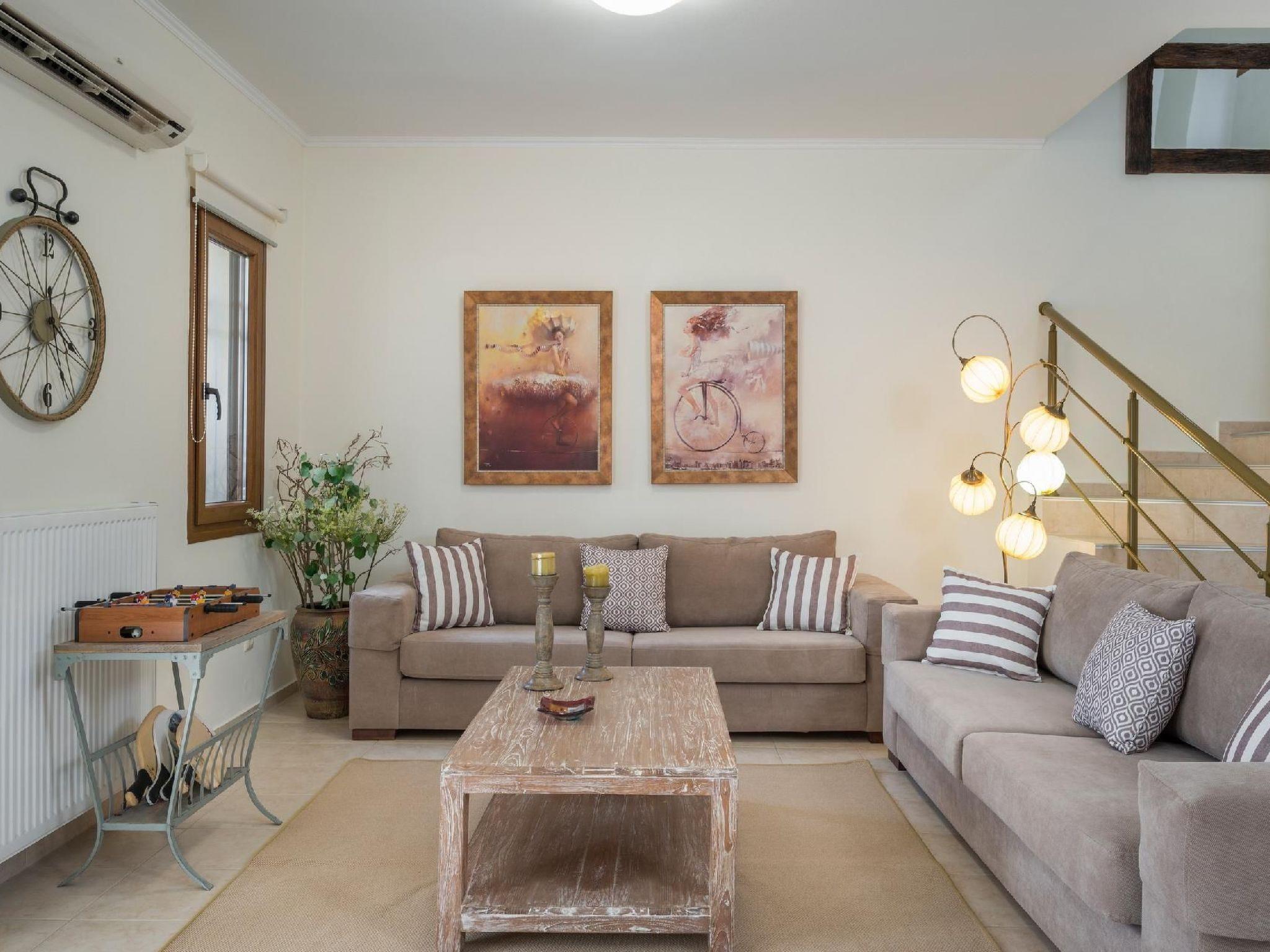 Family-Friendly Villa Bluefairy Dafni w/Pool, walk to Restaurants! 2 km to the Beach!These two unique villas are located in the most panoramic point of the region Kournas. They are built in a way that wherever you are you can enjoy the unique view of the lake and the White Mountains, also with a magnificent backdrop to the deep bay of Georgioupolis and the deep blue of the Cretan Sea. As they are situated in the heart of Apokoronas, just outside the traditional village Kournas, the villas are the ideal starting point for all kinds of tours around the area. Explore the lake and the Cretan nature, visit Crete’s north and south coast, admire the island’s tradition and culture and enjoy its hospitality. Check out is 11:00 latest and check in is 15:00 earliest. Check in and check out can be made without a person-to-person contact (upon request) As you walk in each one of the 120sqm villas, the living room along with a fully equipped kitchen and a dining table is situated there for you. Two Sofas that can turn into beds, a High Definition TV and a WC can be found also on the ground floor. Walking up the stairs and heading up to the second floor, 2 bedrooms with one double bed and one with two single beds can be found. The ideal location in the hilly area of Apokoronas, but only 3 km from the beaches of Georgioupolis, amidst mountains, lakes and the sea, allows you for short walks and longer excursions to experience the Cretan nature and our people.Terrace with garden furniture and sunshade /own balcony/barbecue pool / swimming pool for private use outdoor sitting area parking possibilitiesProperty is detached and fenced