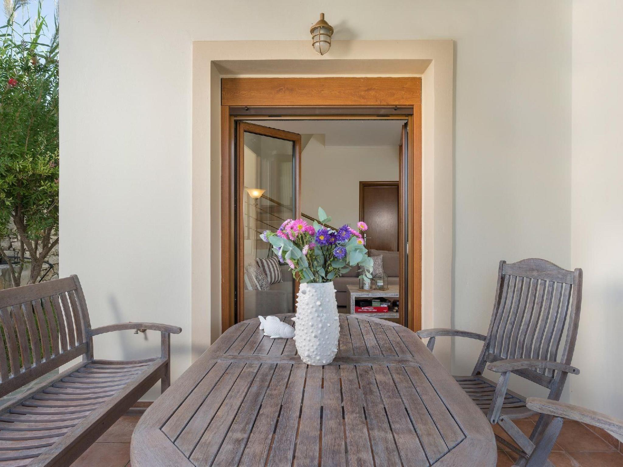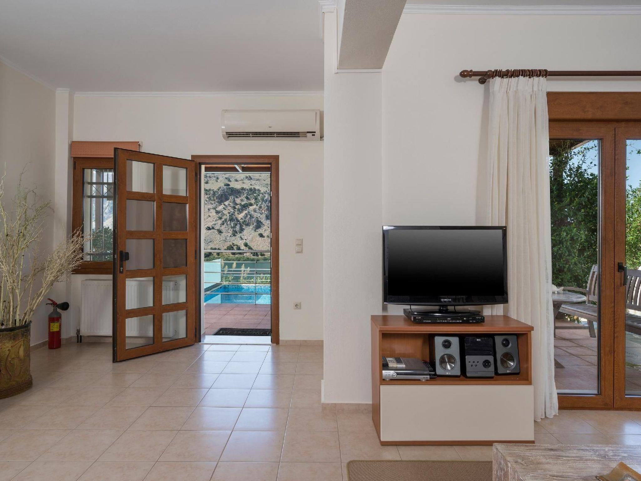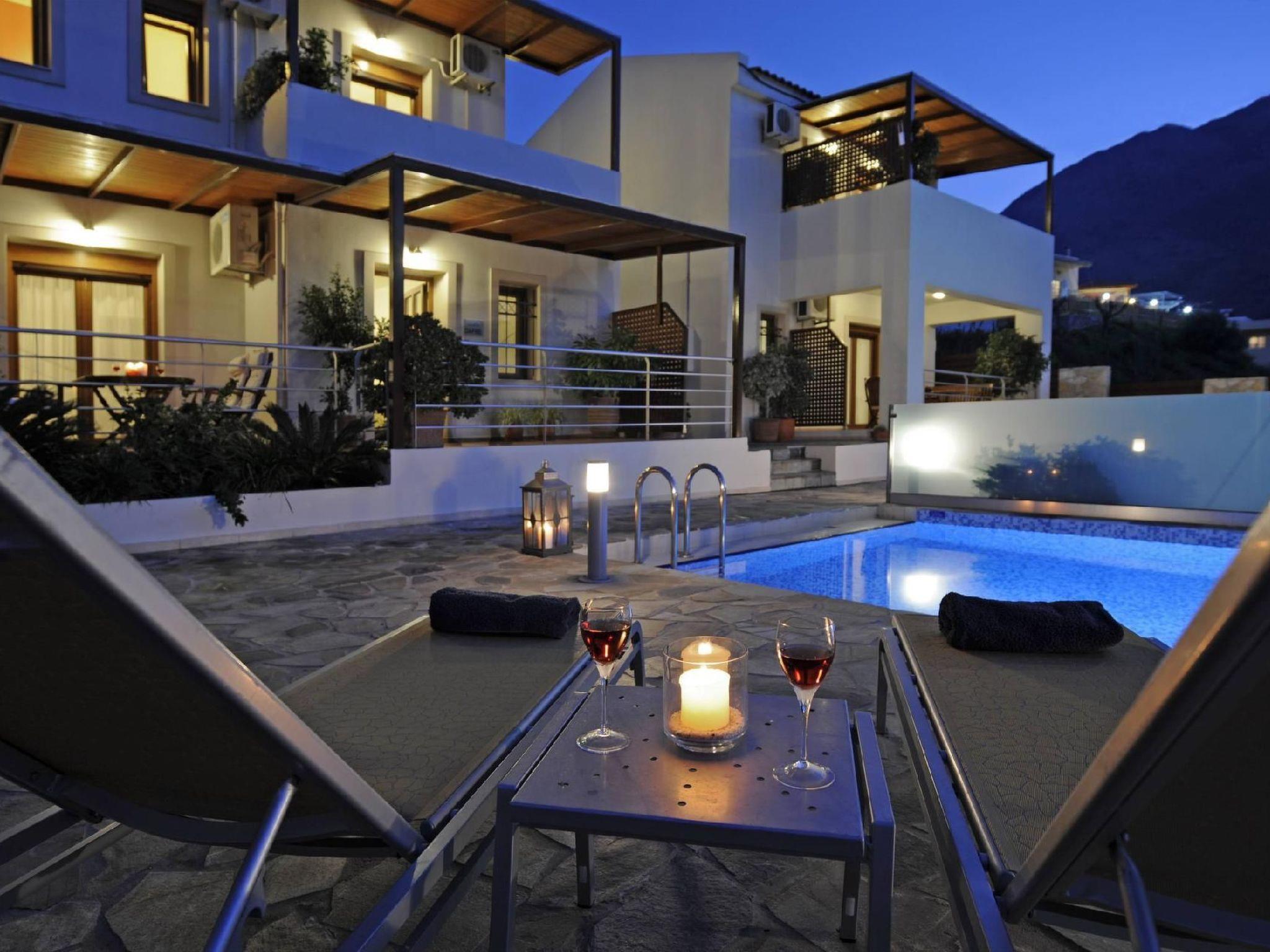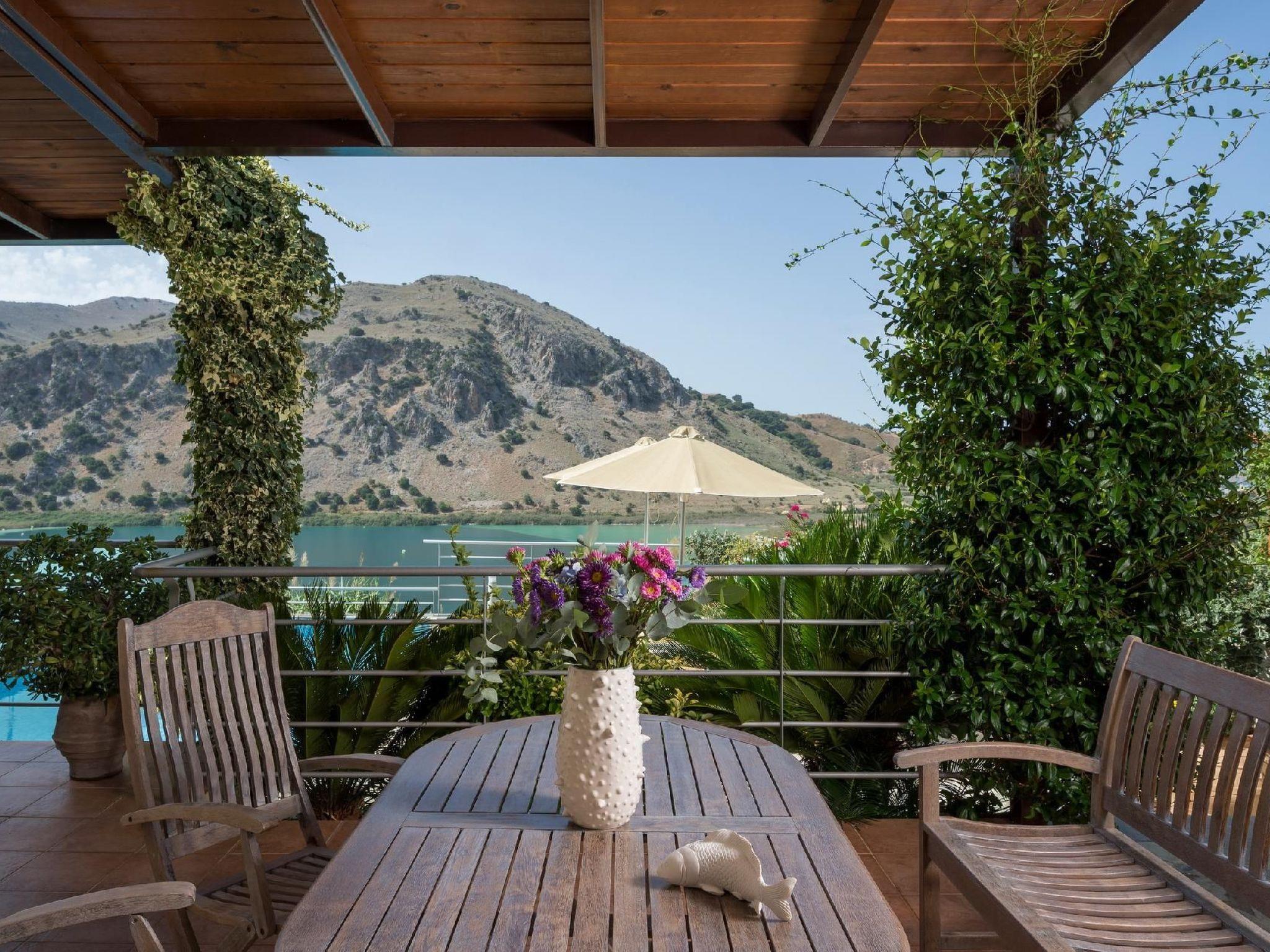 Family-Friendly Villa Bluefairy w/Pool, walk to Restaurants! 2 km to the Beach!These two unique villas are located in the most panoramic point of the region Kournas. They are built in a way that wherever you are you can enjoy the unique view of the lake and the White Mountains, also with a magnificent backdrop to the deep bay of Georgioupolis and the deep blue of the Cretan Sea. As they are situated in the heart of Apokoronas, just outside the traditional village Kournas, the villas are the ideal starting point for all kinds of tours around the area. Explore the lake and the Cretan nature, visit Crete’s north and south coast, admire the island’s tradition and culture and enjoy its hospitality. Check out is 11:00 latest and check in is 15:00 earliest. Check in and check out can be made without a person to person contact (upon request) As you walk in each one of the 120sqm villas, the living room along with a fully equipped kitchen and a dining table is situated there for you. Two Sofas that can turn into beds, a High Definition TV and a WC can be found also on the ground floor. Walking up the stairs and heading up to the second floor, 2 bedrooms with one double bed and one with two single beds can be found. The ideal location in the hilly area of Apokoronas, but only 3 km from the beaches of Georgioupolis, amidst mountains, lakes and the sea, allows you for short walks and longer excursions to experience the Cretan nature and our people.Apokoronas is one of the five former provinces of Chania prefecture and is situated at the northeast part of the prefecture. Kournas is one of the area’s traditional villages. The area of Apokoronas extends from the foothills of Lefka Ori north to the beach, with several gulfs, such the gulf of Almyros and Georgioupolis.Kournas Lake, 3 km from Georgioupolis, is the southern lake of whole Europe. It was created thanks to the underground water coming down from Lefka Ori which is trapped by the impervious rocks within the natural basin.Terrace with garden furniture and sunshade /own balcony/barbecuePool / swimming pool for private useOutdoor sitting areaParking possibilitiesProperty is detached and fenced
