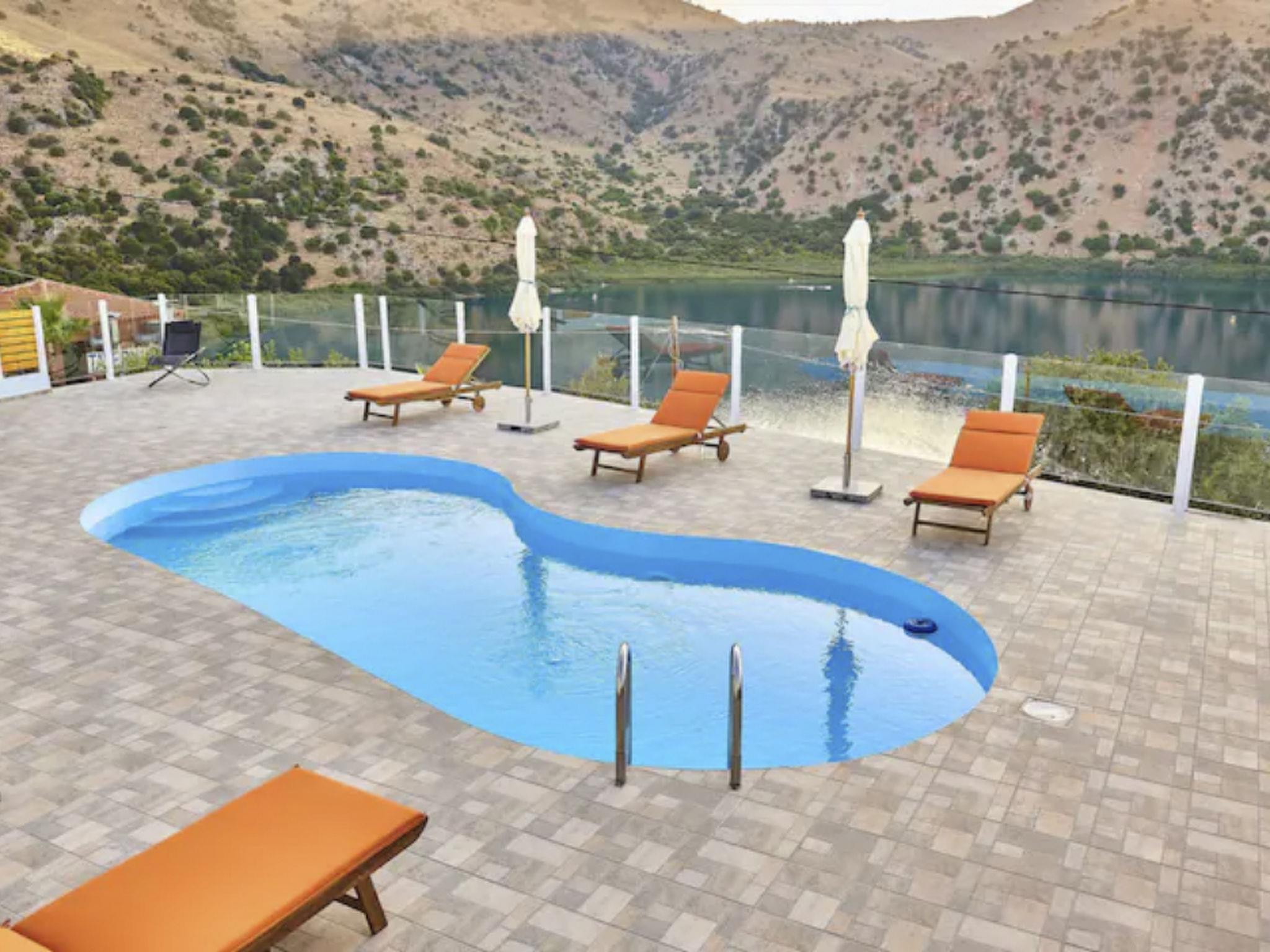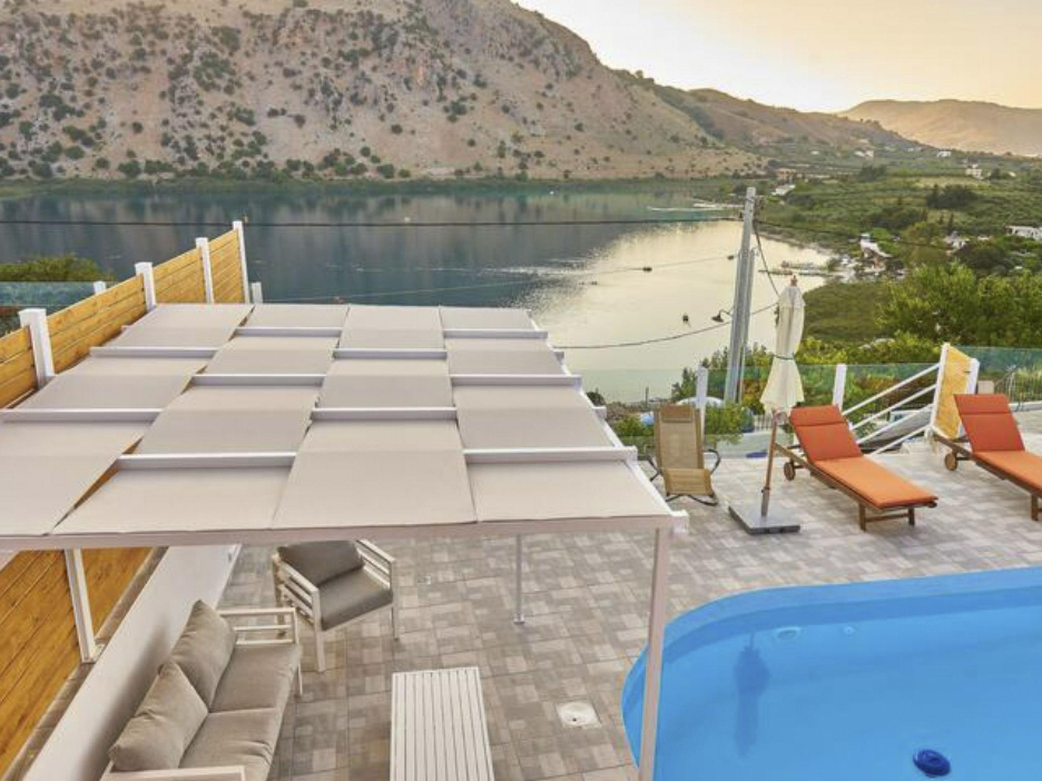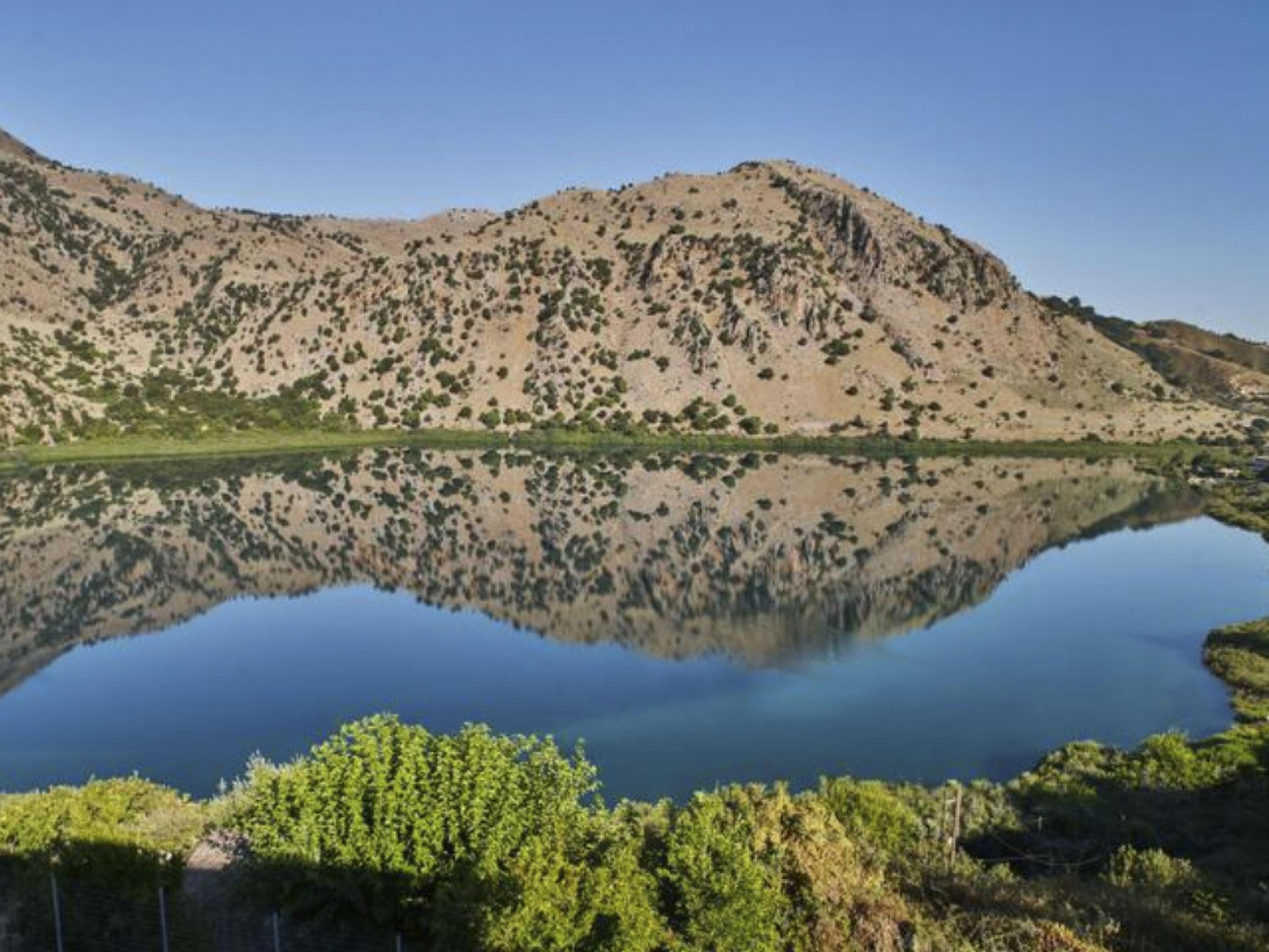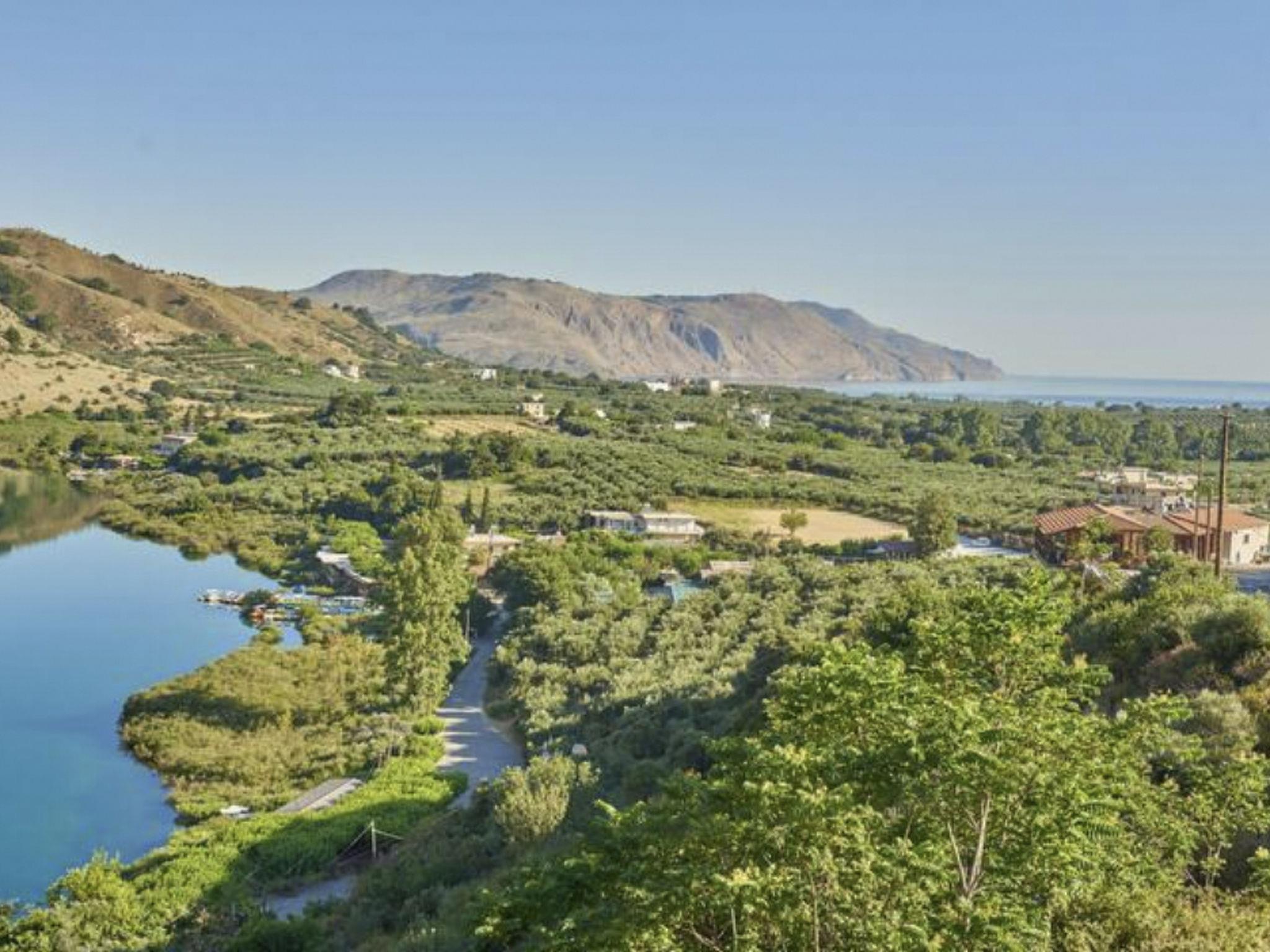 The villa is located by Lake Kournas, a unique freshwater lake in Crete, and is within driving distance of other notable destinations.