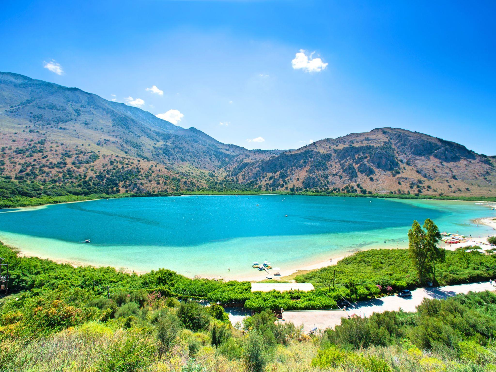Kournas Lake is the only freshwater lake in Crete. Lake Kournas was known as Lake Koressia in antiquity but later took its current name from the Arabic word for lake. The lake is in a beautiful landscape, lying in a valley among the hills, about 4 km from Georgioupolis in Chania Prefecture (west Crete). Lake Kournas is relatively small, with a maximum length of 1,087 m and a maximum breadth of 880 m. It covers an area of 579,000 sq. m. and is generally shallow, 22.5 m at its deepest point, while it lies approximately 20 m above sea level. Kournas lake with the sea near Georgioupoli in the background Kournas Lake is the ideal place for an afternoon walk or a daytrip nearby. Many people like to have an afternoon picnic there. The landscape is lovely and relaxing, whether you want to go for a walk in the countryside, swim or ride a pedalo on the lake. There are two springs on the southeast bank, one of which, the Mati or Amati (“eye”) as the locals call it, is visible in late summer. The lake is fed by streams from the nearby mountains and hills, whose underground courses are interrupted by the local bedrock on the way to the sea.