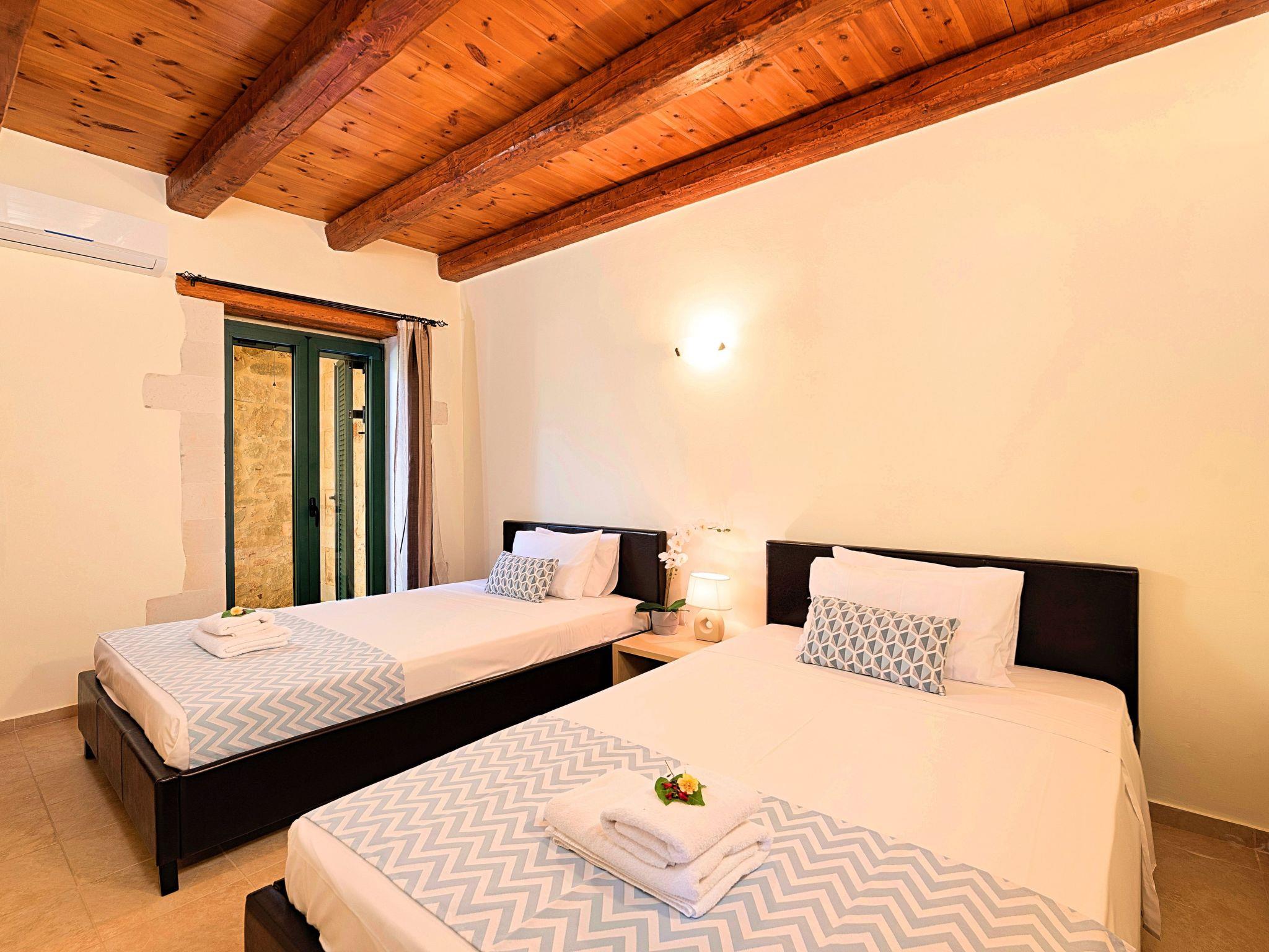 Facilities:Ground floor* A spacious living room with direct access to the terraces and the pool area.* Kitchen with an oven, a dishwasher, a fridge, a coffee maker, tea facilities, a juicer, a toaster, a dish set and a deep freezer* Dining area for 8-10 persons* A bedroom with two single beds ( can easily be pushed together) and air-condition.* Bathroom with shower* Terrace with outdoor seating / dining area and unlimited views* TV at the Living Room* Spacious Garden with outdoor furnitures and sunbeds* Large swimming poolA staircase leads to theUpper floor* A Large bedroom with a Queen size double bed, air-condition.* A Large bedroom with two single beds (pushed together), air-condition.* A large bathroom with bathtub and washing machine.* A Large terrace with sitting areaLower floor* A kitchenette area with TV set* A bedroom with two large single beds, air-condition * A second bedroom with a Queen size double bed, air-condition.* A bathroom with shower and a hairdryer.* Free Wi-Fi internet access* Outdoor Dinning Set (table with chairs)* Washing machine* An iron and an ironing board* Safe deposit box* Hair dryers* Fine linens and towels* Toiletries* Pool towels* Baby cot (two)* High chair (two)* Towels / bed linen, Cleaning- Every 3 or 4 days* Solar system for hot water* Fire extinguisher* First Aid Box* Parking area * BBQ with dining area