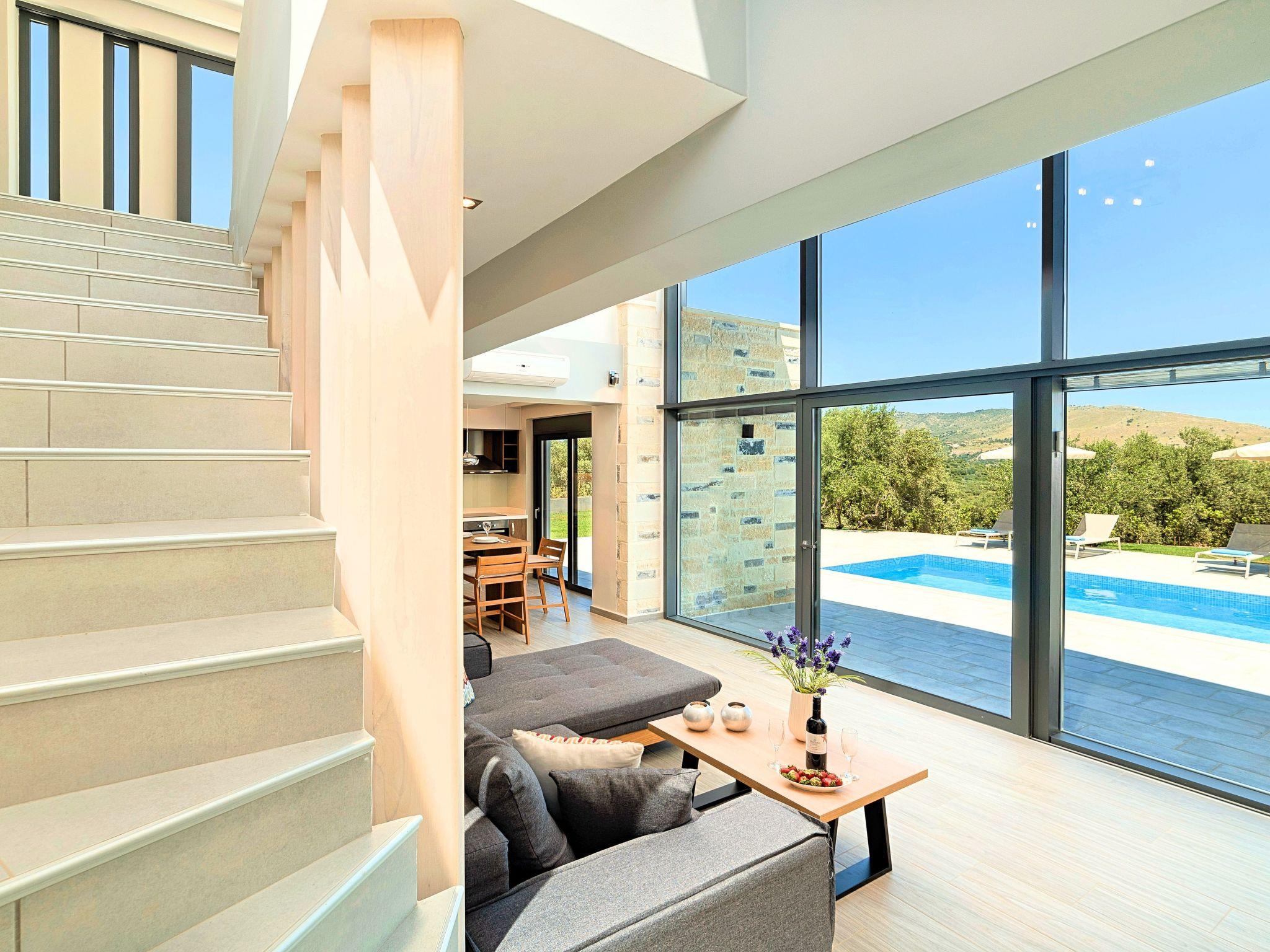 Each of the three villas offers:Facilities:Ground floor* A spacious living room with direct access to the terraces and the pool area.* Kitchen with an oven, a dishwasher, a fridge, a coffee maker, tea facilities, a juicer, a toaster, a dish set and a deep freezer* Dining area for 6 persons* A bedroom with a Queen size double bed, air-condition* Bathroom with shower* Terrace with outdoor seating / dining area and unlimited views* Smart TV at the Living Room* Spacious Garden with outdoor furnitures and sunbeds* Large swimming poolA staircase leads to theUpper floor - Loft* A Large Loft bedroom with two single beds (pushed together), air-condition and large terrace.* A large bathroom with shower and a hairdryer.Lower floor* A large living room with three sofa beds, TV set, In a closet washing/dryer machine.* An independent sitting area with two sofa beds* A bedroom with twin push together beds, air-condition with private bathroom with shower.* A second bedroom with a Queen size double bed, a sofa bed, air-condition.* A large bathroom with shower and a hairdryer.* Air-condition in all areas* Free Wi-Fi internet access* Outdoor Dinning Set (table with chairs)* Washing / Dryer machine* An iron and an ironing board* Safe deposit box* Hair dryers* Fine linens and towels* Toiletries* Pool towels* Baby cot (two)* High chair* Towels / bed linen, Cleaning- Every 3 or 4 days* Solar system for hot water* Fire extinguisher* First Aid Box