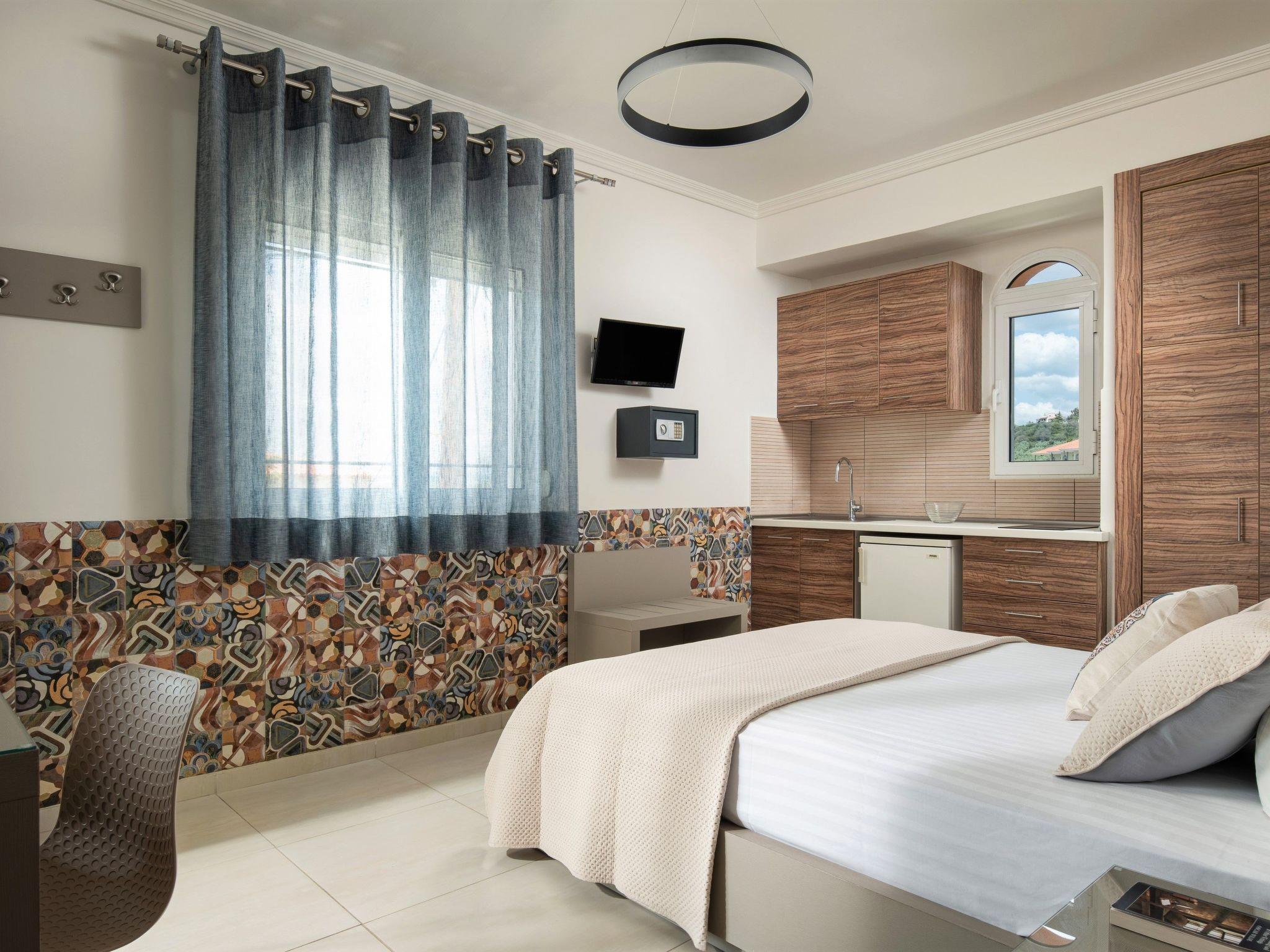 The studio includes one bedroom with a big double bed (King size) with a specially anatomic mattress with the possibility of fitting also a baby’s playpen. In the same area there are an equipped kitchenette with all necessary cooking utensils, a fridge, electric hot-plates for cooking, a 22? LCD TV set, air-conditioning(A/C), wifi, a safe box, a modern bathroom and a balcony with panoramic sea view.