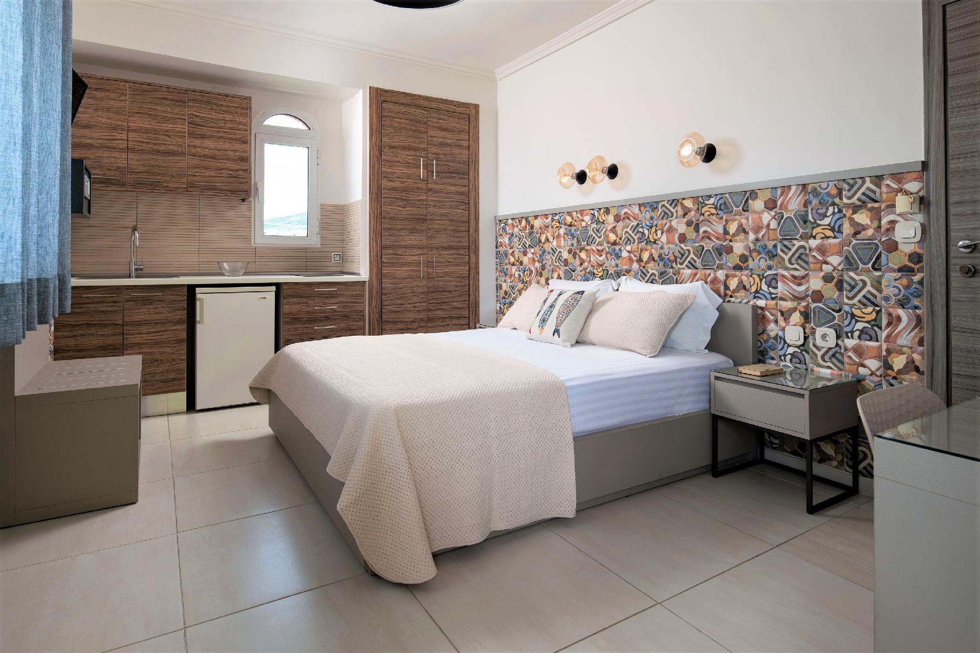The studio includes one bedroom with a big double bed (King size) with a specially anatomic mattress with the possibility of fitting also a baby’s playpen. In the same area there are an equipped kitchenette with all necessary cooking utensils, a fridge, electric hot-plates for cooking, a 22? LCD TV set, air-conditioning(A/C), wifi, a safe box, a modern bathroom and a balcony with panoramic sea view.