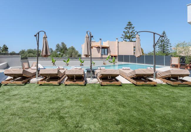 Welcome to the Ouranos Villa, a spacious and fully equipped retreat designed for comfort and relaxation. Nestled in the serene rural area of Gerani, this villa offers the perfect blend of modern amenities and natural beauty, making it an ideal destination for families or groups of up to 13 guests. With a total area of 181 square meters, the villa is thoughtfully laid out to ensure privacy and convenience across its two floors, complemented by a delightful pool house and extensive outdoor spaces.