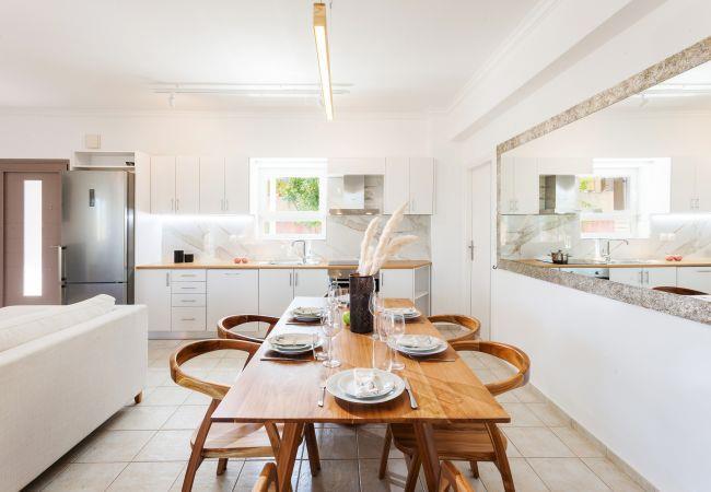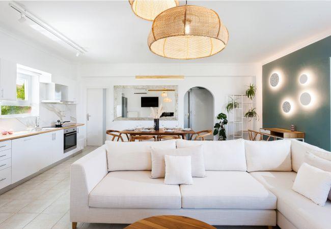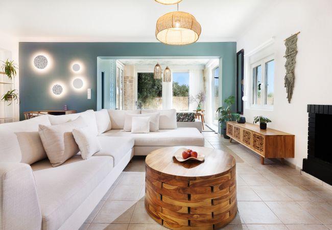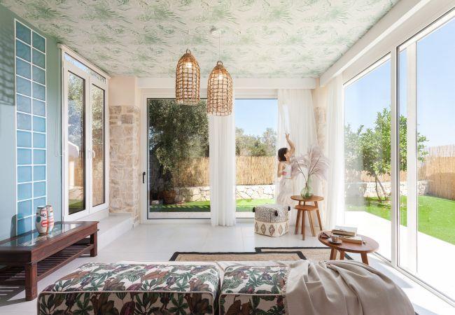 Villa Excecio has three elegantly decorated bedrooms for total relaxation. There is one bedroom with a double bed and two more bedrooms with two single beds each. All rooms are equipped with wardrobes, a mirror, and air conditioning, and have direct access to the outside area. Guests will find in the living room a fireplace and comfortable sofas, a 42-inch smart TV, a comfortable dining room for six people, and a fully equipped kitchen with all electrical appliances and all the necessary items for preparing and serving your meals.