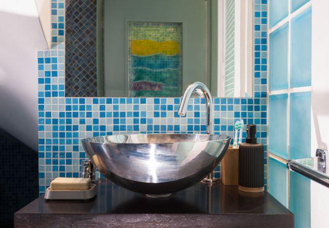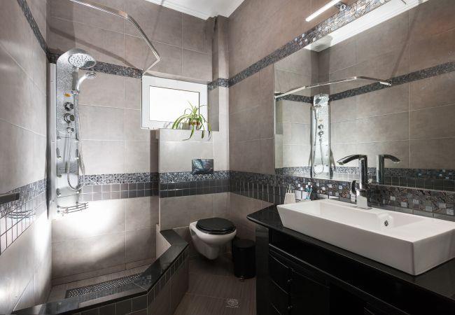 Villa Excecio has two bathrooms, one with a bathtub and washing machine, and the other with a shower.