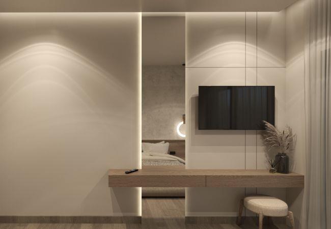 Upon entering the upper floor, guests are greeted by a spacious open-plan living area with a refined contemporary design. The fully equipped modern kitchen connects seamlessly to the stylish living room, featuring a 55-inch smart TV for your entertainment.This level also hosts two elegant bedrooms with king-size beds, one of which includes an en-suite bathroom, along with a separate shared shower/WC.Descending via the internal staircase, the lower level offers a more intimate ambiance with three beautifully appointed double bedrooms, two of them with en-suite shower/wc , ensuring privacy and comfort for all guests.